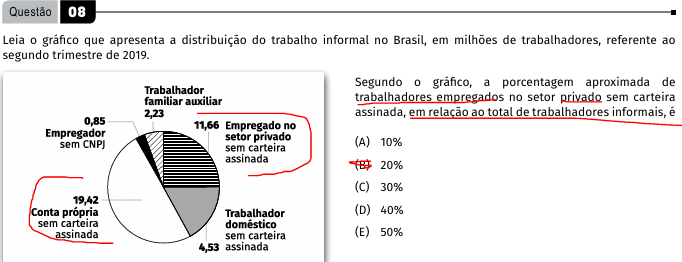Questão 08 Leia gráfico que apresenta a distribuição do trabalho informal no Brasil, em milhões de trabalhadores, referente ao segundo trimestre de Segundo gráfico, a porcentagem aproximada de Trabalhador familiar auxiliar trabalhadores empregados no setor privado sem carteira 2,23 assinada, em relação ao total de trabalhadores informais, é 0,85 11,66 Empregado no Empregador setor privado sem CNPJ sem carteira (A) 10% assinada (B) 20% 30% 19,42 Conta própria Trabalhador (D) 40% sem carteira doméstico assinada sem carteira (E) 50% 4,53 assinada