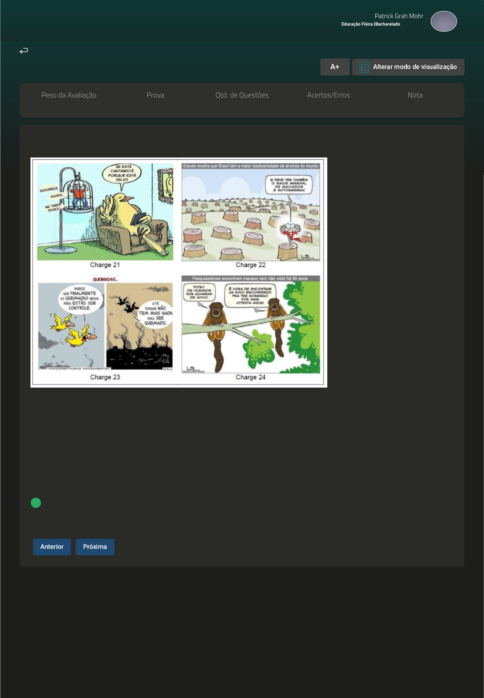 GABARITO | Avaliação I - Individual (Cod.:1024048) Peso da Avaliação 2,00 Prova 97613560 Qtd. de Questões 10 Acertos/Erros 10/0 Nota 10,00 Questão 4 Observe as charges a seguir: As questões vinculadas à conscientização ambiental e ao comportamento ecológico do ser humano são imprescindíveis em todo e qualquer cenário de convivência, visto que, os princípios de conservação e preservação dos recursos naturais são de suma importância para a sobrevivência da espécie humana. Com base no exposto, assinale a alternativa CORRETA: Fonte da imagem: SILVA, A. B. et al. Charges com temática ambiental: um recurso didático para um ensino de ciências crítico. Revista Educação Ambiental, v. 20, n. 78, 2022. A A evolução industrial trouxe consigo uma educação para a conservação da natureza. B A era digital melhorou o comportamento ambiental nos diferentes cenários da vida. C A educação ecológica visa a mudança de comportamento sob o meio ambiente. D Poluição e degradação da natureza são comportamentos atuais na sociedade. VOLTAR A+ Alterar modo de visualização Anterior Próxima Patrick Grah Mohr Educação Física (Bacharelado) (7323969)