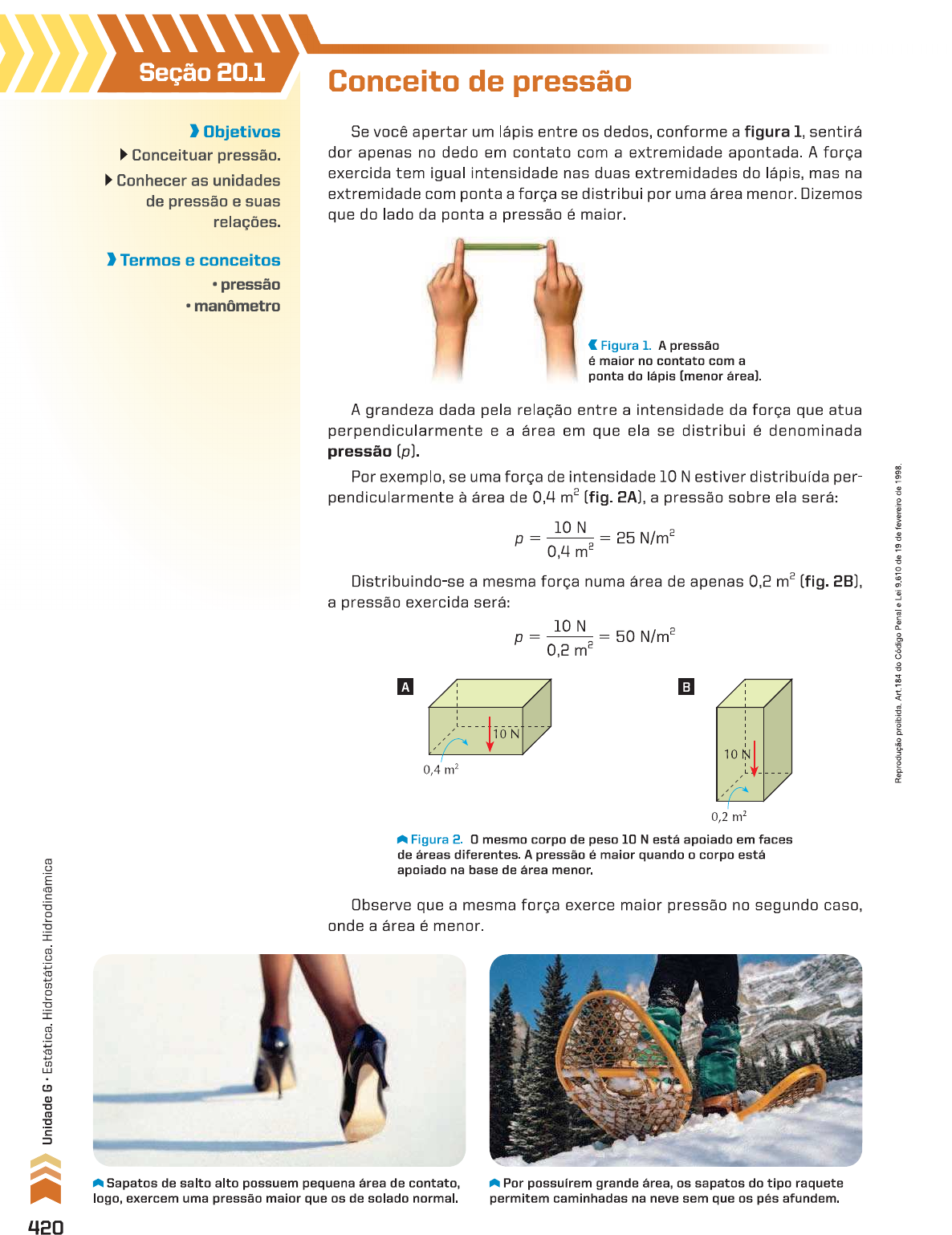 Seção 20.1 Conceito de pressão > Objetivos Se você apertar um lápis entre os dedos, conforme a figura sentirá Conceituar pressão. dor apenas no dedo em contato com a extremidade apontada. A força Conhecer as unidades exercida tem igual intensidade nas duas extremidades do lápis, mas na de pressão e suas extremidade com ponta a força se distribui por uma área menor. Dizemos relações. que do lado da ponta a pressão é maior Termos e conceitos pressão manômetro Figura 1. A pressão é maior no contato com a ponta do lápis (menor A grandeza dada pela relação entre a intensidade da força que atua perpendicularmente e a área em que ela se distribui é denominada pressão (p). Por exemplo, se uma força de intensidade 10 N estiver distribuída per- pendicularmente à área de 0,4 (fig. 2A), a pressão sobre ela será: de de de Distribuindo-se a mesma força numa área de apenas 0,2 (fig. 2B), a pressão exercida será: 10 N = = 50 do A B 10 N 10 Figura 2. mesmo corpo de peso 10 N está apoiado em faces de áreas diferentes. A pressão é maior quando o corpo está apoiado na base de área menor. Observe que a mesma força exerce maior pressão no segundo caso, onde a área é menor. Sapatos de salto alto possuem pequena área de contato, Por possuírem grande área, os sapatos do tipo raquete logo, exercem uma pressão maior que os de solado normal. permitem caminhadas na neve sem que os pés afundem. 420Assim, sendo F a intensidade da resultante das forças distribuídas perpendicularmente em uma superfície de área A, a pressão p é dada pela relação: F A A unidade de pressão no Sistema Internacional de Unidades (SI) é newton por metro quadrado também denominada pascal (Pa). Eventualmente são usadas as unidades dina por centímetro quadrado e bar. As relações entre essas unidades são: Pa Os aparelhos que medem pressão são denominados manômetros. 70 80 90 60 100 50 110 40 120 30 130 20 psi 140 10 150 160 A pressão que a patinadora exerce sobre o gelo é Os manômetros dos postos de serviço medem a grande, pois é pequena a área da lâmina dos patins. pressão dos pneus dos carros na unidade prática (libra-força por polegada quadrada), também chamada psi. A escavadeira consegue se num terreno lamacento porque suas esteiras exercem menor pressão do que um veículo de rodas de mesmo peso. A ponta afilada do prego garante elevada pressão, facilitando sua penetração na madeira. 421EXERCÍCIOS RESOLVIDOS R. 190 Uma força de intensidade 2 N é aplicada perpendicularmente a uma superfície por meio de um pino de 1 de área. Determine a pressão, em que o pino exerce sobre a superfície. Solução: Como a pressão é pedida em a área da superfície deve ser expressa em Assim: Sendo F = 2 N, a pressão é dada por: Resposta: R. 191 Um tijolo tem dimensões 5 cm 10 cm cm e massa 200 g. Determine as pressões, expressas em que ele pode exercer quando apoiado sobre uma superfície horizontal. Adote g = 10 Solução: tijolo exerce sobre a superfície horizontal uma pressão devida ao seu peso: P = mg. Sendo m = = 0,2 kg, vem: 2 N Como o tijolo possui três faces sobre as quais pode ser apoiado, ele pode exercer três pressões diferentes: de de A3 = 5 cm : de A, 5 cm 10 cm 20 cm do Resposta: P1 = EXERCÍCIOS PROPOSTOS P. 497 A cápsula de um toca-discos tem 2 g de massa e a ponta da agulha apresenta área igual a 10-6 Determine a pressão que a agulha exerce sobre o disco, expressa em Adote, para a aceleração da gravidade, o valor g P. 498 (Faap-SP) Uma banqueta de três pernas pesa 50 newtons e cada perna tem seção reta de área 5 Subindo nela uma pessoa de peso 700 newtons, qual será a pressão que cada perna exercerá no chão? P.499 Um paralelepípedo de massa 5 kg tem 2 m de comprimento, 0,5 m de largura e 0,2 m de altura. Sendo g = determine as pressões que esse paralelepípedo pode exercer quando apoiado sobre uma superfície horizontal. 422Seção 20.2 Conceito de massa específica e densidade Objetivos Considere uma amostra de certa substância A Diferenciar massa cuja massa seja m e cujo volume seja V (fig. 3A). m específica de densidade. Define-se a massa específica da substância Conhecer as unidades pela relação: V de massa específica e suas relações. m V Termos e conceitos B massa específica Considere agora um corpo, homogêneo ou m densidade não, de massa m e volume V (fig. 3B). A densi- corpo e dade d do corpo é dada pela relação: V homogêneo = m Figura 3. de Se o corpo é e homogêneo, a sua densidade (d) coincide com a massa específica (u) do material que o constitui. de de Assim, por exemplo, um cubo e homogêneo de alumínio, cuja massa específica é 2,7 terá densidade igual a 2,7 Se cubo de alumínio for sua densidade será menor que 2,7 isto é, menor que a massa específica do alumínio. Para os líquidos, considerados sempre homogêneos, não é necessário do fazer a distinção entre densidade e massa específica. A tabela seguinte fornece valores de massa específica para alguns materiais. Sólidos Líquidos Alumínio 2,7 Álcool 0,79 Ferro 7,9 Benzeno 0,90 Chumbo 11,3 Mercúrio 13,6 Platina 21,5 Água g/cm³ As unidades de densidade ou massa específica correspondem sempre à relação entre unidade de massa e unidade de volume. As unidades mais usadas são e kg/l. Por exemplo, a densidade da água, à temperatura de nessas unidades, vale: Em resumo: = 423EXERCÍCIOS RESOLVIDOS R. 192 Um objeto feito de ouro maciço tem 500 g de massa e 25 de volume. Determine a densidade do objeto e a massa específica do ouro em e Solução: Como se trata de um objeto homogêneo e maciço de ouro, sua densidade coincide com o valor da massa específica da substância que o constitui. Sendo m = 500 g e V = vem: Como kg Resposta: = Observação: de A unidade é mil vezes menor que a unidade Por isso, o número que expressa a densidade em mil vezes maior que o número que expressa a densidade em Então, para converter uma densid
