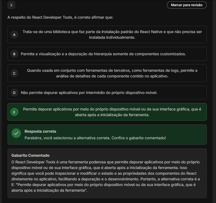 3 Marcar para revisão A respeito do React Developer Tools, é correto afirmar que: Trata-se de uma biblioteca que faz parte da instalação padrão do React Native e que não precisa ser A instalada individualmente. B Permite a visualização e a depuração da hierarquia somente de componentes customizados. Quando usada em conjunto com ferramentas de terceiros, como ferramentas de logs, permite a C análise de detalhes de cada componente contido no aplicativo. D Não permite depurar aplicativos por intermédio do próprio dispositivo móvel. Permite depurar aplicativos por meio do próprio dispositivo móvel ou de sua interface gráfica, que é E aberta após a inicialização da ferramenta. Resposta correta Parabéns, você selecionou a alternativa correta. Confira gabarito comentado! Gabarito Comentado React Developer Tools é uma ferramenta poderosa que permite depurar aplicativos por meio do próprio dispositivo móvel ou de sua interface gráfica, que é aberta após a inicialização da ferramenta. Isso significa que você pode inspecionar e modificar estado e as propriedades dos componentes do React diretamente no aplicativo, facilitando a depuração e desenvolvimento. Portanto, a alternativa correta é a E: "Permite depurar aplicativos por meio do próprio dispositivo móvel ou de sua interface gráfica, que é aberta após a inicialização da ferramenta".