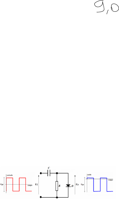 NOMES: AMANDA CASSIOLATO BARALDI RA: 140498 MARCUS WINICIUS DE OLIVEIRA RA: 141645 ROGER NUNES DO NASCIMENTO RA: 141421 TURMA: LA1PEN3/9438 DATA DA EXPERIÊNCIA: 31/08/2015 DATA DA ENTREGA: 14/09/2015 3 CIRCUITOS GRAMPEADORES E MULTIPLICADORES DE TENSÃO 3.1 OBJETIVOS Verificar a ação dos circuitos grampeadores e multiplicadores de tensão. 3.2 INTRODUÇÃO Circuitos grampeadores são circuitos com diodos e capacitores que têm por função fixar um novo valor médio à tensão de saída sem, contudo alterar o valor pico a pico da tensão da entrada. Os circuitos multiplicadores de tensão utilizam grampeadores de tensão para se obter tensões contínuas de valores elevados. A tensão de entrada é multiplicada pelo número de grampeadores existentes no circuito, podendo assim obter-se elevadas tensões de saída. 3.2.1 Análise Do Grampeador O circuito da figura 3.1 é um circuito grampeador negativo de tensão. Figura 3.1 - Circuito grampeador negativo de tensão Considerando o diodo ideal, verifica-se que durante o semiciclo positivo da tensão de entrada, conduz, pois se comporta como uma chave fechada. Com o diodo conduzindo o capacitor carrega-se de tal modo que a tensão entre seus terminais atinge o valor máximo da tensão de entrada, durante o semiciclo positivo. A tensão de saída nessa condição será igual à zero. Invertendo subitamente a polaridade da tensão de entrada, o diodo fica reversamente polarizado, comportando-se como chave aberta. Como o capacitor carregou-se durante o semiciclo anterior, a tensão entre seus terminais é somada a tensão da fonte. VVoVoVV 20 O sinal negativo resulta do fato da polaridade de 2V ser oposta a polaridade definida para O V a partir da referência. A forma de onda resultante na saída aparece na figura acima com o sinal de entrada. O sinal de saída é grampeado em 0V para o intervalo de 0 à 2 T , mas mantém a mesma tensão pico à pico total (2V), como na entrada. Fazendo com que a constante de tempo do circuito CR. seja elevada, não há condições do capacitor perder de modo significativo sua carga. Deve-se impor ao projeto, para que o grampeador funcione com garantia uma condição de: CR T ..5 2 ou seja: a frequência do sinal de entrada deve ser tal que não haja condição do capacitor descarregar-se. Caso a condição acima não seja respeitada, o grampeador não funcionará corretamente deformando o sinal de saída como mostrado na figura 3.2. Figura 3.2 - Grampeador com sinal de saída deformado 3.2.2 Análise Do Multiplicador De Tensão Valores elevados de tensão contínua podem ser produzidos por este tipo de circuito, visto na figura 3.3. Figura 3.3 - Circuito multiplicador de tensão No primeiro semiciclo negativo da tensão de entrada, 1D conduz e carrega 1C que atinge Vmáx . No semiciclo positivo 1D estará cortado, mas 2D conduzirá e carregará 2C que atingirá Vmáx.2 . No próximo semiciclo negativo 3D conduzirá. A tensão em 2C carregará 3C que atingirá Vmáx.2 . Em sequência, no próximo semiciclo positivo 2D e 4D conduzirão e 3C carregará 4C , que atingirá Vmáx.2 . Se mais circuitos com diodos e capacitores são incluídos, cada capacitor atingirá Vmáx.2 . 3.3 PROCEDIMENTO EXPERIMENTAL 3.3.1 Materiais Necessários 1 multilab; 1 osciloscópio de dois canais; 2 pontas de prova; 1 placa experimental nº1; 2 cabos de ligação banana-bananinha; 1 gerador de funções. 3.3.2 Circuito grampeador 1-Monte o circuito grampeador visto na figura 3.4, conectando J12 e J13 a saída do gerador de funções do multilab. Figura 3.4 - Layout grampeador da placa experimental nº1 2-Ajuste o gerador para fornecer um sinal de onda quadrada com amplitude de 5Vpp e frequência de aproximadamente 1kHz. 3-Observe a tensão de saída conectando a ponta de prova do canal 2 do osciloscópio com o tempo ligado ao ponto J14. O ponto J15 deverá ser a referência do osciloscópio. 4-Conecte a ponta de prova do canal 1 ao ponto J12. O acoplamento do osciloscópio ao circuito deve ser CC. 5-Com o tempo do osciloscópio ligado, observe, meça e copie as formas de onda de entrada e saída. Figura 3.5 – Formas de onda de entrada e saída 6- Diminua a frequência aproximadamente de 100Hz em 100Hz até o valor mínimo de 10Hz observando sempre o que ocorre com a tensão de saída. 3.3.3 Circuito multiplicador de tensão 1-Monte o circuito do multiplicador de tensão descrito na figura 3.5, conectando aos pontos J16 e J17 a fonte CA ajustável do multilab, ajustada em 12 volts eficazes (RMS). Figura 3.6 - Layout multiplicador da placa experimental nº1 2-Observe a tensão em cada ponto: A=J16, B=J18, C=J20, D=J21 e E=J22 com o osciloscópio com o tempo ligado, utilizando a ponta de prova do canal 1. O modo de acoplamento do osciloscópio deverá ser CC. A referência do instrumento deverá ser conectada ao ponto J17. 3-Anote as formas de onda da tensão de saída e seus valores máximos. Figura 3.7 – Tensão no ponto A (J16) Figura 3.8 – Tensão no ponto B (J18) Figura 3.9 – Tensão no ponto C (J20) Figura 3.10 – Tensão no ponto D (J21) Figura 3.11 – Tensão no ponto E (J22) 3.3.4 Responda as questões a) Explique como é possível minimizar a distorção do sinal de saída do circuito grampeador caso isso ocorra. O tempo da mudança de polaridade da tensão senoidal de entrada deve ser muito menor do que a estabilização do circuito. Ou seja, aumentando os valores do resistor e do capacitor do circuito grampeador, ou, aumentando o valor da frequência da tensão de entrada. b) Por que não é possível realizar a multiplicação da tensão aplicando tensão constante na entrada do circuito multiplicador? Isso não é possível porque os circuitos multiplicadores de tensão dependem de um processo de retificação e filtragem com diodos e capacitores, e para que isso ocorra a tensão de entrada deverá ser alternada. Luiz Fernando Vieira Luiz Fernando Vieira pois com tensão constante os capacitores iriam carregar 