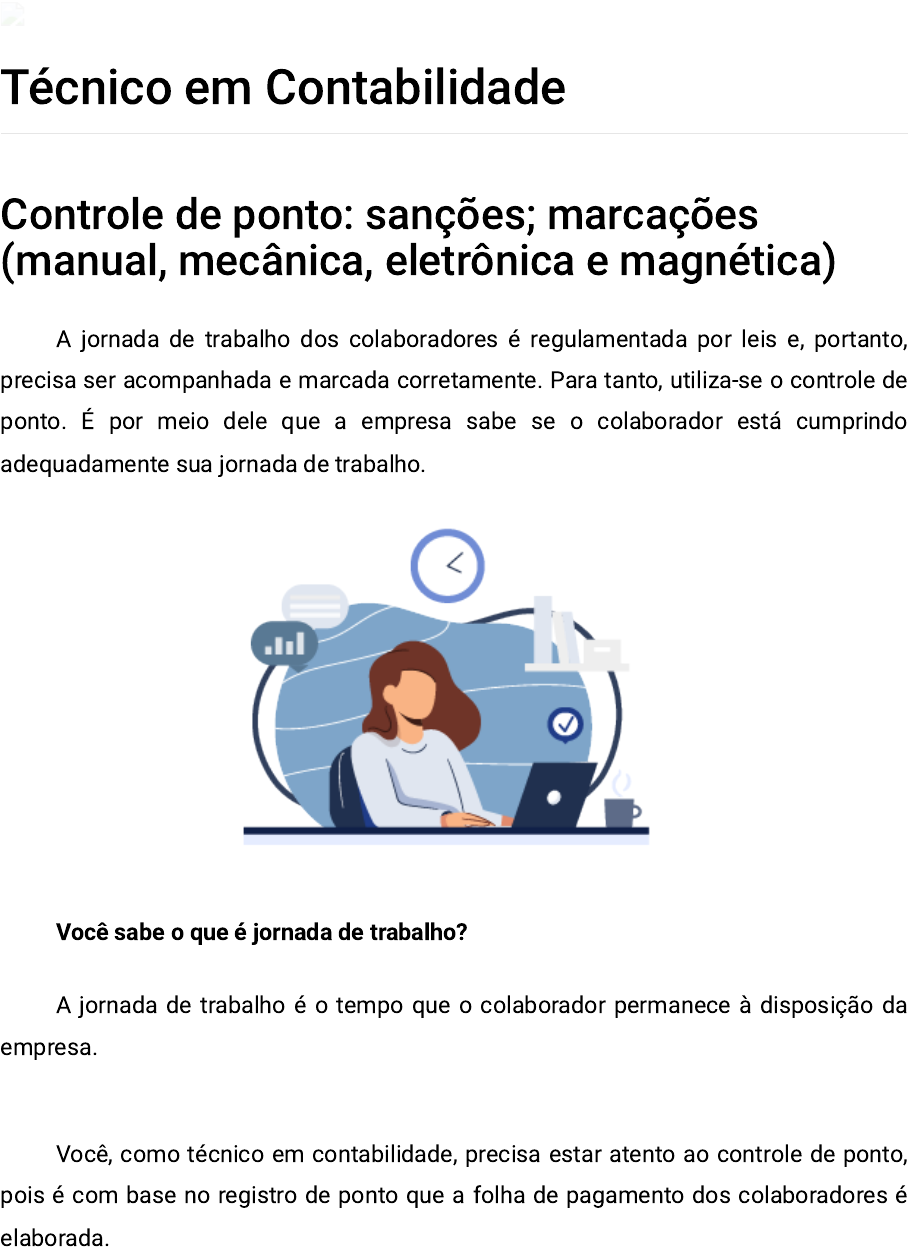 Técnico em Contabilidade Controle de ponto: sanções; marcações (manual, mecânica, eletrônica e magnética) A jornada de trabalho dos colaboradores é regulamentada por leis e, portanto, precisa ser acompanhada e marcada corretamente. Para tanto, utiliza-se o controle de ponto. É por meio dele que a empresa sabe se o colaborador está cumprindo adequadamente sua jornada de trabalho. Você, como técnico em contabilidade, precisa estar atento ao controle de ponto, pois é com base no registro de ponto que a folha de pagamento dos colaboradores é elaborada. Você sabe o que é jornada de trabalho? A jornada de trabalho é o tempo que o colaborador permanece à disposição da empresa. O controle adequado do registro de ponto também evita que a empresa seja penalizada por causa de colaboradores que não cumprem a jornada de trabalho prevista em contrato. Esse controle deve refletir a realidade do trabalho. Por exemplo, no cartão de ponto devem constar os horários de entrada e saída dos colaboradores de uma empresa, incluindo os intervalos para alimentação. O cartão de ponto é a prova judicial da jornada de trabalho do colaborador. Com relação ao tipo de registro, ele pode ser manual, mecânico ou eletrônico e é obrigatório para empresas com mais de 20 colaboradores. Porém, nada impede que empresas com uma quantidade menor de funcionários façam tal registro como forma de organização. Conforme o artigo 74 da Consolidação das Leis do Trabalho (CLT), parágrafo 3.º, se o trabalho for executado fora do estabelecimento, o horário dos empregados constará do registro manual, mecânico ou eletrônico em seu poder (BRASIL, 1943). Também é possível que o controle de ponto seja feito por exceção à jornada de trabalho, ou seja, serão feitos registros somente dos atrasos, das horas extras, das folgas, das férias e das faltas. No entanto, tais registros somente são permitidos quando existe acordo individual por escrito, convenção coletiva ou acordo coletivo de trabalho. Ainda segundo a CLT, no artigo 62, todos os colaboradores devem realizar os registros de entrada e saída no cartão de ponto, com exceção dos seguintes casos: I - os empregados que exercem atividade externa incompatível com a fixação de horário de trabalho, devendo tal condição ser anotada na Carteira de Trabalho e Previdência Social e no registro de empregados; (Incluído pela Lei nº 8.966, de 27.12.1994) II - os gerentes, assim considerados os exercentes de cargos de gestão, aos quais se equiparam, para efeito do disposto neste artigo, os diretores e chefes de departamento ou filial (Incluído pela Lei nº 8.966, de 27.12.1994) III - os empregados em regime de teletrabalho (Incluído pela Lei nº 13.467, de 2017) (BRASIL, 1943) O registro de ponto é útil tanto para o colaborador quanto para o empregador. Quando o colaborador necessita tomar alguma atitude envolvendo a Justiça do Trabalho, referente, por exemplo, a direitos devidos por horas extras, o controle de ponto é um instrumento fundamental, assim como quando o empregador deseja comprovar atrasos de colaboradores. Empresas que não contam com um controle de ponto adequado, caso tenham que comprovar algum fato relacionado com a jornada de trabalho dos colaboradores, terão grande dificuldade e precisarão encontrar outra forma de comprovar que o colaborador chegou atrasado, saiu mais cedo ou faltou. Imagine a situação a seguir: Percebeu como é importante o controle de ponto? Quando menos se espera, os registros se mostram necessários. Evolução do cartão de ponto O registro do ponto não é novidade. Ele surgiu há muito tempo e veio sofrendo alterações ao longo dos anos. No início, o controle de ponto era realizado utilizando um livro no qual eram registradas as entradas e as saídas dos colaboradores de uma empresa. Com o passar do tempo, foram surgindo as versões mecânicas e magnéticas, nas quais os registros eram feitos em um cartão de cartolina. O cartão de ponto foi evoluindo até chegar, atualmente, ao ponto digital. O registro de ponto realizado por meio de livro tem uma desvantagem: a facilidade de falsificação dos registros. Basta alterar uma anotação para ser caracterizada uma falsificação. Já nos demais modelos, é muito mais difícil forjar um registro. Estude agora, de forma mais detalhada, cada tipo de registro de ponto: Livro de ponto A imagem representa um livro aberto de registro de ponto, com linhas e colunas. Ao lado, há um livro de ponto fechado. Os colaboradores anotam manualmente no livro os horários em que entraram na empresa e em que saíram dela. Por ser mais econômico, as empresas que desejam reduzir gastos podem optar por utilizá-lo. Algumas empresas pequenas ainda preferem o registro manual em livros. Trata-se de uma forma de controle de ponto totalmente pautada na confiança, pois a empresa precisa confiar nos registros que os colaboradores fizeram. Ponto mecânico A imagem representa um equipamento de registro de ponto mecânico no qual uma mão está inserindo um cartão de cartolina. O controle de ponto mecânico é realizado por meio de um cartão de cartolina inserido pelo colaborador em um relógio que registra os horários de entrada e saída do colaborador de uma empresa. Ponto eletrônico A imagem representa um equipamento de registro de ponto eletrônico que contém um teclado para que o colaborador possa digitar os dados necessários para a realização do registro. O ponto eletrônico precisa ter um mostrador do relógio em tempo real, com hora(s), minuto(s) e segundo(s). É um equipamento que deve imprimir cada registro efetuado pelo colaborador, ou seja, toda vez que um colaborador registrar uma entrada ou uma saída, um comprovante será impresso. O relógio de ponto eletrônico deve ter uma porta USB (universal serial bus) externa, chamada de porta fiscal, com a finalidade de permitir o acesso pelo auditor fiscal do trabalho aos dados armazenados no equipa
