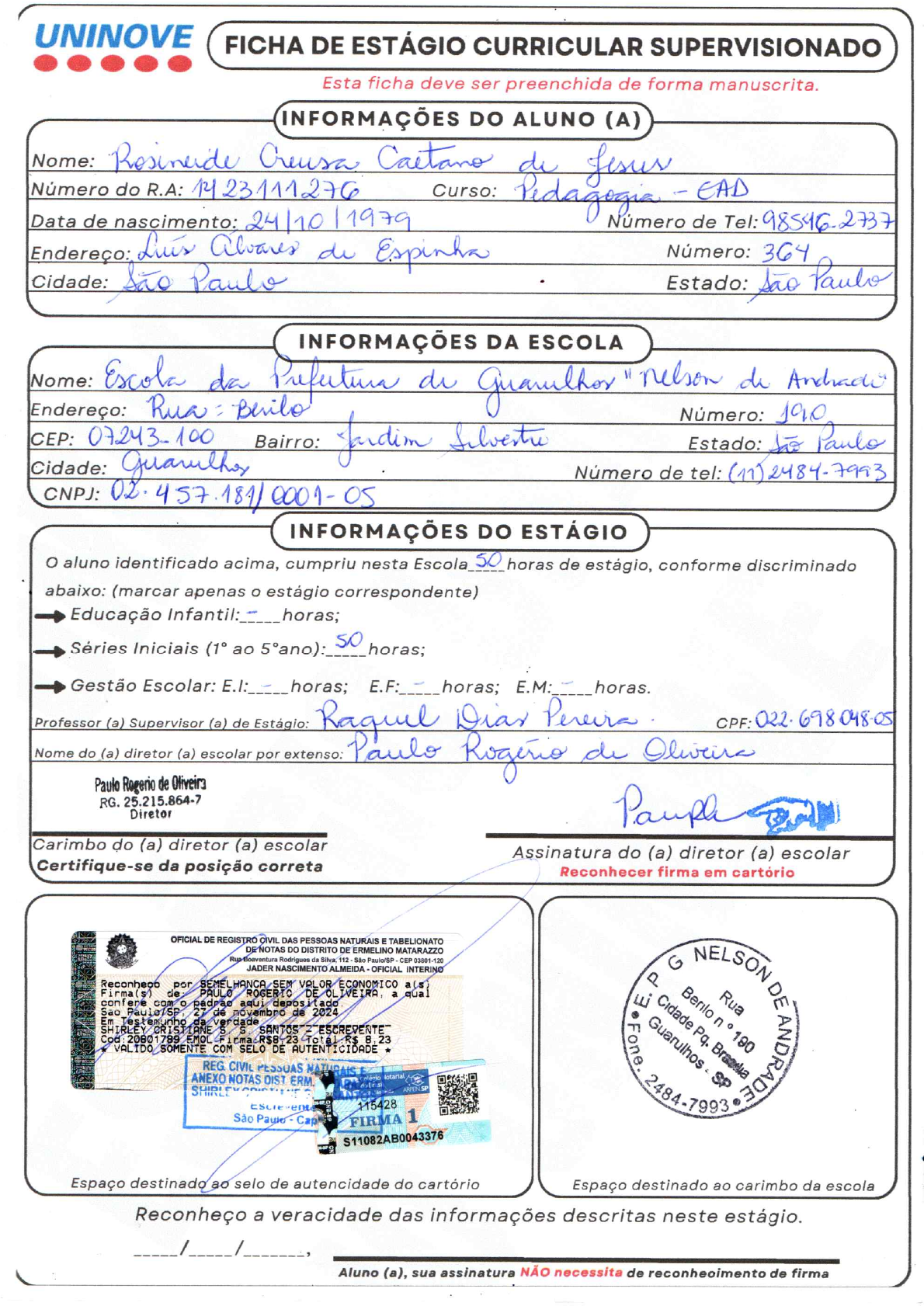 UNINOVE FICHA DE ESTÁGIO CURRICULAR SUPERVISIONADO Esta ficha deve ser preenchida de forma manuscrita. DO ALUNO (A) Nome: Caetano de Jesus Número do Data de nascimento: 24/10/1979 Curso: Pidagogia EAD Número de Tel: 98546-2737 Endereço: Luis Número: 364 Cidade: Paulo Estado: Paulo INFORMAÇÕES DA ESCOLA Nome: Escola da "nelson Endereço: Rua : Berilo Número: 190 CEP: 07243-100 Bairro: Estado: to Paulo Cidade: Número de tel: (11)2484-7993 CNPJ: INFORMAÇÕES DO ESTÁGIO aluno identificado acima, cumpriu nesta Escola 50 horas de estágio, conforme discriminado abaixo: (marcar apenas estágio correspondente) Educação Infantil: - horas; Séries Iniciais (1° ao so horas; Gestão Escolar: E.I: horas; E.F: horas; E.M: horas. Professor (a) Supervisor (a) de Estágio: Diar Pereira CPF: Nome do (a) diretor (a) escolar por extenso: Paulo Rogerio Paulo de RG. 25.215.864-7 Diretor Carimbo do (a) diretor (a) escolar Assinatura do (a) diretor (a) escolar Certifique-se da posição correta Reconhecer firma em cartório OFICIAL DE REGISTRO CIVIL DAS PESSOAS NATURAIS E TABELIONATO DO DISTRITO DE ERMELINO MATARAZZO Rua-Boaventura Rodrigues da Silva. 112 São Paulo/SP CEP 03801-120 JADER NASCIMENTO ALMEIDA OFICIAL INTERINO Reconheco por SEM VALOR ECONOMICO a(s Firma(s) de PAULO ROGERIC DE a qual confere Em Testemunho da padrao verdade aqui com depositado Sao 2024 27 de novembro de SHIRLEY CRISTIANE SANTOS Cod 20801789 EMOL irma R$8 23 Total R$ VALIDO SOMENTE COM SELO DE AUTENTICIDADE REG. CIVIL G Rua ANEXO NOTAS DIST ERM lotarial 115428 2484-7993 FIRMA 1 S11082AB0043376 Espaço destinado ao selo de autencidade do cartório Espaço destinado ao carimbo da escola Reconheço a veracidade das informações descritas neste estágio. / / , Aluno (a), sua assinatura NÃO necessita de reconheoimento de firmaUNINOVE FICHA DESCRITIVA Esta ficha deve ser preenchida de forma manuscrita. ANO/ CARGA TEMAS CONTEMPLADOS NA OBSERVAÇÃO Rubrica do DATA TURMA HORÁRIA (neste local você deve preencher apenas com o assunto / tema Orientador observado) 05hs 01/10/24 13:00 as 18:00 hs Texto e 02/10/24 05 13:00 as 18.00 e = OS hs as classes 03/10/24 13:00 as 18:00 hs ; de problems com e 04/10/24 05 3'ano 13:00 as 18:00 Textual I solo 05 hs 07/10/24 One 30 13:00 as esse? a propro 18:00 hs At 05 hs 08/10/21 Texto Terra, sobre Ambunti 13:00 as 18:00 hs de 09/10/24 exercicies ( do cafe de 05 hs geometrica = 10/10/21 13:00 hs as e percentaging M 11/10/24 sobre and 13:00 as 18.00 e ( 14/10/24 30 Obswacao Ditado de 13:00 as as 18200 gramaticais du probleman TOTAL DE HORAS NESTA FICHA 50 H Paulo Regerie de Oliveira RG. 25.215.864-7 Diretor Carimbo do (a) diretor (a) Assinatura do (a) diretor (a) Certifique-se da posição correta NÃO reconhecer firma em cartório