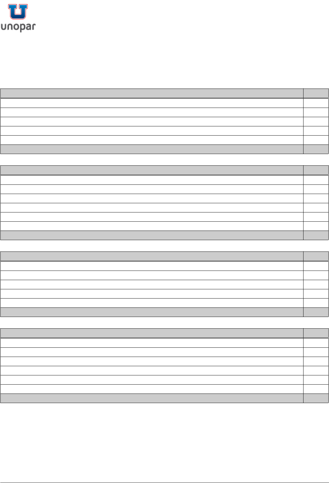 Pró-Reitoria Acadêmica - Secretaria Acadêmica Setorial EaD. NUTRIÇÃO Universidade Pitágoras Unopar Anhanguera Disciplina CH 1º SEMESTRE GESTÃO, QUALIDADE E SEGURANÇA DO PACIENTE 60 PENSAMENTO CIENTÍFICO 60 PSICOLOGIA APLICADA À SAÚDE 60 RESPONSABILIDADE SOCIAL E AMBIENTAL 60 SOCIEDADE BRASILEIRA E CIDADANIA 60 Total CH: 300 Disciplina CH 2º SEMESTRE CIÊNCIAS MORFOFUNCIONAIS DOS SISTEMAS DIGESTÓRIO, ENDÓCRINO E RENAL 60 CIÊNCIAS MORFOFUNCIONAIS DOS SISTEMAS NERVOSO E CARDIORRESPIRATÓRIO 60 CIÊNCIAS MORFOFUNCIONAIS DOS SISTEMAS TEGUMENTAR, LOCOMOTOR E REPRODUTOR 60 INTRODUÇÃO À BIOLOGIA CELULAR E DO DESENVOLVIMENTO 60 PROJETO DE EXTENSÃO I - NUTRIÇÃO 110 SAÚDE PÚBLICA 60 Total CH: 410 Disciplina CH 3º SEMESTRE BIOQUÍMICA APLICADA À SAÚDE 60 BROMATOLOGIA 60 CIÊNCIAS MORFOFUNCIONAIS DOS SISTEMAS IMUNE E HEMATOLÓGICO 60 NUTRIÇÃO, CIÊNCIA E PROFISSÃO 60 SEGURANÇA ALIMENTAR E NUTRICIONAL 60 Total CH: 300 Disciplina CH 4º SEMESTRE COMPOSIÇÃO DOS ALIMENTOS 60 HIGIENE E MICROBIOLOGIA DOS ALIMENTOS 60 PLANEJAMENTO E ORGANIZAÇÃO DE UNIDADE DE ALIMENTAÇÃO E NUTRIÇÃO 60 PROJETO DE EXTENSÃO II - NUTRIÇÃO 110 TECNOLOGIA DE ALIMENTOS 60 TÉCNICA DIETÉTICA 60 Total CH: 410 13/03/2025 20:49:01 Diretoria de Informática Página 1 Pró-Reitoria Acadêmica - Secretaria Acadêmica Setorial EaD. NUTRIÇÃO Universidade Pitágoras Unopar Anhanguera Disciplina CH 5º SEMESTRE AVALIAÇÃO NUTRICIONAL 60 AVALIAÇÃO NUTRICIONAL APLICADA 60 EDUCAÇÃO ALIMENTAR E NUTRICIONAL 60 EPIDEMIOLOGIA, POLÍTICAS E PROGRAMAS APLICADOS A SAÚDE E NUTRIÇÃO 60 FISIOPATOLOGIA E FARMACOLOGIA APLICADA À NUTRIÇÃO 60 GASTRONOMIA APLICADA A NUTRIÇÃO 60 Total CH: 360 Disciplina CH 6º SEMESTRE AVALIAÇÃO, CONTROLE E REGULAÇÃO NO SUS 60 GESTÃO DE UNIDADES DE ALIMENTAÇÃO E NUTRIÇÃO 60 NUTRIÇÃO E DIETOTERAPIA DO ADULTO E DO IDOSO 60 NUTRIÇÃO E DIETOTERAPIA OBSTÉTRICA E PEDIÁTRICA 60 PROJETO DE EXTENSÃO III - NUTRIÇÃO 100 TERAPIA NUTRICIONAL ENTERAL E PARENTERAL 60 Total CH: 400 Disciplina CH 7º SEMESTRE ASSISTÊNCIA NUTRICIONAL NA OBESIDADE, DOENÇAS CARDIOVASCULARES E ENDÓCRINAS 60 ASSISTÊNCIA NUTRICIONAL NAS DOENÇAS NEUROLÓGICAS E IMUNES 60 ASSISTÊNCIA NUTRICIONAL NAS PATOLOGIAS DO SISTEMA DIGESTÓRIO E ÓRGÃOS ANEXOS 60 ASSISTÊNCIA NUTRICIONAL PARA GRAVEMENTE ENFERMOS 60 ESTÁGIO SUPERVISIONADO EM ALIMENTAÇÃO COLETIVA 215 Total CH: 455 Disciplina CH 8º SEMESTRE ESTÁGIO SUPERVISIONADO EM NUTRIÇÃO CLÍNICA 215 ESTÁGIO SUPERVISIONADO EM NUTRIÇÃO E SAÚDE COLETIVA 215 NUTRIÇÃO EM ATIVIDADE FÍSICA 60 TRABALHO DE CONCLUSÃO DE CURSO - NUTRIÇÃO 40 Total CH: 530 13/03/2025 20:49:01 Diretoria de Informática Página 2