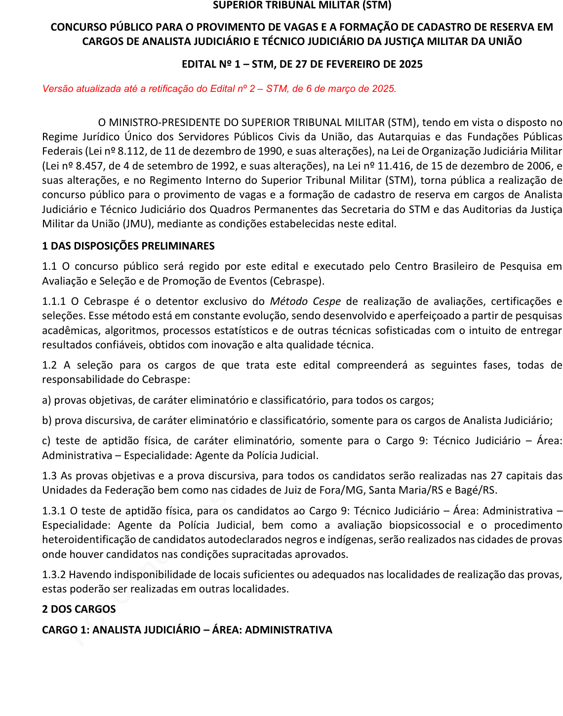 pcimarkpci MDAwMDowMDAwOjAwMDA6MDAwMDowMDAwOmZmZmY6YjNkZDpjODli:U3VuLCAyMyBNYXIgMjAyNSAwODoxNDo0OSAtMDMwMA== www.pciconcursos.com.br SUPERIOR TRIBUNAL MILITAR (STM) CONCURSO PÚBLICO PARA O PROVIMENTO DE VAGAS E A FORMAÇÃO DE CADASTRO DE RESERVA EM CARGOS DE ANALISTA JUDICIÁRIO E TÉCNICO JUDICIÁRIO DA JUSTIÇA MILITAR DA UNIÃO EDITAL Nº 1 – STM, DE 27 DE FEVEREIRO DE 2025 Versão atualizada até a retificação do Edital nº 2 – STM, de 6 de março de 2025. O MINISTRO‐PRESIDENTE DO SUPERIOR TRIBUNAL MILITAR (STM), tendo em vista o disposto no Regime Jurídico Único dos Servidores Públicos Civis da União, das Autarquias e das Fundações Públicas Federais (Lei nº 8.112, de 11 de dezembro de 1990, e suas alterações), na Lei de Organização Judiciária Militar (Lei nº 8.457, de 4 de setembro de 1992, e suas alterações), na Lei nº 11.416, de 15 de dezembro de 2006, e suas alterações, e no Regimento Interno do Superior Tribunal Militar (STM), torna pública a realização de concurso público para o provimento de vagas e a formação de cadastro de reserva em cargos de Analista Judiciário e Técnico Judiciário dos Quadros Permanentes das Secretaria do STM e das Auditorias da Justiça Militar da União (JMU), mediante as condições estabelecidas neste edital. 1 DAS DISPOSIÇÕES PRELIMINARES 1.1 O concurso público será regido por este edital e executado pelo Centro Brasileiro de Pesquisa em Avaliação e Seleção e de Promoção de Eventos (Cebraspe). 1.1.1 O Cebraspe é o detentor exclusivo do Método Cespe de realização de avaliações, certificações e seleções. Esse método está em constante evolução, sendo desenvolvido e aperfeiçoado a partir de pesquisas acadêmicas, algoritmos, processos estatísticos e de outras técnicas sofisticadas com o intuito de entregar resultados confiáveis, obtidos com inovação e alta qualidade técnica. 1.2 A seleção para os cargos de que trata este edital compreenderá as seguintes fases, todas de responsabilidade do Cebraspe: a) provas objetivas, de caráter eliminatório e classificatório, para todos os cargos; b) prova discursiva, de caráter eliminatório e classificatório, somente para os cargos de Analista Judiciário; c) teste de aptidão física, de caráter eliminatório, somente para o Cargo 9: Técnico Judiciário – Área: Administrativa – Especialidade: Agente da Polícia Judicial. 1.3 As provas objetivas e a prova discursiva, para todos os candidatos serão realizadas nas 27 capitais das Unidades da Federação bem como nas cidades de Juiz de Fora/MG, Santa Maria/RS e Bagé/RS. 1.3.1 O teste de aptidão física, para os candidatos ao Cargo 9: Técnico Judiciário – Área: Administrativa – Especialidade: Agente da Polícia Judicial, bem como a avaliação biopsicossocial e o procedimento heteroidentificação de candidatos autodeclarados negros e indígenas, serão realizados nas cidades de provas onde houver candidatos nas condições supracitadas aprovados. 1.3.2 Havendo indisponibilidade de locais suficientes ou adequados nas localidades de realização das provas, estas poderão ser realizadas em outras localidades. 2 DOS CARGOS CARGO 1: ANALISTA JUDICIÁRIO – ÁREA: ADMINISTRATIVA pcimarkpci MDAwMDowMDAwOjAwMDA6MDAwMDowMDAwOmZmZmY6YjNkZDpjODli:U3VuLCAyMyBNYXIgMjAyNSAwODoxNDo0OSAtMDMwMA== www.pciconcursos.com.br REQUISITO: diploma, devidamente registrado, de conclusão de curso de graduação de nível superior em qualquer área de formação, fornecido por instituição de ensino superior reconhecida pelo Ministério da Educação (MEC). DESCRIÇÃO SUMÁRIA DAS ATIVIDADES: atividades, de natureza técnica, relacionadas ao planejamento, coordenação, supervisão e execução de tarefas, envolvendo elaboração de pareceres, de informações, de relatórios, estudo e análise de documentos de natureza administrativa; pesquisa e seleção da legislação e da jurisprudência sobre matéria de natureza administrativa para fundamentar análise, conferência e instrução de processos na área de sua atuação; assistência técnica em questões que envolvam matéria de natureza administrativa, analisando, emitindo informações e pareceres; desenvolvimento de trabalhos de natureza técnica, relacionados à elaboração e implementação de planos, programas e projetos; elaboração e interpretação de fluxogramas, organogramas, esquemas, tabelas, gráficos e outros instrumentos; elaboração e atualização de normas e procedimentos; redação de documentos diversos; trabalhos que exijam conhecimentos básicos de informática, inclusive digitação; atendimento ao público interno e externo; conferência de documentos diversos; organização de documentos, utilizando técnicas e procedimentos apropriados; realização de atividades relacionadas à gestão estratégica de pessoas, de processos, de recursos materiais e patrimoniais, orçamentários e financeiros, licitações e contratos, controle interno e auditoria e desenvolvimento organizacional; quaisquer outras atividades inerentes à área de atuação. REMUNERAÇÃO: R$ 14.852,66. JORNADA DE TRABALHO: 40 horas semanais. CARGO 2: ANALISTA JUDICIÁRIO – ÁREA: APOIO ESPECIALIZADO – ESPECIALIDADE: ADMINISTRAÇÃO REQUISITO: diploma, devidamente registrado, de conclusão de curso de graduação de nível superior em Administração, fornecido por instituição de ensino superior reconhecida pelo MEC, e registro no Conselho Regional da categoria. DESCRIÇÃO SUMÁRIA DAS ATIVIDADES: atividades referentes à programação, supervisão, planejamento, coordenação, controle e execução relacionados a pesquisa, estudos, análises e projetos sobre gestão de pessoal, material e patrimônio, orçamento e finanças, organização e métodos e modernização administrativa; elaboração de projetos, pareceres, informações, relatórios, pesquisas de mercado e estudos da legislação; assistência técnica em questões que envolvam mat