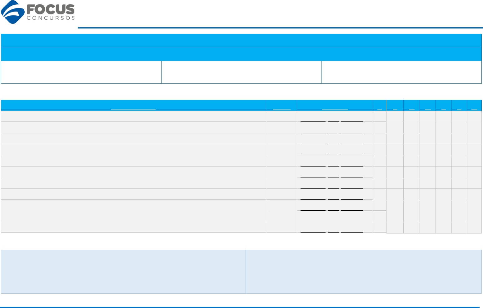 INSS | Técnico do Seguro Social | Edital 2022 Cronograma de Estudos | Método Focus de Aprovação INSS – INSTITUTO NACIONAL DO SEGURO SOCIAL TÉCNICO DO SEGURO SOCIAL Edital: nº 1 – INSS, de 12 de setembro de 2022 Banca: Cebraspe Nível: Ensino Médio Método de Prova: Cespe – Certo/Errado Total de Questões: 120 DISCIPLINA Peso Tempo S T Q Q S S D ____:___ até ___:___ ____:___ até ___:___ ____:___ até ___:___ ____:___ até ___:___ ____:___ até ___:___ ____:___ até ___:___ ____:___ até ___:___ ____:___ até ___:___ ____:___ até ___:___ ____:___ até ___:___ ____:___ até ___:___ Peso 1 = demais disciplinas Peso 2 = disciplinas com maior peso no edital. Maior nível de dificuldade. Primeira vez que irá estudar. – 2 horas Língua Portuguesa - Ética no Serviço Público - Regime Jurídico Único - Noções de Direito Constitucional - Noções de Direito Administrativo - Noções de Informática - Raciocínio Lógico - Seguridade Social www.focusconcursos.com.br | 1 INSS | Técnico do Seguro Social | Edital 2022 Cronograma de Estudos | Método Focus de Aprovação LÍNGUA PORTUGUESA Aprendizagem Questões de Concursos Revisão Vídeo PDF Podcasts Qtde Acertos Aproveitamento(%) Aula-PDF Questões 1 Compreensão e interpretação de textos. 2 Tipologia textual. ☐ ☐ ☐ _____% ☐ ☐ ☐ ☐ ☐ _____% ☐ ☐ 3 Ortografia oficial. 4 Acentuação gráfica. ☐ ☐ ☐ _____% ☐ ☐ ☐ ☐ ☐ _____% ☐ ☐ 5 Emprego das classes de palavras. 6 Emprego do sinal indicativo de crase. ☐ ☐ ☐ _____% ☐ ☐ ☐ ☐ ☐ _____% ☐ ☐ 7 Sintaxe da oração e do período. 8 Pontuação. ☐ ☐ ☐ _____% ☐ ☐ ☐ ☐ ☐ _____% ☐ ☐ 9 Concordância nominal e verbal. 10 Regências nominal e verbal. ☐ ☐ ☐ _____% ☐ ☐ ☐ ☐ ☐ _____% ☐ ☐ 11 Significação das palavras. 12 Redação de correspondências oficiais (conforme Manual de Redação da Presidência da República). ☐ ☐ ☐ _____% ☐ ☐ ☐ ☐ ☐ _____% ☐ ☐ ÉTICA NO SERVIÇO PÚBLICO Aprendizagem Questões de Concursos Revisão Vídeo PDF Podcasts Qtde Acertos Aproveitamento(%) Aula-PDF Questões 1 Código de Ética Profissional do Servidor Público Civil do Poder Executivo Federal: Decreto nº 1.171/1994 Decreto nº 6.029/2007. ☐ ☐ ☐ _____% ☐ ☐ ☐ ☐ ☐ _____% ☐ ☐ www.focusconcursos.com.br | 2 INSS | Técnico do Seguro Social | Edital 2022 Cronograma de Estudos | Método Focus de Aprovação REGIME JURÍDICO ÚNICO Aprendizagem Questões de Concursos Revisão Vídeo PDF Podcasts Qtde Acertos Aproveitamento(%) Aula-PDF Questões 1 Lei 8.112/1990 e alterações: provimento, vacância, remoção, redistribuição e substituição; direitos e vantagens; regime disciplinar; responsabilidade civil, criminal e administrativa ☐ ☐ ☐ _____% ☐ ☐ NOÇÕES DE DIREITO CONSTITUCIONAL Aprendizagem Questões de Concursos Revisão Vídeo PDF Podcasts Qtde Acertos Aproveitamento(%) Aula-PDF Questões 1 Direitos e deveres fundamentais: direitos e deveres individuais e coletivos; direito à vida, à liberdade, à igualdade, à segurança e à propriedade; direitos sociais; nacionalidade; cidadania; garantias constitucionais individuais; garantias dos direitos coletivos, sociais e políticos. ☐ ☐ ☐ _____% ☐ ☐ www.focusconcursos.com.br | 3 INSS | Técnico do Seguro Social | Edital 2022 Cronograma de Estudos | Método Focus de Aprovação NOÇÕES DE DIREITO CONSTITUCIONAL 2 Administração Pública (artigos de 37 a 41, capítulo VII, Constituição Federal de 1988 e atualizações). Aprendizagem Questões de Concursos Revisão Vídeo PDF Podcasts Qtde Acertos Aproveitamento(%) Aula-PDF Questões ☐ ☐ ☐ _____% ☐ ☐ NOÇÕES DE DIREITO ADMINISTRATIVO Aprendizagem Questões de Concursos Revisão Vídeo PDF Podcasts Qtde Acertos Aproveitamento(%) Aula-PDF Questões 1 Estado, governo e Administração Pública: conceitos, elementos, poderes e organização; natureza, fins e princípios. 2 Direito Administrativo: conceito, fontes e princípios. ☐ ☐ ☐ _____% ☐ ☐ ☐ ☐ ☐ _____% ☐ ☐ 3 Organização administrativa da União; administração direta e indireta. 4 Agentes públicos: espécies e classificação; poderes, deveres e prerrogativas; cargo, emprego e função públicos ☐ ☐ ☐ _____% ☐ ☐ ☐ ☐ ☐ _____% ☐ ☐ 5 Poderes administrativos: poder ☐ ☐ ☐ _____% ☐ ☐ www.focusconcursos.com.br | 4 INSS | Técnico do Seguro Social | Edital 2022 Cronograma de Estudos | Método Focus de Aprovação NOÇÕES DE DIREITO ADMINISTRATIVO Aprendizagem Questões de Concursos Revisão Vídeo PDF Podcasts Qtde Acertos Aproveitamento(%) Aula-PDF Questões hierárquico; poder disciplinar; poder regulamentar; poder de polícia; uso e abuso do poder. 6 Ato administrativo: validade, eficácia; atributos; extinção, desfazimento e sanatória; classificação, espécies e exteriorização; vinculação e discricionariedade. ☐ ☐ ☐ _____% ☐ ☐ 7 Serviços Públicos: conceito, classificação, regulamentação e controle; forma, meios e requisitos; delegação: concessão, permissão, autorização. 8 Controle e responsabilização da administração: controle administrativo; controle judicial; controle legislativo; responsabilidade civil do Estado. Lei nº 8.429/1992 (sanções aplicáveis aos agentes públicos nos casos de enriquecimento ilícito no exercício de mandato, cargo, emprego ou função da administração pública direta, indireta ou fundacional e dá outras providências). ☐ ☐ ☐ _____% ☐ ☐ ☐ ☐ ☐ _____% ☐ ☐ www.focusconcursos.com.br | 5 INSS | Técnico do Seguro Social | Edital 2022 Cronograma de Estudos | Método Focus de Aprovação NOÇÕES DE DIREITO ADMINISTRATIVO Aprendizagem Questões de Concursos Revisão Vídeo PDF Podcasts Qtde Acertos Aproveitamento(%) Aula-PDF Questões 9 Lei n° 9.784/1999 (Lei do Processo Administrativo). ☐ ☐ ☐ _____% ☐ ☐ NOÇÕES DE INFORMÁTICA Aprendizagem Questões