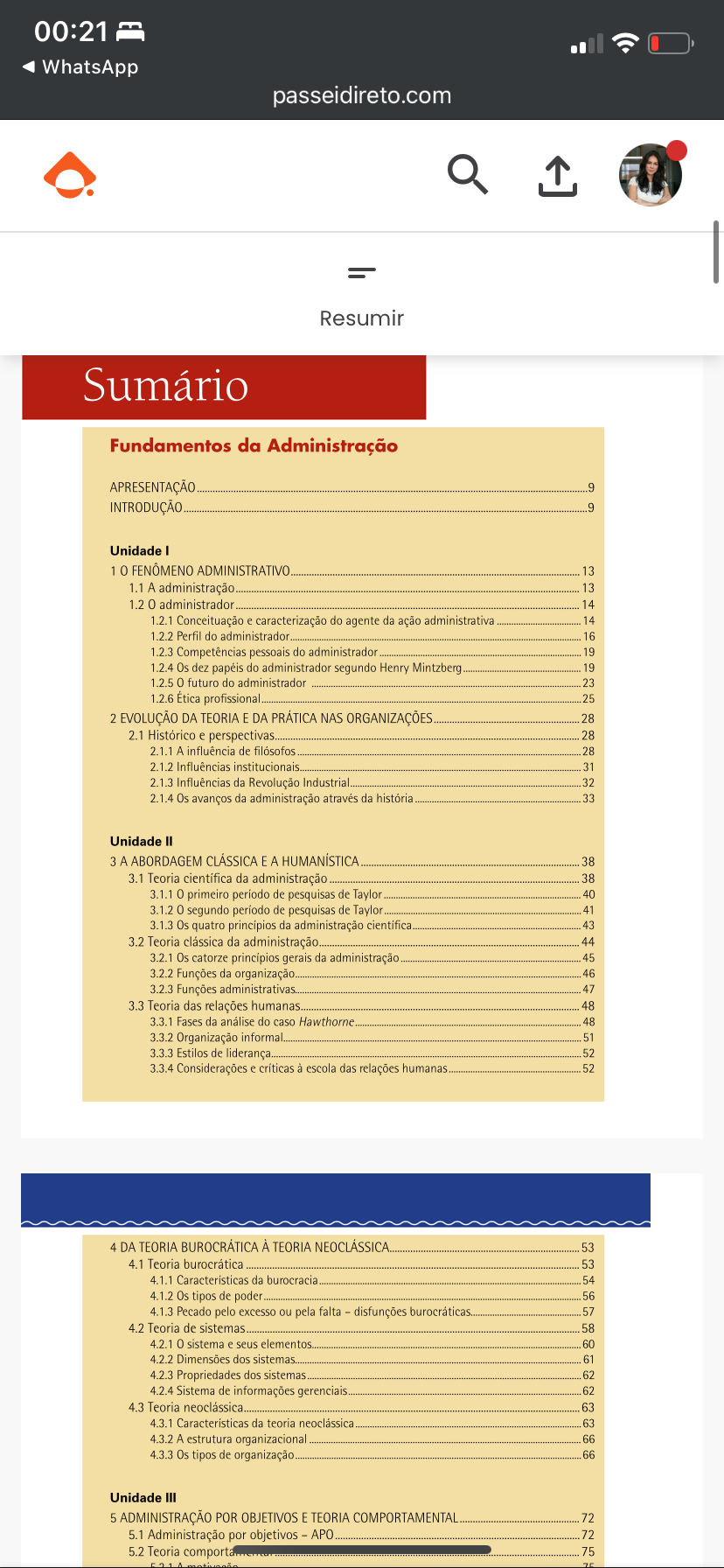 00:21 WhatsApp passeidireto.com Resumir Sumário Fundamentos da Administração APRESENTAÇÃO 9 INTRODUÇÃO 9 Unidade 10 FENÔMENO ADMINISTRATIVO 13 1.1 A administração 13 0 administrador 14 1.2.1 Conceituação e caracterização do agente da ação administrativa 14 1.2.2 Perfil do administrador 16 1.2.3 Competências pessoais do administrador 19 1.2.4 Os dez papéis do administrador segundo Henry Mintzberg 19 1.2.5 0 futuro do administrador 23 1.2.6 profissional 25 2 EVOLUÇÃO DA TEORIA E DA PRÁTICA NAS ORGANIZAÇÕES 28 2.1 Histórico e perspectivas 28 2.1.1 A influência de filósofos 28 2.1.2 Influências institucionais 31 2.1.3 Influências da Revolução Industrial 32 2.1.4 Os avanços da administração através da história 33 Unidade II 3 A ABORDAGEM CLÁSSICA E A HUMANÍSTICA 38 3.1 Teoria cientifica da administração 38 3.1.1 0 primeiro de pesquisas de Taylor 40 3.1.2 0 segundo período de pesquisas de Taylor 41 3.1.3 Os quatro principios da administração cientifica 43 3.2 Teoria clássica da administração 44 3.2.1 Os catorze gerais da administração 45 3.2.2 Funções da organização 46 3.2.3 Funções administrativas 47 3.3 Teoria das relações humanas 48 3.3.1 Fases da análise do caso Hawthorne 48 3.3.2 Organização informal 51 3.3.3 Estilos de liderança 52 3.3.4 Considerações e críticas à escola das relações humanas 52 4 DA TEORIA BUROCRÁTICA À TEORIA NEOCLÁSSICA 53 4.1 Teoria burocrática 53 4.1.1 da burocracia 54 4.1.2 Os tipos de poder 56 4.1.3 Pecado pelo excesso ou pela falta - disfunções burocráticas 57 4.2 Teoria de sistemas 58 4.2.1 0 sistema e seus elementos 60 4.2.2 Dimensões dos sistemas 61 4.2.3 Propriedades dos sistemas 62 4.2.4 Sistema de informações gerenciais 62 4.3 Teoria neoclássica 63 4.3.1 Características da teoria neoclássica 63 4.3.2 A estrutura organizacional 66 4.3.3 Os tipos de organização 66 Unidade III 5 ADMINISTRAÇÃO POR OBJETIVOS E TEORIA COMPORTAMENTAL 72 5.1 Administração por objetivos APO 72 5.2 Teoria comporta 75 75