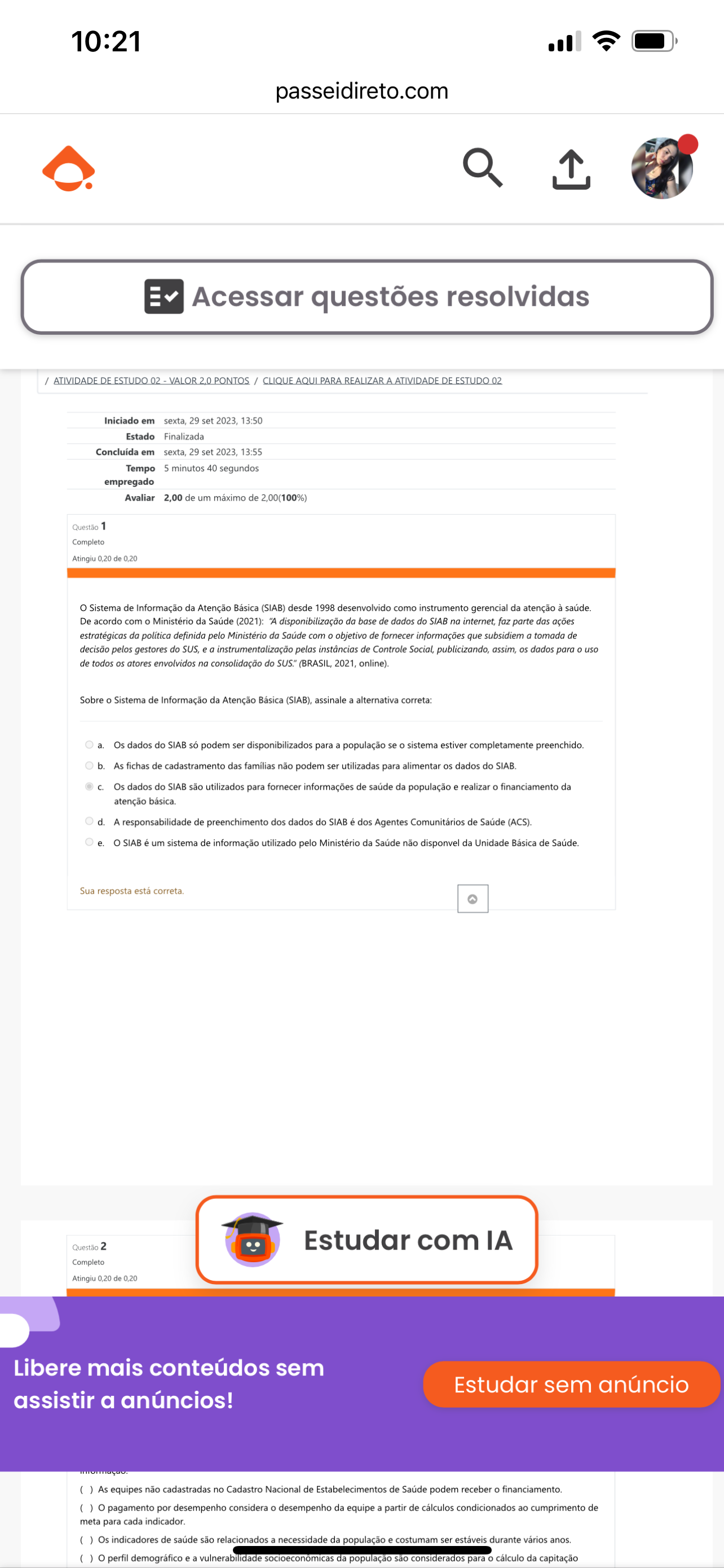 10:21 passeidireto.com Acessar questões resolvidas / ATIVIDADE DE ESTUDO 02 VALOR 2,0 PONTOS / CLIQUE AQUI PARA REALIZAR A ATIVIDADE DE ESTUDO 02 Iniciado em sexta, 29 set 2023, 13:50 Estado Finalizada Concluída em sexta. 29 set 2023, 13:55 Tempo 5 minutos 40 segundos empregado Avaliar 2,00 de um máximo de 2,00(100%) Questão 1 Completo Atingiu 0.20 de 0.20 o Sistema de Informação da Atenção Básica (SIAB) desde 1998 desenvolvido como instrumento gerencial da atenção à saúde. De acordo com o Ministério da Saúde (2021): "A disponibilização da base de dados do SIAB na faz parte das ações estratégicas da política definida pelo Ministério da Saúde com o objetivo de fornecer informações que subsidiem a tomada de decisão pelos gestores do SUS, instrumentalização pelas instâncias de Controle Social. publicizando, assim, os dados para o uso de todos os atores envolvidos na consolidação do SUS." 2021. online). Sobre o Sistema de Informação da Atenção Básica (SIAB), assinale a alternativa correta: Os dados do SIAB só podem ser disponibilizados para a população se o sistema estiver completamente preenchido. b. As fichas de cadastramento das famílias não podem ser utilizadas para alimentar os dados do SIAB. Os dados do SIAB são utilizados para fornecer informações de saúde da população e realizar o financiamento da atenção d. A responsabilidade de preenchimento dos dados do SIAB é dos Agentes Comunitários de Saúde (ACS). e. o SIAB é um sistema de informação utilizado pelo Ministério da Saúde não disponvel da Unidade Básica de Saúde. Sua resposta está correta. Questão 2 Estudar com IA Completo Atingiu 0.20 de 0.20 Libere mais conteúdos sem Estudar sem anúncio assistir a anúncios! ( ) As equipes não cadastradas no Cadastro Nacional de Estabelecimentos de Saúde podem receber o ( ) pagamento por desempenho considera o desempenho da equipe a partir de cálculos condicionados ao cumprimento de meta para cada indicador. ( ) Os indicadores de saúde são relacionados a necessidade da população e costumam ser estáveis durante vários anos. ( perfil e a vulnerabilidade socioeconômicas da população são considerados para cálculo da capitação