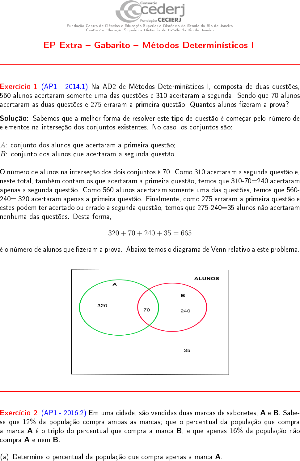 Fundação Centro de Ciências e Educação Superior a Distância do Estado do Rio de Janeiro Centro de Educação Superior a Distância do Estado do Rio de Janeiro EP Extra � Gabarito � Métodos Determinísticos I Exercício 1 (AP1 - 2014.1) Na AD2 de Métodos Determinísticos I, composta de duas questões, 560 alunos acertaram somente uma das questões e 310 acertaram a segunda. Sendo que 70 alunos acertaram as duas questões e 275 erraram a primeira questão. Quantos alunos �zeram a prova? Solução: Sabemos que a melhor forma de resolver este tipo de questão é começar pelo número de elementos na interseção dos conjuntos existentes. No caso, os conjuntos são: A: conjunto dos alunos que acertaram a primeira questão; B: conjunto dos alunos que acertaram a segunda questão. O número de alunos na interseção dos dois conjuntos é 70. Como 310 acertaram a segunda questão e, neste total, também contam os que acertaram a primeira questão, temos que 310-70=240 acertaram apenas a segunda questão. Como 560 alunos acertaram somente uma das questões, temos que 560- 240= 320 acertaram apenas a primeira questão. Finalmente, como 275 erraram a primeira questão e estes podem ter acertado ou errado a segunda questão, temos que 275-240=35 alunos não acertaram nenhuma das questões. Desta forma, 320 + 70 + 240 + 35 = 665 é o número de alunos que �zeram a prova. Abaixo temos o diagrama de Venn relativo a este problema. Exercício 2 (AP1 - 2016.2) Em uma cidade, são vendidas duas marcas de sabonetes, A e B. Sabe- se que 12% da população compra ambas as marcas; que o percentual da população que compra a marca A é o triplo do percentual que compra a marca B; e que apenas 16% da população não compra A e nem B. (a) Determine o percentual da população que compra apenas a marca A. Métodos Determinísticos I EP Extra 2 (b) Se a marca B lançar uma ofensiva publicitária e conseguir fazer com que um quinto das pessoas que compram apenas a marca A passem a comprar a marca B, qual Será o aumento percentual de clientela da marca B? Solução: (a) Vamos chamar de U o conjunto de todos os habitantes da cidade, de A o conjunto dos com- pradores da marca A e de B o conjunto dos compradores da marca B. Representando em uma diagrama de Venn, temos o seguinte: Vamos chamar de t o número de habitantes da cidade, isto é, faremos n(U) = t. A informação de que �12% da população compra ambas as marcas", nos dá então que n(A ∩ B) = 12 100 · t. Além disso, como �apenas 16% da população não A e nem B", temos n(U − (A∪B)) = 16 100 · t. Temos então o seguinte diagrama: Se chamarmos de x o percentual de pessoas que compram exclusivamente a marca B, como no diagrama abaixo, teremos n(B) = x+ n(A ∩ B) = x+ 12 100 · t. Como o número de compradores da marca A é o triplo de compradores de B, temos n(A) = 3n(B) = 3 ( x+ 12 100 · t ) = 3x+ 36 100 · t. Além disso, o número de compradores exclusivos da marca A será dado por n(A)− n(A ∩B) = ( 3x+ 36 100 · t ) − 12 100 · t = 3x+ 24 100 · t. Fundação CECIERJ Consórcio CEDERJ Métodos Determinísticos I EP Extra 3 Reunindo todas as informações no diagrama, temos: Com isso, podemos ver que( 3x+ 24 100 · t ) + 12 100 ·t+ x+ 16 100 · t = t, logo 4x = t− 52 100 · t ∴ 4x = 48 100 · t ∴ x = 12 100 · t. O percentual de compradores exclusivos de A será então n(A)− n(A ∩B) = 3 · 12 100 · t+ 24 100 · t = 60 100 · t. Com isso, 60% da população compra apenas a marca A. Observação: Uma forma mais simples (embora mais descuidada) de resolver seria supor que a cidade possui 100 habitantes e resolver de forma similar à feita acima, porém sem o t. Resolver desta forma, porém, poderia levar (não é o caso neste problema, mas poderia ocorrer) à conjuntos com cardinalidade não inteira, que deveriam ser interpretados como percentuais da forma 12,41%, por exemplo, que faz sentido para populações grandes. (b) No item anterior, encontramos os seguintes percentuais: Com isso, a marca B tem, hoje, 12 100 · t+ 12 100 · t = 24 100 · t compradores. Se a campanha publicitária da marca B conseguir captar um quinto dos 60 100 · t compradores exclusivos da marca A, ela representará um aumento de 1 5 · 60 100 · t = 12 100 · t novos clientes. O aumento percentual será o número de novos clientes dividido pelo número de clientes antigos, isto é, 12 100 · t 24 100 · t = 1 2 = 50 100 = 50%. Fundação CECIERJ Consórcio CEDERJ Métodos Determinísticos I EP Extra 4 Exercício 3 (AP1 - 2018.1) Em uma cidade, o número de pessoas que não compram nas Lojas Pedro é o dobro do número de pessoas que compram. Das pessoas que compram nas Lojas Pedro, metade compra também nas Lojas Mateus. Sabe-se ainda que as duas lojas possuem o mesmo número de clientes. (a) Represente, por meio de um diagrama, a situação descrita, representando por P o conjunto de quem compra nas Lojas Pedro e por M o conjunto de quem compra nas Lojas Mateus. Repre- sente por x a quantidade de pessoas que compram nas Lojas Pedro e, a partir daí, complete todas as partes do diagrama com a fração de x correspondente. (b) Que fração da população da cidade não compra nem nas Lojas Pedro e nem nas Lojas Mateus? (c) Que fração da população da cidade compra nas duas lojas? (d) Que fração da população da cidade compra apenas nas Lojas Pedro? E apenas nas Lojas Mateus? Solução: (a) Começaremos a preencher o diagrama abaixo: Chamando de x a quantidade de pessoas que compram nas Lojas Pedro, como metade destas pessoas também compram nas Lojas Mateus, a interseção entre P e M será x 2 . Com isso, a quantidade de pessoas que compram exclusivamente nas Lojas Pedro é x − x 2 = x 2 , conforme representado abaixo. Fundação CECIERJ Consórcio CEDERJ Métodos Determinísticos I EP Extra 5 O número de pessoas que compram nas Lojas Mateus é igual à quantidade que compra nas Lojas Pedro, logo, igual a x. Como x 2 já est