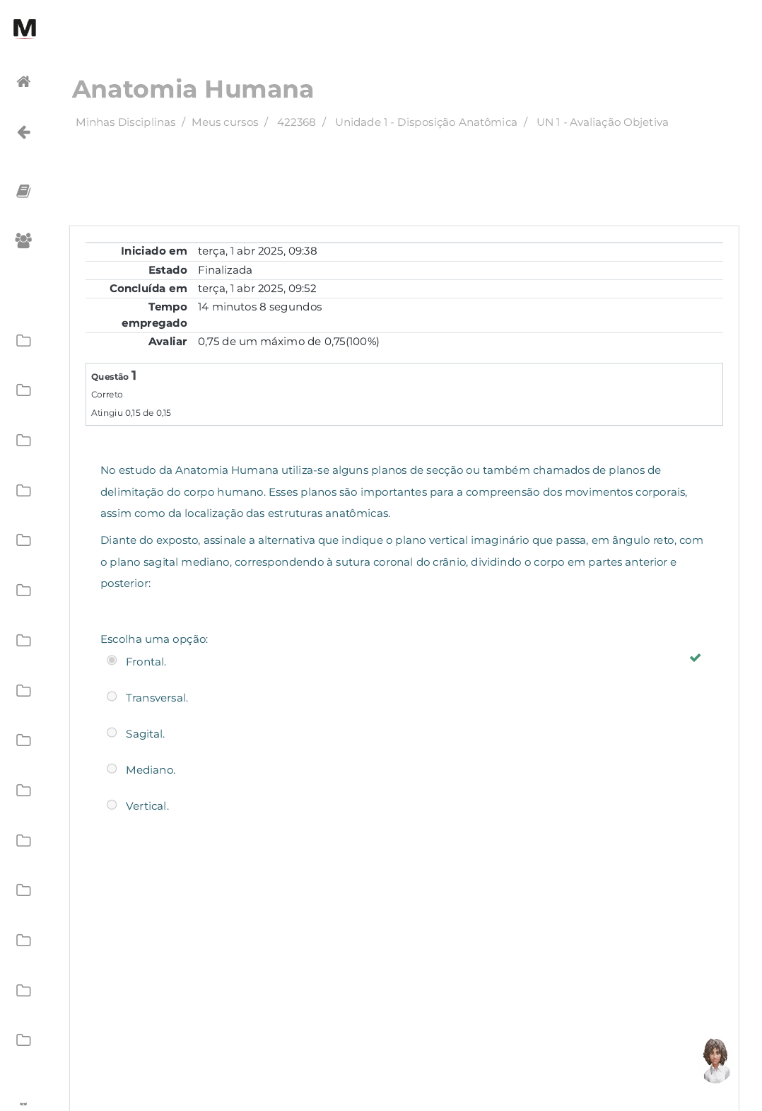 Minhas Disciplinas / Meus cursos / 422368 / Unidade 1 - Disposição Anatômica / UN 1 - Avaliação Objetiva Anatomia Humana Iniciado em terça, 1 abr 2025, 09:38 Estado Finalizada Concluída em terça, 1 abr 2025, 09:52 Tempo empregado 14 minutos 8 segundos Avaliar 0,75 de um máximo de 0,75(100%) Questão 1 Correto Atingiu 0,15 de 0,15 No estudo da Anatomia Humana utiliza-se alguns planos de secção ou também chamados de planos de delimitação do corpo humano. Esses planos são importantes para a compreensão dos movimentos corporais, assim como da localização das estruturas anatômicas. Diante do exposto, assinale a alternativa que indique o plano vertical imaginário que passa, em ângulo reto, com o plano sagital mediano, correspondendo à sutura coronal do crânio, dividindo o corpo em partes anterior e posterior: Escolha uma opção: Frontal. Transversal. Sagital. Mediano. Vertical. https://avap.multivix.edu.br/my/ https://avap.multivix.edu.br/course/view.php?id=33968 https://avap.multivix.edu.br/course/view.php?id=33968§ion=2 https://avap.multivix.edu.br/mod/quiz/view.php?id=1889690 https://avap.multivix.edu.br/my/ https://avap.multivix.edu.br/course/view.php?id=33968 https://avap.multivix.edu.br/user/index.php?id=33968 https://avap.multivix.edu.br/course/view.php?id=33968§ion=1 https://avap.multivix.edu.br/course/view.php?id=33968§ion=2 https://avap.multivix.edu.br/course/view.php?id=33968§ion=3 https://avap.multivix.edu.br/course/view.php?id=33968§ion=4 https://avap.multivix.edu.br/course/view.php?id=33968§ion=5 https://avap.multivix.edu.br/course/view.php?id=33968§ion=6 https://avap.multivix.edu.br/course/view.php?id=33968§ion=7 https://avap.multivix.edu.br/course/view.php?id=33968§ion=8 https://avap.multivix.edu.br/course/view.php?id=33968§ion=9 https://avap.multivix.edu.br/course/view.php?id=33968§ion=10 https://avap.multivix.edu.br/course/view.php?id=33968§ion=11 https://avap.multivix.edu.br/course/view.php?id=33968§ion=12 https://avap.multivix.edu.br/course/view.php?id=33968§ion=13 https://avap.multivix.edu.br/course/view.php?id=33968§ion=14 https://avap.multivix.edu.br/course/view.php?id=33968§ion=15 https://avap.multivix.edu.br/hooks/portal/ https://avap.multivix.edu.br/ https://avap.multivix.edu.br/ https://avap.multivix.edu.br/ https://avap.multivix.edu.br/ Questão 2 Correto Atingiu 0,15 de 0,15 Questão 3 Correto Atingiu 0,15 de 0,15 Para as descrições anatômicas são considerados os planos em que o corpo humano é seccionado. Conhecer esses planos é fundamental para aprender anatomia humana de forma correta. Diante disso, assinale a alternativa correta que indique o plano que se situa em ângulos retos com os outros dois planos e divide o corpo em partes superior e inferior. Escolha uma opção: Coronal. Sagital. Frontal. Mediano. Transversal. A Anatomia Humana é a ciência que estuda a constituição dos seres humanos e é a base para demais ciências básicas como a Fisiologia Humana, Bioquímica, Cinesiologia, dentre muitas outras. Dentro dessa área, estuda-se os sistemas orgânicos e as regiões corporais. Para o bom estudo da Anatomia Humana, é importante considerar a divisão do corpo humano. Nesse sentido, o corpo humano é dividido em: Escolha uma opção: cabeça pescoço, tronco, dorso e membros. cabeça, pescoço, tronco e membros. cabeça, tronco, dorso e membros. cabeça, pescoço, dorso e membros. cabeça, tronco e membros. https://avap.multivix.edu.br/my/ https://avap.multivix.edu.br/course/view.php?id=33968 https://avap.multivix.edu.br/user/index.php?id=33968 https://avap.multivix.edu.br/course/view.php?id=33968§ion=1 https://avap.multivix.edu.br/course/view.php?id=33968§ion=2 https://avap.multivix.edu.br/course/view.php?id=33968§ion=3 https://avap.multivix.edu.br/course/view.php?id=33968§ion=4 https://avap.multivix.edu.br/course/view.php?id=33968§ion=5 https://avap.multivix.edu.br/course/view.php?id=33968§ion=6 https://avap.multivix.edu.br/course/view.php?id=33968§ion=7 https://avap.multivix.edu.br/course/view.php?id=33968§ion=8 https://avap.multivix.edu.br/course/view.php?id=33968§ion=9 https://avap.multivix.edu.br/course/view.php?id=33968§ion=10 https://avap.multivix.edu.br/course/view.php?id=33968§ion=11 https://avap.multivix.edu.br/course/view.php?id=33968§ion=12 https://avap.multivix.edu.br/course/view.php?id=33968§ion=13 https://avap.multivix.edu.br/course/view.php?id=33968§ion=14 https://avap.multivix.edu.br/course/view.php?id=33968§ion=15 https://avap.multivix.edu.br/hooks/portal/ https://avap.multivix.edu.br/ https://avap.multivix.edu.br/ https://avap.multivix.edu.br/ https://avap.multivix.edu.br/ Questão 4 Correto Atingiu 0,15 de 0,15 Questão 5 Correto Atingiu 0,15 de 0,15 A nômina anatômica é o conjunto de termos que indicam e descrevem as partes do organismo. Conhecê-la é o ponto inicial para o estudo da anatomia humana, pois dessa forma, conseguimos universalizar o ensino e aprendizagem dentro dessa área. Sendo assim, assinale a alternativa que corresponde ao nome dado a uma estrutura anatômica inferior. Escolha uma opção: Medial. Lateral. Ventral. Cranial. Caudal. Acredita-se que o conhecimento a respeito da maioria dos órgãos deu-se por observações da anatomia interna de animais que eram sacrificados durante a história. Diante disso, assinale a alternativa correta que indique o sujeito que realizou o estudo da anatomia fetal, considerando que a cabeça seria a primeira parte a se desenvolver no corpo humano. Escolha uma opção: Aristóteles. Herófilo. Galileu. Leonardo da Vinci. Empédocles. ◄ Conteúdo Online Seguir para... Conteúdo Online ► https://avap.multivix.edu.br/mod/scorm/view.php?id=1889689&forceview=1 https://avap.multivix.edu.br/mod/scorm/view.php?id=1889691&forceview=1 https://avap.multivix.edu.br/my/ https://avap.multivix.edu.br/course/view.php?id=33968 https://avap.multivix.edu.br/user/index.php?id=33968 https://avap.multivix.edu.br/course/view.php?id=33