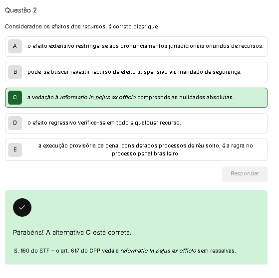 Questão 2 Considerados os efeitos dos recursos, é correto dizer que A o efeito extensivo restringe-se aos pronunciamentos jurisdicionais oriundos de B pode-se buscar revestir recurso de efeito suspensivo via mandado de segurança. a vedação à pejus ex officio compreende as nulidades D o efeito regressivo verifica-se em todo qualquer a execução provisória da pena, considerados processos de réu solto, é a regra no E processo penal brasileiro. Responder A alternativa C está correta. S. 160 do STF - - o art. 617 do CPP veda a pejus ex officio sem ressalvas.