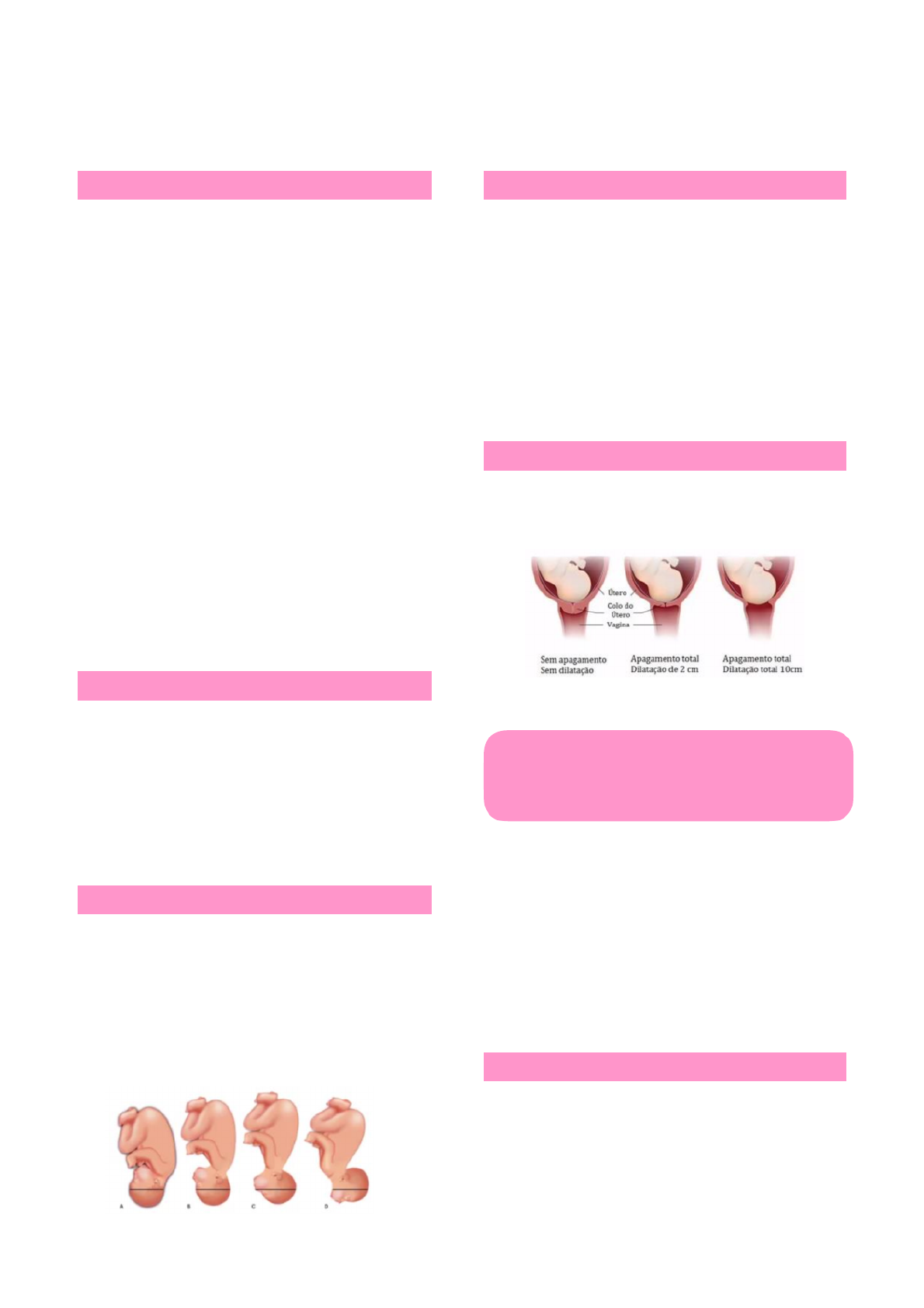 Impresso por Adriana Marques, E-mail drimarques10@gmail.com para uso pessoal e privado. Este material pode ser protegido por direitos autorais e não pode ser reproduzido ou repassado para terceiros. 29/04/2025, 16:14:05 Assistencia ao Trabalho de Parto Fatores do parto - Duro: Bacia obstétrica rígida e imóvel (exceto → cóccix). Deve permitir que o feto acomode e movimente-se para desenvolver os mecanismos de parto. Hormônios relaxina e estrogênio tornam as articulações flexíveis e preparam a pelve para o trabalho de parto. • Planos de Lee: relação altura da apresentação fetal x espinhas ciáticas para efetuar o prognóstico e evolução do trabalho de parto. • Estreito superior possível dificuldade de encaixa. → Feto alto e móvel. De Lee: -4, -3, -2. • Estreito médio possível parada da progressão → do feto na altura das espinhas ciáticas. Feto insinuado. De Lee: -1, 0 e +1. • Estreito inferior possível prolongamento do → período expulsivo e dificuldade para defletir a cabeça no desprendimento. De Lee: +2 em diante. - Mole: colo do útero, vagina e períneo. • Colo do útero di latação, apagamento/ → consistência, posição. - Contrações uterinas: fatores manutenção da gravidez, → dilatação e apagamento do colo, descida e expulsão fetal, descolamento da placenta, hemostasia puerperal. • Frequência (quantidade de contrações em 10’) • Intensidade • Tônus • Duração de cada contração > 40s = efetiva. → Feto, bolsa, líquido amniótico, placenta, cordão umbilical. Atitude: • Fletida lambda; → • Defletida primeiro grau: bregma → segundo grau: glabela → terceiro grau: mento → Movimentos passivos descritos pelo feto em seu percurso pelo canal de parto, impulsionado pelas contrações uterinas. • Insinuação (plano 0 - estreito médio) • Descida • Rotação interna (costas para cima) • Desprendimento e deflexão • Rotação externa • Desprendimento do tronco Assistência ao trabalho de parto Diagnóstico → contrações uterinas regulares (2 ou 3/10’, durando 50-60 segundos); dilatação 3cm e colo ≥ apagado (primíparas) / 4cm colo semi-apagado. ≥ Reavaliar após 2h para constatar a presença de trabalho de parto verdadeiro. - Estabelecer a correta IG: DUM ou USG do 1º trim. - História obstétrica: passada e dados da atual p/ identificar risco obstétrico paridade, causa de → abortos, HAS, DM, cardiopatias. - EF: SSVV, EF geral, EF obstétrico (volume uterino, situação, posição, apresentação, insinuação e BCF - antes, durante e depois da contração), avaliar extremidades p/ edemas, varizes. - Laboratório: tipo sanguíneo, Coombs indireto se Rh -, VDRL, HIV (teste rápido). Sinal de proximidade do parto (falso trabalho de parto!) - Queda do ventre, adaptação da apresentação no estreito superior, percepção de metrossístoles intermitentes, amolecimento do colono útero + apagamento, contrações sem ritmo, eliminação do tampão mucoso, insinuação, e Bolsa (se romper: TP em ate 48h; se não: indução). trajeto: motor objeto mecanismo admissão pródromos Falso trabalho de parto:→ contrações dolorosas pré-parto, metrossístoles de ritmo irregular e descoorde-nadas, não produzem modificação no colo. Ívena B. Fiuza | Medicina Impresso por Adriana Marques, E-mail drimarques10@gmail.com para uso pessoal e privado. Este material pode ser protegido por direitos autorais e não pode ser reproduzido ou repassado para terceiros. 29/04/2025, 16:14:05 - Dilatação: inicia com as contrações dolorosas, que modificam o colo (apagamento e dilatação). Termina com dilatação total. Abre-se o diagrama cérvico- segmentário e se forma o canal de parto. - Latente: não tem boa intensidade/duração. Contrações até 2/10’- 40’’. Dilatação até 4cm. - Ativa: contrações 3/10’- 40”. Dilatação 4-10cm. Assistência no primeiro período → encorajar movimentar + posições confortáveis. Pedir ajuda do acompanhante p/ movimentar. Medidas p/ alívio da dor. Amniotomia precoce não deve ser feita de rotina! • Frequência das contrações uterinas de 1/1h. BCF 30/30’ - se alto risco 15/15’. Pulso de hora em hora. • Temperatura e PA de 4/4h. • Colo: posição, dilatação e apagamento. • Bolsa: íntegra ou rota (LA claro, grumos, meconial, quantidade). • Apresentação: cefálico (plano de DeLee, variação de posição), pélvico ou córmico. • Partograma: definir linhas de alerta e ação. - Expulsão: inicia com a dilatação completa (10cm) e termina com a saída do feto. É associação sincrônica entre metrossístoles, força contrátil do diafragma e parede abdominal. Contrações mais intensas e frequentes, intervalos menores, até atingirem 5/10’. Assistência no segundo período → desencorajar a posição supina, decúbito dorsal horizontal ou semi- supina.. Incentivar posições confortáveis. Apoiar puxos espontâneos. Uso restrito de episio, fórceps e vácuo. Posição Laborie-Duncan (decúbito dorsal com flexão máxima das coxas sobre o abdome e abdução dos joelhos): amplia o estreito inferior e favorece a liberação do feto. Desprendimento dos ombros: primeiro anterior (guiar para baixo) e posterior depois (guiar para cima.. - Revisão da vagina e colo pós dequitação. Episiorrafia ou rafia de laceração, se necessário. BCF a cada 5 min. - Dequitação/ Secundamento: descolamento, descida e expulsão da placenta para fora das vias vaginais. Descolamento retração do m. uterino após o parto → (contrações). Reduz a superfície interna do útero, pregueando-se na zona de inserção da placenta. 2 mecanismos: • Schultze: 80% dos casos. Descola do centro para as bordas, com coágulo retroplacentário. Placentas de inserção alta. Face fetal. • Duncan: 20%. Descola das extremidades para o centro - maior perda sanguínea. Placentas de inserção mais baixa. Face materna. Descida passa do corpo uterino ao segmento infe