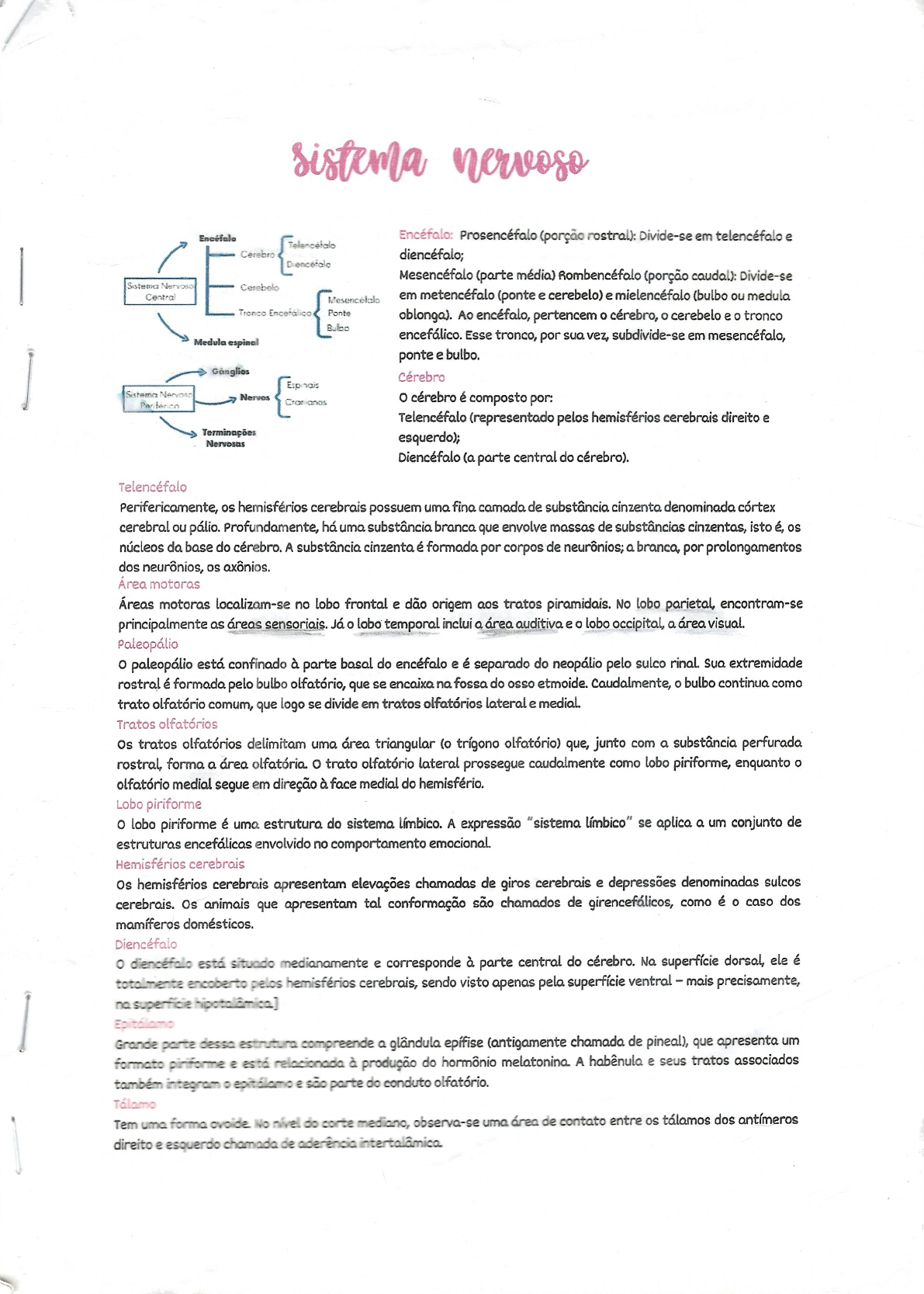 sistema nervoso Encéfalo: Prosencéfalo (porção rostral): Divide-se em telencéfalo e Cérebro diencéfalo; Mesencéfalo (parte média) (porção caudal): Divide-se Sistema Nervoso Cerebelo Central em metencéfalo (ponte e cerebelo) e mielencéfalo (bulbo ou Tronco Ponte oblonga). Ao encéfalo, pertencem o cérebro, o cerebelo e tronco encefálico. Esse tronco, por vez, subdivide-se em espinal ponte e bulbo. Cérebro Espinais Sistema Nervos cérebro é composto por: Telencéfalo (representado pelos hemisférios cerebrois direito e Terminações esquerdo); Diencéfalo (a parte central do cérebro). Telencéfalo Perifericamente, os hemisférios cerebrais possuem camada de substância córtex cerebral ou pálio. Profundamente, há uma substância que envolve massas de substâncias cinzentas, isto é, os núcleos da base do cérebro. A substância é formada por corpos de neurônios; a branca, por prolongamentos dos neurônios, os Área motoros Áreas motoras localizam-se no lobo frontal e dão origem tratos piramidais. No lobo parietal, encontram-se principalmente as áreas sensoriais. Já o lobo temporal inclui área e o lobo occipital, a área visual. está confinado à parte basal do encéfalo e é separado do pelo sulco rinal. Sua extremidade rostral é formada pelo bulbo olfatório, que se encaixa fossa do etmoide. Caudalmente, o bulbo continua como trato olfatório comum, que logo se divide em trotos olfatórios lateral e medial. Tratos olfatórios Os tratos olfatórios delimitam área triangular (o trígono olfatório) que, junto com a substância perfurada rostral, a o trato olfatório lateral prossegue como lobo piriforme, enquanto o olfatório medial segue em direção à face medial do hemisfério. Lobo piriforme lobo piriforme é umo. estruturo. do sistema límbico. A expressão "sistema límbico" se aplica a um conjunto de encefálicas envolvido no comportamento Hemisférios cerebrais Os hemisférios cerebrais apresentam elevações chamadas de giros cerebrois e depressões denominadas sulcos cerebrais. Os animais que apresentam tal conformação são chamados de girencefálicos, como é o caso dos mamíferos domésticos. Diencéfalo diencéfalo está situado medianamente e corresponde à parte central do cérebro. No. superfície dorsal, ele é totalmente encoberto pelos hemisférios cerebrais, sendo visto apenas pela superfície ventral - mais precisamente, no hipotalâmica] Grande parte desso compreende a glândula epífise (antigamente chamada de pineal), que apresenta um formato e está relacionada à produção do hormônio A e seus tratos associados também integram e são parte do conduto olfatório. Tálamo Tem uma forma ovoide No nível do corte mediano, observa-se uma área de contato entre os tálamos dos antímeros direito e esquerdo chamada de aderênciaTrata-se da continuação rostral do tegmento do o subtálamo contém os núcleos que atuam como estações de redistribuição na via extrapiramidal. Hipotálamo Possui importantes funções relacionados controle atividade visceral. Ele controla a hipófise (antigamente chamada de glândula pituitária) e, portanto, o sistema endócrino. papel é fundamental para o comportamento, incluindo a alimentação, e regula do corpo e o nervoso Cerebelo o cerebelo situa-se dorsalmente bulbo e à ponte e está relacionado ao equilíbrio e movimentos coordenados. superfície dorsal apresenta medianamente vérmis do cerebelo. Lateralmente a esse vérmis, localizam-se os hemisférios direito e esquerdo. Eles são constituídos pelas folhas do cerebelo, as quais, por sua vez, representam os giros Entre os giros, os sulcos cerebelo apresenta a substância cinzenta perifericamente (ou o chamado córtex cerebelar). córtex, ela conta com a substância (ou o denominado corpo medular do cerebelo ou árvore da vida). Histologicamente, a é formada por corpos de neurônios, enquanto a branca é por prolongamento de neurônios, os Tronco encefálico o tronco está localizado entre o diencéfalo, rostralmente, e a medula espinhal, caudalmente, e ventralmente ao cerebelo. Ele é composto por mesencéfalo, ponte e bulbo. Histologicamente, esse tronco é constituído por fibras nervosos que compõem os e as massas de cinzento constituintes dos núcleos do tronco Ao todo, 10 pares de nervos cronianos emergem do tronco encefálico (III par XII par). o mesencéfalo localiza-se entre o diencéfalo, rostralmente, e a ponte, ele apresenta os corpos quadrigêmeos. Ponte A ponte interposta mesencéfalo, cronialmente, e bulbo, caudalmente. é separada do mesencéfalo pelo sulco mesencéfalo-pontino, que a divisão entre mesencéfalo e ponte. Bulbo bulbo delimito-se com a ponte, rostralmente, e com a medula espinhal, caudalmente. o sulco bulbo-pontino marca o início do bulbo, enquanto seu término se dá no nível do forame magno, onde emerge a primeira espinhal do primeiro nervo espinhal. Medula espinhal A espinhal é uma massa dorso-ventralmente, ela está localizada no canal vertebral, não o ocupe por inteiro. Ramo dorsal Ramo ventral os músculos extensores do Inerva musculatura dos apêndices torácicos e pescoço e da coluna vertebral pélvicos, a musculatura do e a abdominal (musculatura epaxial). meninges A dura-máter é a mais externa e das A aracnoide é uma meninge entre dura-máter meninges. A dura-máter ao nível encefálico difere e a pia-máter. meninge se insere no pia-máter por meio de (chamadas de trobéculas daquela ao nível espinhal por ser formada por dois folhetos (o externo e o interno). projetando-se para espaço subaracnoideo, que, por sua vez, contém o A pia-máter é a mais interna e frágil das meninges. Ela se adere firmemente à medula espinhal e encéfalo, toda a mudança em seus contornos. Essa meninge emite projeções laterais de formatos triangulares longo de toda a medulo espinhal, os chamados ligamentos denticulados, que se inserem na dura-máter entre espinhais, servindo de fixação à medula espinhal