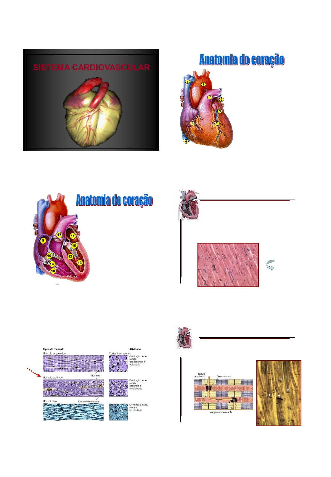 1 SISTEMA CARDIOVASCULAR 1 - Coronária Direita 2 - Coronária Descendente Anterior Esquerda 3 - Coronária Circunflexa Esquerda 4 - Veia Cava Superior 5 - Veia Cava Inferior 6 - Aorta 7 - Artéria Pulmonar 8 - Veias Pulmonares 9 - Átrio Direito 10 - Ventrículo Direito 11 - Átrio Esquerdo 12 - Ventrículo Esquerdo 13 - Músculos Papilares 14 - Cordoalhas Tendíneas 15 - Válvula Tricúspide 16 - Válvula Mitral 17 - Válvula Pulmonar Fibras alongadas e que se anastomosam. Diferenciam dos esqueléticos por apresentarem apenas 1 ou 2 núcleos. Endomísio com riqueza de capilares (intenso metabolismo aeróbico) Músculo Estriado Cardíaco Músculo cardíaco SINCÍCIO (propagação rápida do impulso) Músculo Estriado Cardíaco Discos intercalares Complexos juncionais (zônula de adesão, desmossomas e junções comunicantes) entre as fibras. Baixa resistência elétrica (1/400 do sarcolema) IMPORTÂNCIA Músculo Estriado Cardíaco Fibras cardíacas: Presença de numerosas mitocôndrias http://campus.fortunecity.com/yale/757/coracao05.gif http://campus.fortunecity.com/yale/757/coracao05.gif 2 Para que o sangue possa circular pelo corpo é necessário que uma bomba (o coração) faça força (pressão) para empurrar este sangue por dentro das artérias. Pequena circulação (pulmonar): CIRCULAÇÃO SANGUÍNEA VD ARTÉRIA PULMONAR AE VEIAS PULMONARES VE ARTÉRIA AORTA AD VEIAS CAVAS Grande circulação (sistêmica): Coração direito – bombeia sangue através dos pulmões Coração esquerdo – bombeia sangue através dos órgãos periféricos BOMBA PULSÁTIL de 2 câmaras: ÁTRIO VENTRÍCULO SINCÍCIO ATRIAL E SINCÍCIO VENTRICULAR O Potencial de ação passa do átrio para o ventrículo pelo FEIXE ATRIOVENTRICULAR (AV) SINCÍCIO ATRIAL SINCÍCIO VENTRICULAR POTENCIAL DE AÇÃO OBS: Separados por tecido fibroso 1 – Nodo sinoatrial 2 - Nodo Átrioventricular (AV) 3 - Feixe AV 4 - Ramos Direito e Esquerdo do Feixe de Hiss Fibras musculares especializadas: auto-excitáveis. Formam um sistema condutor e excitatório no coração Sistema especial de condução: 2m/s SP x 0,4m/s MC POTENCIAL DE AÇÃO TÍPICO + + + + + + + + + + + + - - - - - - - - - - - - - - - - - Estado de repouso - - - - - - + + + + + + + + + + + - - - - - - - - - - - + + + + + + + + + + + + - - - - - - - - - - - - - - - - - Início Despolarização Despolarização completa + + + + + + - - - - - - - - - - - - - - - - - + + + + + + + Início Repolarização - 90 mV http://www.mhhe.com/biosci/esp/2002_general/Esp/default.htm http://campus.fortunecity.com/yale/757/coracao05.gif http://www.cristina.prof.ufsc.br/md_cardiovascular.htm 3 MÚSCULO CARDÍACO PLATÔ DO POTENCIAL DE AÇÃO (Aumenta contração 3 a 15 X mais) 1- CANAIS RÁPIDOS DE SÓDIO Abertura súbita: Iniciam o PA em ponta 2- CANAIS LENTOS DE CÁLCIO-SÓDIO Abertura lenta, permanecem abertos por mais tempo (PROLONGA DESPOLARIZAÇÃO) Ca+ estimula contração 3- CANAIS DE POTÁSSIO Abertura no final do platô. Restabelecem PA repouso ACOPLAMENTO EXCITAÇÃO-CONTRAÇÃO Túbulos T – transmitem potencial de ação para interior da fibra muscular (PA atua sobre a membrana do retículo sarcoplasmático) Liberação de cálcio CONTRAÇÃO MUSCULAR Contração do miocárdio dependente do cálcio do líq. extracelular (adição de Ca pelo túbulo T) Término do platô do PA: interrupção do influxo de Ca para interior da fibra. Restante bombeado para retículo e túbulo T Ca+ Ca+ Ca+ Ca+ Ca+ Ca+ Ca+ Ca+ EXCITAÇÃO: geração espontânea de um PA no NODO SINUSAL NODO SINUSAL ÁTRIO DIREITO FEIXE A-V VENTRICULO DIREITO ÁTRIO ESQUERDO VENTRICULO ESQUERDO Retardo de 1/10 segundo Nodo sinoatrial MARCAPASSO DO CORAÇÃO Potencial de repouso menos negativo: -55 mV (membranas mais acessíveis ao Na+) Acessibilidade inerente ao Na causa auto-excitação Frequência de descargas rítmicas é maior que nas outras fibras excitáveis (nodo AV e fibras de Purkinje) Controla ritmo dos batimentos cardíacos EXCITAÇÃO CARDÍACA 4 Válvula Pulmonar Válvula Tricúspide Válvula Aórtica Válvula Mitral Atrioventriculares Semilunares Funcionamento das válvulas durante o ciclo cardíaco Valvas na diástole ventricular Valvas na sístole ventricular Dinamismo das valvas Funcionamento das válvulas durante o ciclo cardíaco Válvula Aórtica Período de Relaxamento DIÁSTOLE Período de Contração SÍSTOLE Sístole atrial Diástole ventricular Diástole atrial Sístole ventricular DIÁSTOLE – Fase de Relaxamento Átrios relaxam (entra sg das veias cavas e pulmonar). 75% flui diretamente para ventrículos. Contração atrial: enchimento adicional de 25%. Pressão atrial aumenta: abre válvulas tricúspide e mitral enche ventrículo (diástole) ENCHIMENTO DOS VENTRÍCULOS Sístole ventricular – sangue se acumula nos átrios (válvulas A-V fechadas). Terminada sístole (pressão ventricular e pressão atrial ) Abertura das válvulas A-V: sg flui dos átrios para ventrículos Diástole ventricular 1/3 – sg flui depois das válvulas abrirem 2/3 – pouco sg continua chegar das veias 3/3 – contração atrial (enchimento adicional – 25%) 5 SÍSTOLE CONTRAÇÃO ISOVOLUMÉTRICA Início da contração ventricular (pressão ) – fecha as válvulas A-V Ventrículo acumula pressão (sg venoso também pressão) É necessária alta pressão para abrir as válvulas semilunares PERÍODO DE EJEÇÃO Pressão vent. supera limite de 80 mmHg VE e 8 mmHg VD – sg escoa para artérias (70% no 1/3 e 30% nos 2/3 restantes) RELAXAMENTO ISOVOLUMÉTRICO Após sístole – ventrículo relaxa (pressão ) e válvulas aórtica e pulmonar se fecham (alta pressão nas artérias) causando relaxamento final do ventrículo (níveis diastólicos) Abertura das válvulas A-V NOVO BOMBEAMENTO SANGUÍNEO NÚMEROS DO CORAÇÃO VOLUME DIASTÓLICO FINAL – Vol de sg em cada ventrículo ao final da diástole: 110 a 120 mL VOLUME SISTÓLICO FINAL – Vol de sg em cada ventrículo ao final da sístole: 50 a 60 mL D