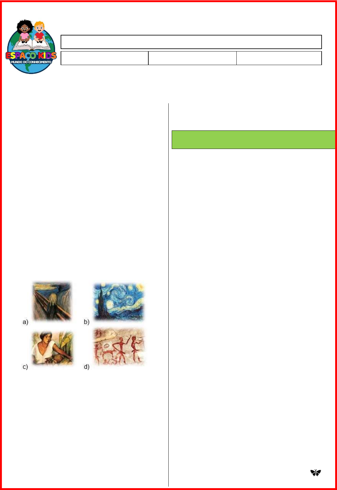 ESPAÇO KIDS MUNDO DO CONHECIMENTO ATIVIDADE AVALIATIVA MENSAL DE HISTÓRIA 1) Quando os seres humanos não haviam aprendido a cultivar e a criar animais, o que faziam para se alimentar? ___________________________________________ ___________________________________________ ___________________________________________ 2) Leia as afirmativas abaixo e classifique em povos nômades ou povos sedentários. a) Esses povos não tem moradia fixa. ___________________________________________ b) Esses povos possuem um lugar fixo para morar. ___________________________________________ 3) As artes rupestres eram criações artísticas feitas em rochas. Marque a alternativa que representa essas artes. 4) Complete as frases com as palavras brancos, negros ou indígenas. a) Os ______________________ foram os primeiros habitantes do Brasil. b. Os ____________________ chegaram e tomaram posse das terras. c. Os _____________________ vieram forçados para trabalhar como escravizados. 5) Com as palavras do boxe, complete o texto baixo corretamente. aproveitamento – etnias – formação – dominação – exploração – imposição – somos É essencial compreender que a __________________ do povo brasileiro se deu a partir de relações de _____________________, ______________________, _____________________ e _____________________ entre pessoas de várias ________________________. Entretanto, é preciso saber o que aconteceu historicamente para podermos compreender quem ____________________________ e como seremos. "Você pode mais do que imagina!" Aluno(a): Professora: Pâmela Ferreira Série/turma: 4º ano Data: _____/______/ 2025
