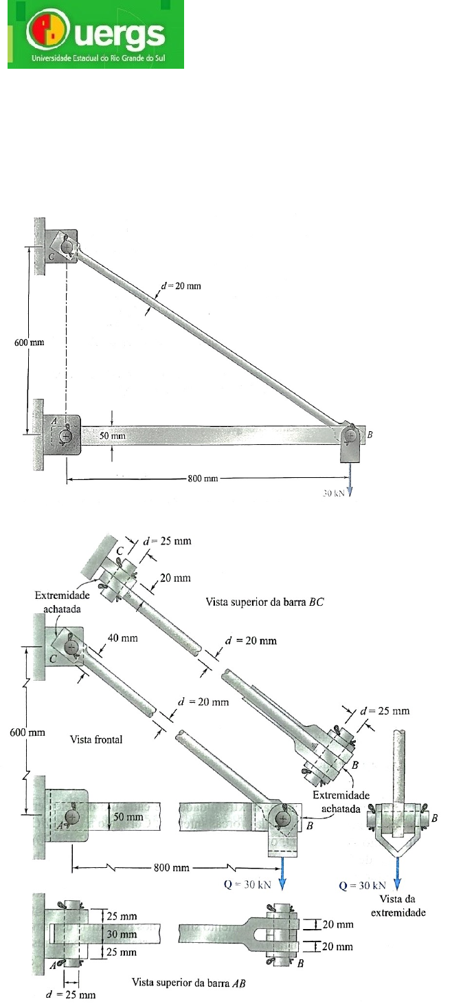 UNIVERSIDADE ESTADUAL DO RIO GRANDE DO SUL CURSO: ENGENHARIA DE CONTROLE E AUTOMAÇÃO DISCIPLINA: RESISTÊNCIA DOS MATERIAIS PROF. EMERSON FERNANDES DA CUNHA LISTA DE EXERCÍCIOS – AVALIAÇÃO 1 ALUNO: ______________________________________________ DATA: _________________ 1 – A estrutura ao lado deve suportar uma carga de 30 kN. Essa estrutura é composta por duas barras, AB com seção transversal de 30 x 50 mm e BC com seção transversal circular com diâmetro de 20 mm. As barras estão conectadas por um pino em B e são fixadas em A e C por pino e suporte. Determine (a) as cargas axiais atuantes em cada barra e também a tensão normal em cada uma delas; (b) as tensões de cisalhamento nos pinos das conexões e (c) as tensões de esmagamento nominal em A, B e C. 2 2 – Uma barra de comprimento L e seção transversal uniforme está ligada a suportes rígidos em A e B antes de ser aplicada uma força. Quais são as tensões nas partes AC e BC em razão da aplicação de uma força P no ponto C? 3 – Na figura, sabendo que ambos os apoios rígidos estão ajustados quando a temperatura estiver a +20 ˚C, determine os valores da tensão nas partes AC e CB da barra de aço mostrada quando a temperatura da barra for de -45 ˚C. Use os valores E = 200 GPa e α = 12 x 10-6 / ˚C para o aço.