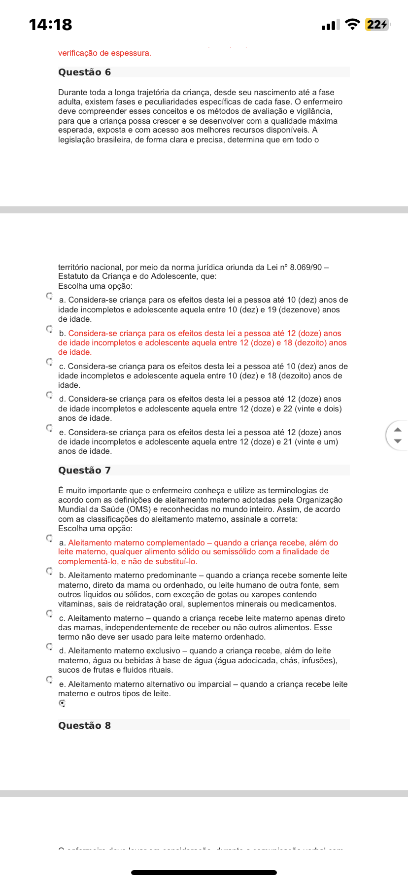 14:18 224 verificação de espessura. Questão 6 Durante toda a longa trajetória da criança, desde seu nascimento até a fase adulta, existem fases e peculiaridades específicas de cada fase. enfermeiro deve compreender esses conceitos e os métodos de avaliação e vigilância, para que a criança possa crescer e se desenvolver com a qualidade máxima esperada, exposta e com acesso aos melhores recursos disponíveis. A legislação brasileira, de forma clara e precisa, determina que em todo o território nacional, por meio da norma jurídica oriunda da Lei n° 8.069/90 - Estatuto da Criança e do Adolescente, que: Escolha uma opção: a. Considera-se criança para os efeitos desta lei a pessoa até 10 (dez) anos de idade incompletos e adolescente aquela entre 10 (dez) e 19 (dezenove) anos de idade. b. Considera-se criança para os efeitos desta lei a pessoa até 12 (doze) anos de idade incompletos e adolescente aquela entre 12 (doze) e 18 (dezoito) anos de idade. Considera-se criança para os efeitos desta lei a pessoa até 10 (dez) anos de idade incompletos e adolescente aquela entre 10 (dez) e 18 (dezoito) anos de idade. d. Considera-se criança para os efeitos desta lei a pessoa até 12 (doze) anos de idade incompletos e adolescente aquela entre 12 (doze) e 22 (vinte e dois) anos de idade. e. Considera-se criança para os efeitos desta lei a pessoa até 12 (doze) anos de idade incompletos e adolescente aquela entre 12 (doze) e 21 (vinte e um) anos de idade. Questão 7 É muito importante que o enfermeiro conheça e utilize as terminologias de acordo com as definições de aleitamento materno adotadas pela Organização Mundial da Saúde (OMS) e reconhecidas no mundo inteiro. Assim, de acordo com as classificações do aleitamento materno, assinale a correta: Escolha uma opção: a. Aleitamento materno complementado quando a criança recebe, além do leite materno, qualquer alimento sólido ou semissólido com a finalidade de complementá-lo, e não de b. Aleitamento materno predominante quando a criança recebe somente leite materno, direto da mama ou ordenhado, ou leite humano de outra fonte, sem outros líquidos ou sólidos, com exceção de gotas ou xaropes contendo vitaminas, sais de reidratação oral, suplementos minerais ou medicamentos. C. Aleitamento materno quando a criança recebe leite materno apenas direto das mamas, independentemente de receber ou não outros alimentos. Esse termo não deve ser usado para leite materno ordenhado. d. Aleitamento materno exclusivo - quando a criança recebe, além do leite materno, água ou bebidas à base de água (água adocicada, chás, infusões), sucos de frutas e fluidos rituais. e. Aleitamento materno alternativo ou imparcial quando a criança recebe leite materno e outros tipos de leite. Questão 8