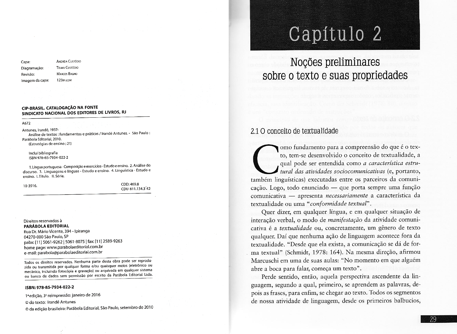 Capítulo 2 Capa: ANDRÉIA CUSTÓDIO TELMA CUSTÓDIO Noções preliminares Diagramação: Revisão: Marcos Imagem da capa: 123RF.COM sobre 0 texto e suas propriedades CIP-BRASIL. CATALOGAÇÃO NA FONTE SINDICATO NACIONAL DOS EDITORES DE LIVROS, RJ A672 Antunes, Irandé, Análise de textos fundamentos e práticas / Irandé São Paulo 2.1 conceito de textualidade Parábola Editorial, 2010. (Estratégias de ensino 21) omo fundamento para a compreensão do que é o tex- Inclui bibliografia ISBN 978-85-7934-022-2 1. Língua portuguesa Composição e exercícios Estudo e ensino. 2. Análise do C to, tem-se desenvolvido o conceito de textualidade, a qual pode ser entendida como a característica estru- discurso. 3. Linguagens e línguas Estudo e ensino. 4. Linguística Estudo e tural das atividades sociocomunicativas (e, portanto, ensino. II. Série. também linguísticas) executadas entre os parceiros da comuni- 10-3916. CDD: 469.8 CDU cação. Logo, todo enunciado que porta sempre uma função comunicativa apresenta necessariamente a característica da textualidade ou uma "conformidade textual". Quer dizer, em qualquer língua, e em qualquer situação de Direitos reservados à interação verbal, o modo de manifestação da atividade comuni- PARÁBOLA EDITORIAL Rua Dr. Mário Vicente, 394 Ipiranga cativa é a textualidade ou, concretamente, um gênero de texto 04270-000 São Paulo, SP qualquer. Daí que nenhuma ação de linguagem acontece fora da pabx: 5061-8075 fax: [11] 2589-9263 home page: textualidade. "Desde que ela exista, a comunicação se dá de for- e-mail: parabola@parabolaeditorial.com.br ma textual" (Schmidt, 1978: 164). Na mesma direção, afirmou Todos os direitos reservados. Nenhuma parte desta obra pode ser reprodu- Marcuschi em uma de suas aulas: "No momento em que alguém zida ou transmitida por qualquer forma e/ou quaisquer meios (eletrônico ou mecânico, incluindo fotocópia e gravação) ou arquivada em qualquer sistema abre a boca para falar, começa um texto". ou banco de dados sem permissão por escrito da Parábola Editorial Ltda. Perde sentido, então, aquela perspectiva ascendente da lin- ISBN: 978-85-7934-022-2 guagem, segundo a qual, primeiro, se aprendem as palavras, de- reimpressão: janeiro de 2016 pois as frases, para enfim, se chegar ao texto. Todos os segmentos do texto: Irandé Antunes de nossa atividade de linguagem, desde os primeiros balbucios, da edição brasileira: Parábola Editorial, São Paulo, setembro de 2010 29CAPÍTULO 2 Noções preliminares sobre 0 texto e suas propriedades são entendidos e classificados como partes funcionais de um todo integrado: o texto. eminentemente funcional, no sentido de que a ele recorremos com Fazer da textualidade o objeto de ensino não é, pois, ceder às uma finalidade, com um objetivo específico, nem que seja, simples- teorias da moda, ou um jeito de como dizem alguns deixar as mente, para não ficarmos calados. aulas mais motivadas, mais prazerosas, menos monótonas. É mui- Assim, nada do que dizemos é destituído de uma intenção. O to mais que isso: é uma questão de assumir a textualidade como o sentido do que dizemos aos outros é parte da expressão de um princípio que manifesta e que regula as atividades de linguagem. ou mais objetivos. Falamos com a intenção de "fazer algo". Ocorre que essa textualidade não acontece de forma abstra- sucesso de nossa atuação comunicativa está, sobretudo, na iden- ta. Acontece sob a forma concreta de textos, linguística e social- tificação dessa intenção por parte do interlocutor com quem inte- mente tipificados, conforme veremos a seguir. ragimos. Por isso mesmo é que, no percurso da interação, vamos dando as instruções necessárias para que o outro vá fazendo, com eficácia, essa identificação. Como diz Schmidt (1978: 80), o texto 2.2 O conceito de texto é um "conjunto ordenado de instruções". O princípio de que falamos sempre para cumprir determi- O mais consensual tem sido admitir que um conjunto aleató- nado objetivo é sobejamente referido por todos os autores que rio de palavras ou de frases não constitui um texto. Mesmo intui- se ocupam do texto. Por exemplo, Adam (2008: 107) declara tivamente, uma pessoa tem esse discernimento, até porque não é que texto não é uma sequência de palavras, mas uma sequên- muito difícil tê-lo, uma vez que não andamos por aí esbarrando cia de atos". Halliday e Hasan (1989: 52) definem texto como a em não textos. Por mais que esteja fora dos padrões considerados "linguagem que é funcional. Por linguagem funcional, queremos cultos, eruditos ou edificantes, o que falamos ou escrevemos, em referir aquela linguagem que cumpre alguma função em algum contexto". Na mesma linha, Schmidt (1978: 170) define o con- situações de comunicação, são sempre textos. ceito de texto como "um Também não é difícil explicitar essas intuições, se nos fi- Consequentemente, todo texto é expressão de uma atividade xarmos na análise de como acontece a interação verbal entre as social. Além de seus sentidos linguísticos, reveste-se de uma rele- pessoas nas diferentes situações de sua vida social. Vamos tentar vância sociocomunicativa, pois está sempre inserido, como parte apresentar fundamentos teóricos dos pontos que pretendemos constitutiva, em outras atividades do ser humano. Nas palavras analisar, embora o façamos, neste ponto do livro, de uma forma de Marcuschi (2008: 23), "não existe um uso significativo da lín- muito sumária, uma vez que, nos sucessivos capítulos de análise, gua fora das inter-relações pessoais e sociais situadas". vamos desenvolvê-los um pouco mais. Assim, compreender um texto é uma operação que vai além 2.2.1. Primeiramente, poderíamos começar por lembrar que de seu aparato linguístico, pois se trata de um evento comunica- recorremos a um texto quando temos alguma pretensão comu- tivo em que operam, simultaneamente, ações linguísticas, sociais n