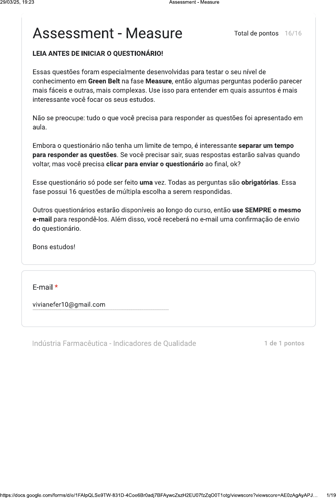 29/03/25, 19:23 Assessment Measure Assessment - Measure Total de pontos 16/16 LEIA ANTES DE INICIAR o QUESTIONÁRIO! Essas questões foram especialmente desenvolvidas para testar o seu nível de conhecimento em Green Belt na fase Measure, então algumas perguntas poderão parecer mais fáceis e outras, mais complexas. Use isso para entender em quais assuntos é mais interessante você focar os seus estudos. Não se preocupe: tudo o que você precisa para responder as questões foi apresentado em aula. Embora o questionário não tenha um limite de tempo, é interessante separar um tempo para responder as questões. Se você precisar sair, suas respostas estarão salvas quando voltar, mas você precisa clicar para enviar o questionário ao final, ok? Esse questionário só pode ser feito uma vez. Todas as perguntas são obrigatórias. Essa fase possui 16 questões de múltipla escolha a serem respondidas. Outros questionários estarão disponíveis ao longo do curso, então use SEMPRE o mesmo e-mail para respondê-los. Além disso, você receberá no e-mail uma confirmação de envio do questionário. Bons estudos! E-mail * vivianefer10@gmail.com Indústria Farmacêutica Indicadores de Qualidade 1 de 1 pontos 1/1929/03/25, 19:23 Assessment Measure Marília trabalha no setor de qualidade em uma indústria farmacêutica. *1/1 Entre as diversas tarefas atribuídas a ela, está o acompanhamento de indicadores de qualidade na produção de comprimidos de dipirona, como peso médio, teor de umidade, dureza, entre outros. Na linha de produção, existem três prensas de comprimidos, das quais Marília retira uma amostra de comprimidos de cada prensa em intervalos de 30 minutos durante seu turno de produção de 8 horas, a fim de medir o peso médio da amostra. Para realizar uma análise de dados adequada, é essencial que a coleta de dados seja bem estruturada. Com base nisso, avalie os seguintes itens: I. Não é necessário anotar o dia da coleta de cada amostra, visto que o peso médio é uma variável contínua e é analisado por meio de um histograma, o qual não depende do tempo. II. Anotar a prensa da qual saem os comprimidos amostrados é importante, pois se trata de uma variável de estratificação que enriquece a análise de dados. III. Uma vez que apenas Marília medirá os pesos médios dos comprimidos em seu turno, a criação de uma definição operacional adequada torna-se opcional. IV. É importante, para cada amostra dentro de um mesmo dia, que Marília anote sua identificação individual (que seria uma espécie de índice) para que, se necessária, possa ser rastreada futuramente. São verdadeiras as seguintes afirmações: I, e IV e IV II, III e IV | e III Indústria Farmacêutica Gráfico 1 de 1 pontos 2/1929/03/25, 19:23 Assessment - Measure Após a coleta adequada dos dados, Marília deseja analisar como os *1/1 pesos médios dos comprimidos estão distribuídos. Para essa finalidade, o gráfico mais apropriado a ser utilizado seria: Um gráfico de setores, uma vez que se trata de um gráfico de frequência que possibilita uma investigação estática dos dados. Um gráfico de Pareto, pois permite a organização dos pesos médios dos comprimidos do maior para o menor, facilitando a identificação dos pesos mais frequentes e, assim, priorizando análises futuras. Um gráfico de barras agrupadas, uma vez que possibilita a análise "de fora para dentro" da distribuição dos pesos médios estratificados por máquina de compressão. Um histograma, uma vez que se trata de uma variável contínua e permite a identificação da centralidade e da variação dos pesos médios. Um gráfico de probabilidade, visto que permite a predição das faixas de peso médio esperadas dentro de cada amostra. Indústria Farmacêutica - Histograma de Peso 1 de 1 pontos 3/1929/03/25, 19:23 Assessment - Measure Marília gerou um histograma dos dados de peso médio (vide imagem *1/1 abaixo) e obteve o seguinte resultado. A partir deste gráfico, pode-se afirmar que: Histograma de Peso 120 100 80 60 40 20 0 462,5 487,5 500,0 512.5 525.0 537,5 Peso Analisando os dados como um todo, observa-se apenas uma centralidade na distribuição dos pesos médios dos comprimidos. A distribuição característica deste gráfico pode ser resultante das distribuições individuais de cada uma das máquinas de prensa. É nítido que houve uma melhoria no processo, visto que a centralidade de cerca de 505 mg passou para 530 mg. Devido aos dois picos de centralidade neste histograma, assume-se a distribuição estatística Binomial. Verifica-se um possível outlier em 505 mg. Indústria Farmacêutica Histograma Estratificado 1 de 1 pontos 4/1929/03/25, 19:23 Assessment Measure Marília resolveu estratificar o histograma feito anteriormente em relação *1/1 às prensas de comprimido e percebeu que a distribuição dos pesos médios provenientes de cada máquina eram diferentes, como se observa na imagem abaixo. A fim de analisar a variação dos dados com o tempo, Marília pretende plotar Cartas de Controle e, para isso, ela sabe que precisa avaliar a normalidade de seus dados. Assim, avalie as seguintes afirmações: I. Com base nos histogramas estratificados apresentados, pode-se afirmar que os dados provenientes apenas das máquinas B e C seguem uma curva normal. II. A partir da análise de um Gráfico de Probabilidades, observa-se que todas as máquinas produziram dados que seguem uma distribuição normal. III. Atualmente não é mais necessário verificar a normalidade dos dados visto que os limites de controle são especificados por clientes ou normas. IV. A prensa que mais entrega comprimidos com pesos dentro dos limites especificados pelos clientes é a B. Possuindo mais de 99,79% dos dados dentro desses limites. A seguir, assinale as afirmações verdadeiras. Histograma de Peso 90 Máquina A 80 B C 70 60 50 40 30 20 10 o 462,5 475,0 487,5 500,0 512,5 525,0 537,5 550,0 Peso 5/1929/03/25, 19:23 Assessment Me
