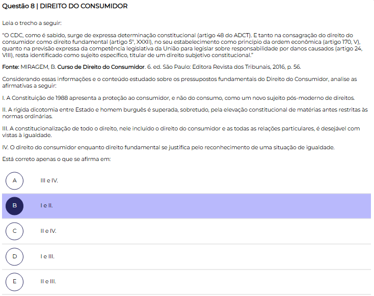 Questão 8 DIREITO DO CONSUMIDOR Leia trecho a seguir: "O CDC, como é sabido, surge de expressa determinação constitucional (artigo 48 do ADCT). E tanto na consagração do direito do consumidor como direito fundamental (artigo no seu estabelecimento como principio da ordem econômica (artigo V), quanto na previsão expressa da competência legislativa da União para legislar sobre responsabilidade por danos causados (artigo resta identificado como sujeito específico, titular de um direito subjetivo constitucional." Fonte: B. Curso de Direito do 6. ed. São Paulo: Editora Revista dos Tribunais, 2016, p. 56. Considerando essas informações e conteúdo estudado sobre os pressupostos fundamentais do Direito do Consumidor, analise as afirmativas a seguir: I. A Constituição de 1988 apresenta a proteção ao consumidor, e não do consumo, como um novo sujeito pós-moderno de II. A rigida dicotomia entre Estado e homem burguês é superada, sobretudo, pela elevação constitucional de matérias antes restritas às normas III. A constitucionalização de todo O nele direito do consumidor as todas as relações é desejável com vistas à igualdade. IV. O direito do consumidor enquanto direito fundamental se justifica pelo reconhecimento de uma situação de igualdade. Está correto apenas O que se afirma em: A III e IV. B le II. e IV. D I e III. E II e III.