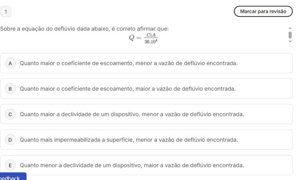 1 Marcar para revisão Sobre a equação do deflúvio dada abaixo, é correto afirmar que: = CiA A Quanto maior coeficiente de escoamento, menor a vazão de deflúvio encontrada. B Quanto maior coeficiente de escoamento, maior a vazão de deflúvio encontrada. C Quanto maior a declividade de um dispositivo, menor a vazão de deflúvio encontrada. D Quanto mais impermeabilizada a superfície, menor a vazão de deflúvio encontrada. E Quanto menor a declividade de um dispositivo, maior a vazão de deflúvio encontrada. eedback