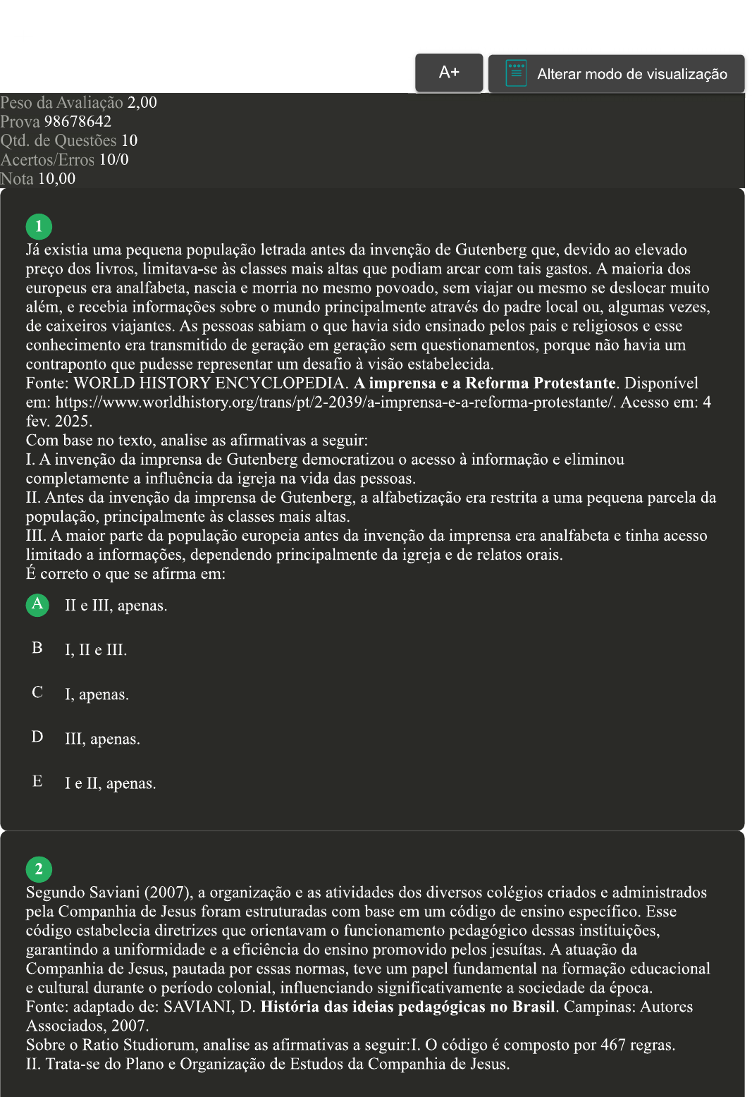A+ Alterar modo de visualização Peso da Avaliação 2,00 Prova 98678642 de Questões 10 Acertos/Erros 10/0 Nota 10,00 1 Já existia uma pequena população letrada antes da invenção de Gutenberg que, devido ao elevado preço dos livros, limitava-se às classes mais altas que podiam arcar com tais gastos. A maioria dos europeus era analfabeta, nascia e morria no mesmo povoado, sem viajar ou mesmo se deslocar muito além, e recebia informações sobre mundo principalmente através do padre local ou, algumas vezes, de caixeiros viajantes. As pessoas sabiam que havia sido ensinado pelos pais e religiosos e esse conhecimento era transmitido de geração em geração sem questionamentos, porque não havia um contraponto que pudesse representar um desafio à visão estabelecida. Fonte: WORLD HISTORY A imprensa e a Reforma Protestante. Disponível em: em: 4 fev. 2025. Com base no texto, analise as afirmativas a seguir: I. A invenção da imprensa de Gutenberg democratizou acesso à informação e eliminou completamente a influência da igreja na vida das pessoas. II. Antes da invenção da imprensa de Gutenberg, a alfabetização era restrita a uma pequena parcela da população, principalmente às classes mais altas. III. A maior parte da população europeia antes da invenção da imprensa era analfabeta e tinha acesso limitado a informações, dependendo principalmente da igreja e de relatos orais. É correto que se afirma em: A II e III, apenas. B I, II e III. C I, apenas. D III, apenas. E II, apenas. 2 Segundo Saviani (2007), a organização e as atividades dos diversos colégios criados e administrados pela Companhia de Jesus foram estruturadas com base em um código de ensino específico. Esse código estabelecia diretrizes que orientavam funcionamento pedagógico dessas instituições, garantindo a uniformidade e a eficiência do ensino promovido pelos A atuação da Companhia de Jesus, pautada por essas normas, teve um papel fundamental na formação educacional e cultural durante período colonial, influenciando significativamente a sociedade da época. Fonte: adaptado de: SAVIANI, D. História das ideias pedagógicas no Brasil. Campinas: Autores Associados, 2007. Sobre Ratio Studiorum, analise as afirmativas a seguir:I. O código é composto por 467 regras. II. Trata-se do Plano e Organização de Estudos da Companhia de Jesus.III. O Ratio Studiorum é a mesma coisa que Projeto Político Pedagógico dos dias atuais. É correto que se afirma em: A III, apenas. B I, II e III. C I, apenas. D I e II, apenas. E II e III, apenas. 3 Com as escolas urbanas, tudo muda: lugar de produção do livro, que passa do scriptorium à loja do comerciante; as formas do livro, com a multiplicação das abreviações, das descrições, das glosas e dos comentários, e próprio método de leitura, que não é mais participação no mistério da Palavra, mas decifração regrada e hierarquizada da letra (littera), do sentido (sensus) e da doutrina (sententia). As conquistas da leitura silenciosa não podem, então, ser separadas da mutação maior, que transforma a própria função da escritura. Fonte: Formas e sentido - Cultura escrita: entre distinção e apropriação. Campinas, SP: Mercado das Letras, 2003. Sobre a mudança na produção e consumo de livros e as transformações ocorridas com surgimento das escolas urbanas, analise as afirmativas a seguir: I. As escolas urbanas preservaram caráter sagrado e misterioso da leitura, associando-a exclusivamente ao estudo religioso. II. A leitura individual e silenciosa tornou-se mais comum, com foco na análise detalhada dos textos e na compreensão de seus significados. III. As escolas urbanas mantiveram a prática medieval de leitura em alta e em grupo, como forma de facilitar a compreensão dos textos. IV. A produção de livros passou a ser mais diversificada e acessível, com a expansão do comércio e a utilização de novas técnicas de escrita. É correto que se afirma em: A II e III, apenas. B I, II e III, apenas. C III e IV, apenas. D II e IV, apenas. E II, III e IV, apenas.4 No decorrer do século a cultura islâmica vivenciou um período de extraordinária abertura para as ciências e conhecimento, fomentando um ambiente intelectual sem precedentes. Nesse contexto, califa fundou em Bagdá a Casa das Ciências (Bayt al-Hikma), uma instituição que rapidamente se destacou como um dos mais renomados centros de estudos da Idade Média. Além de abrigar uma vasta e rica biblioteca. a Casa das Ciências funcionava como um local de tradução, preservação e produção de saberes, onde estudiosos de diferentes origens, incluindo muçulmanos, judeus e cristãos, trabalhavam em conjunto. Este centro promovia a tradução de obras clássicas do grego, do persa e do sânscrito para árabe, impulsionando a disseminação do conhecimento em áreas como matemática. astronomia, medicina, filosofia e literatura. A Casa das Ciências tornou-se um modelo de escola para as demais províncias do Islã, influenciando desenvolvimento de academias e bibliotecas em todo mundo islâmico e contribuindo significativamente para legado intelectual da humanidade. Fonte: adaptado de: CAMBI. F. História da Pedagogia. São Paulo: Fundação Editora da UNESP, 1999. Sobre desenvolvimento da ciência na cultura islâmica por volta do século X, analise as afirmativas a seguir: I. A Casa das Ciências em Bagdá era um local restrito aos estudiosos mais renomados, sem acesso a outros grupos sociais. II. A cultura mesmo no século X, era resistente às práticas científicas, preferindo focar em questões religiosas. III. O modelo da Casa das Ciências em Bagdá inspirou a criação de centros de estudos semelhantes em outras regiões do mundo islâmico. IV. A fundação da Casa das Ciências em Bagdá, por iniciativa do califa, foi um marco importante para desenvolvimento científico no mundo islâmico. É correto que se afirma em: A I, II e III, apenas. B III e IV, apenas
