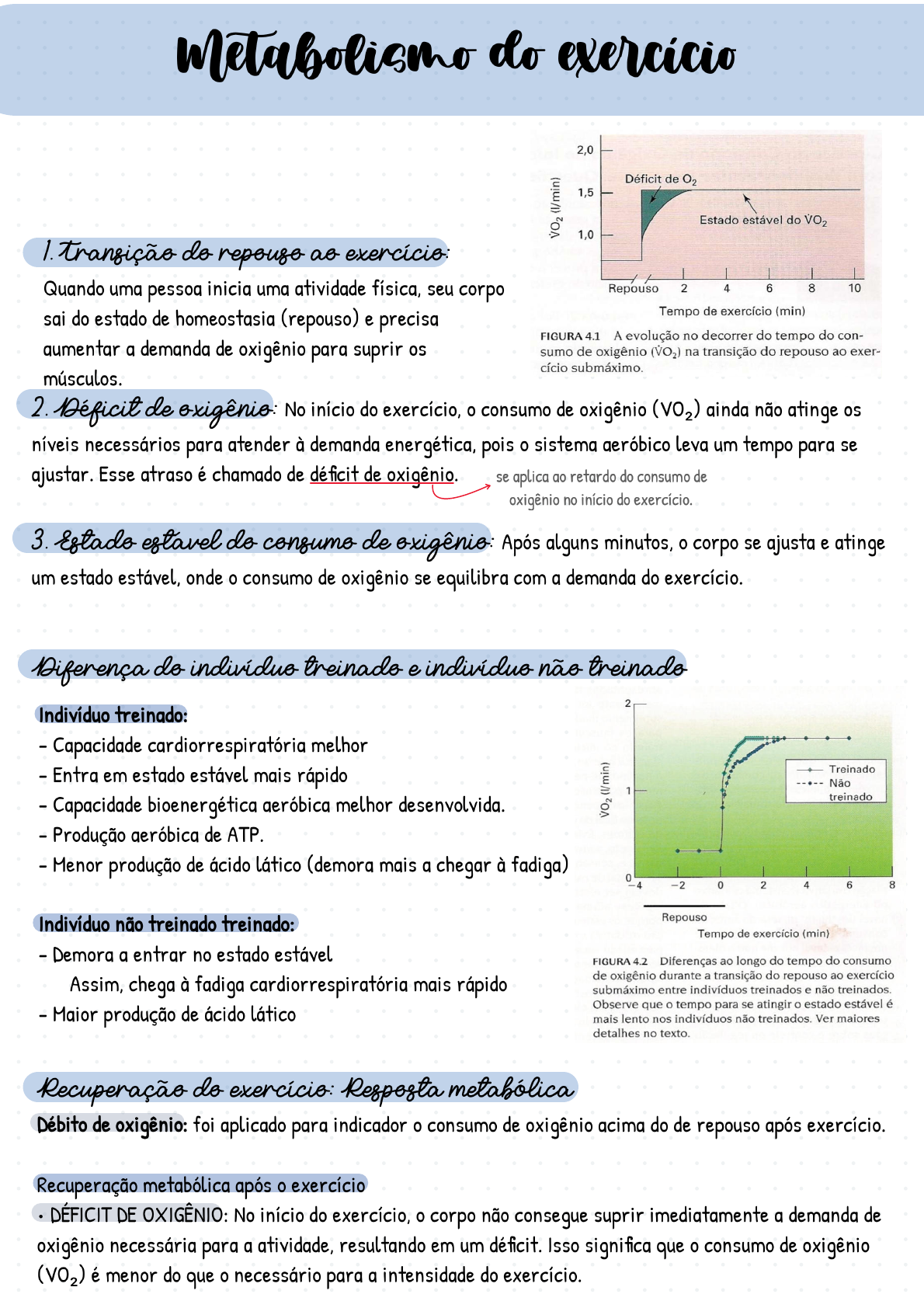 do exercício 2,0 Déficit de 1,5 Estado estável do 1,0 transição do repouse as exercício Quando uma pessoa inicia uma atividade física, seu corpo Repouso 2 4 6 8 10 sai do estado de homeostasia (repouso) e precisa Tempo de exercício (min) FIGURA 4.1 A evolução no decorrer do tempo do con- aumentar a demanda de oxigênio para suprir os sumo de oxigênio na transição do repouso ao exer- cício submáximo. músculos. 2. Déficit de No início do exercício, o consumo de oxigênio não atinge os níveis necessários para atender à demanda energética, pois o sistema geróbico leva um tempo para se ajustar. Esse atraso é chamado de déficit de oxigênio. se aplica ao retardo do consumo de oxigênio no início do exercício. 3. Estado estavel do consume de Após alguns minutos, o corpo se ajusta e atinge um estado estável, onde o consumo de oxigênio se equilibra com a demanda do exercício. Diferença do individuo treinado e individuo não treinado 2 Indivíduo treinado: Capacidade cardiorrespiratória melhor Entra em estado estável mais rápido Treinado Não 1 treinado - Capacidade bioenergética melhor desenvolvida. Produção de ATP. - Menor produção de ácido lático (demora mais a chegar à fadiga) 0 -2 0 2 4 6 8 Indivíduo não treinado treinado: Repouso Tempo de exercício (min) Demora a entrar no estado estável FIGURA 4.2 Diferenças ao longo do tempo do consumo de oxigênio durante a transição do repouso ao exercício Assim, chega à fadiga cardiorrespiratória mais rápido submáximo entre indivíduos treinados e não treinados. Observe que o tempo para se atingir o estado estável é Maior produção de ácido lático mais lento nos indivíduos não treinados. Ver maiores detalhes no texto. Recuperação do exercício: Resposta metabolica Débito de oxigênio: foi aplicado para indicador o consumo de oxigênio acima do de repouso após exercício. Recuperação metabólica após o exercício DÉFICIT DE OXIGÊNIO: No início do exercício, o corpo não consegue suprir imediatamente a demanda de oxigênio necessária para a atividade, resultando em um déficit. Isso significa que o consumo de oxigênio é menor do que o necessário para a intensidade do exercício.DÉBITO DE OXIGÊNIO: Após o término do exercício, o consumo de oxigênio permanece elevado para repor as reservas energéticas, remover metabólitos acumulados (como ácido lático) e restaurar as condições fisiológicas normais. Esse consumo extra é chamado de débito de oxigênio e pode ser dividido em duas fases: Porção rápida: Reposição imediata das reservas de oxigênio e fosfocreating. Porção lenta: Recuperação prolongada envolvendo remoção de ácido lático, restauração da temperatura corporal e ajuste hormonal. Diferença entre exercícios leves e intensos: quanto mais intenso o exercício, maior o déficit de oxigênio e mais longa a recuperação, exigindo maior tempo para restabelecer o equilíbrio metabólico. A principal diferença entre os dois gráficos está na intensidade (a) Exercício leve do exercício e seus efeitos no consumo de oxigênio: Gráfico (a) - Exercício Leve: Déficit de Estado estável do VO2 Déficit de oxigênio inicial pequeno - pois o corpo rapidamente atinge o estado estável de consumo de Porção "rápida" do débito Débito de Débito de oxigênio na recuperação é menor e se dissipa mais de repouso Porção "lenta" rapidamente. do débito Fase lenta da recuperação é curta - pois há pouca produção de Tempo de exercício Recuperação ácido lático. (b) Exercício intenso Estado estável do Déficit Porção Gráfico (b) Exercício Intenso: do débito Déficit de oxigênio inicial é maior pois o corpo demora mais Débito de para atingir o estado estável de VO2 de repouso Porção "lenta" do débito Débito de oxigênio na recuperação maior e mais prolongado pois o corpo precisa eliminar mais ácido lático e restaurar Tempo de exercício Recuperação reservas energéticas. FIGURA 4.3 Déficit e débito de oxigênio durante exer- leve/moderado (a) e intenso (b). Fase lenta da recuperação é mais longa pois há maior exigência fisiológica do exercício intenso. Recuperação após a exercício gráfico demonstra a evolução da remoção do 12 ácido lático do sangue após um exercício vigoroso. Sem exercício Exercício leve 10 Regenerativo de (35% do VO2 máx) 8 Passiva 6 FIGURA 4.4 Remoção do lactato sanguíneo A remoção de ácido lático é mais rápida se for após exercício 4 Observe que, durante a realizada com exercício leve contínuo (ativa) do 2 Nível de repouso recuperação, o ácido láctico pode ser remo- que a recuperação em repouso (passiva). vido do sangue mais Exercício 10 20 30 40 rapidamente se o indiví- intenso duo realizar um exercício Tempo de recuperação (min) leve- Isso acontece pelo fato do exercício leve aumentar a oxidação do ácido lático pelo músculo que está - Intensidade ideal para promover a remoção do ácido lático: cerca de 30%-40% do VO2 máx. (Exercícios de intensidade mais elevada podem aumentar a produção de ácido lático e impedir a remoção) Fatores que contribuem para excesso de consume de de PC (creating fosfato) no músculo. Remoção de lactato. Restauração dos estoques de oxigênio dos músculos e do sangue. Elevação da temperatura corporal. Elevação da frequência cardíaca (FC) e frequência de recuperação (FR) pós-exercício. Hormônios elevados. Respostas metabolicas as exercício: Influência da duração e da intensidade Exercícios de curta duração e de alta intensidade (de 2 a 20 segundos) a produção muscular da ATP é pelas pelo sistema ATP-CP. Exercício intenso com mais de 20 segundos depende mais da glicólise angeróbica para produzir grande qualidade de ATP necessária. Eventos de alta intensidade com mais de 45 segundos utilizam a combinação dos sistemas de ATP-CP, da glicólise e do sistema para produzir o ATP necessário