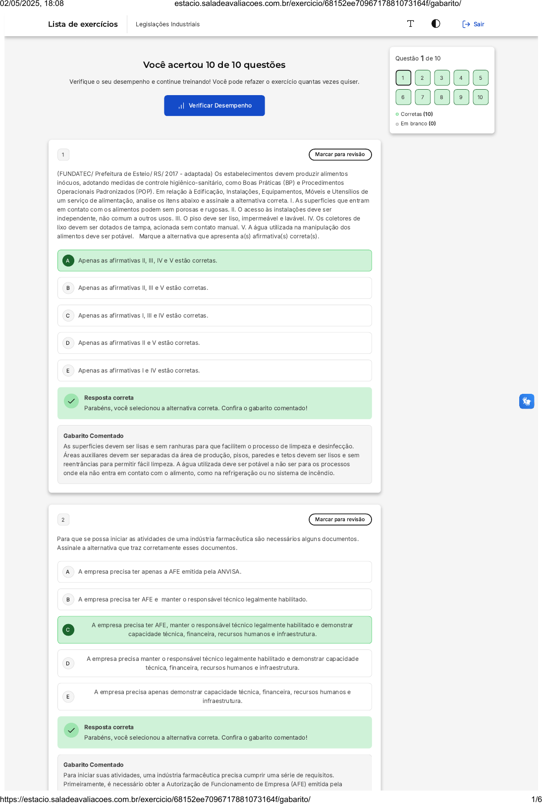 Você acertou 10 de 10 questões Verifique o seu desempenho e continue treinando! Você pode refazer o exercício quantas vezes quiser. Verificar Desempenho A B C D E A B C D E 1 Marcar para revisão (FUNDATEC/ Prefeitura de Esteio/ RS/ 2017 - adaptada) Os estabelecimentos devem produzir alimentos inócuos, adotando medidas de controle higiênico-sanitário, como Boas Práticas (BP) e Procedimentos Operacionais Padronizados (POP). Em relação à Edificação, Instalações, Equipamentos, Móveis e Utensílios de um serviço de alimentação, analise os itens abaixo e assinale a alternativa correta. I. As superfícies que entram em contato com os alimentos podem sem porosas e rugosas. II. O acesso às instalações deve ser independente, não comum a outros usos. III. O piso deve ser liso, impermeável e lavável. IV. Os coletores de lixo devem ser dotados de tampa, acionada sem contato manual. V. A água utilizada na manipulação dos alimentos deve ser potável. Marque a alternativa que apresenta a(s) afirmativa(s) correta(s). Apenas as afirmativas II, III, IV e V estão corretas. Apenas as afirmativas II, III e V estão corretas. Apenas as afirmativas I, III e IV estão corretas. Apenas as afirmativas II e V estão corretas. Apenas as afirmativas I e IV estão corretas. Resposta correta Parabéns, você selecionou a alternativa correta. Confira o gabarito comentado! Gabarito Comentado As superfícies devem ser lisas e sem ranhuras para que facilitem o processo de limpeza e desinfecção. Áreas auxiliares devem ser separadas da área de produção, pisos, paredes e tetos devem ser lisos e sem reentrâncias para permitir fácil limpeza. A água utilizada deve ser potável a não ser para os processos onde ela não entra em contato com o alimento, como na refrigeração ou no sistema de incêndio. 2 Marcar para revisão Para que se possa iniciar as atividades de uma indústria farmacêutica são necessários alguns documentos. Assinale a alternativa que traz corretamente esses documentos. A empresa precisa ter apenas a AFE emitida pela ANVISA. A empresa precisa ter AFE e manter o responsável técnico legalmente habilitado. A empresa precisa ter AFE, manter o responsável técnico legalmente habilitado e demonstrar capacidade técnica, financeira, recursos humanos e infraestrutura. A empresa precisa manter o responsável técnico legalmente habilitado e demonstrar capacidade técnica, financeira, recursos humanos e infraestrutura. A empresa precisa apenas demonstrar capacidade técnica, financeira, recursos humanos e infraestrutura. Resposta correta Parabéns, você selecionou a alternativa correta. Confira o gabarito comentado! Gabarito Comentado Para iniciar suas atividades, uma indústria farmacêutica precisa cumprir uma série de requisitos. Primeiramente, é necessário obter a Autorização de Funcionamento de Empresa (AFE) emitida pela Questão 1 de 10 Corretas (10) Em branco (0) 1 2 3 4 5 6 7 8 9 10 Lista de exercícios Legislações Industriais Sair 02/05/2025, 18:08 estacio.saladeavaliacoes.com.br/exercicio/68152ee7096717881073164f/gabarito/ https://estacio.saladeavaliacoes.com.br/exercicio/68152ee7096717881073164f/gabarito/ 1/6 A B C D E A B Agência Nacional de Vigilância Sanitária (ANVISA). Além disso, a empresa deve manter um responsável técnico que esteja legalmente habilitado, o que inclui a posse de uma certidão de regularidade técnica emitida pelo conselho da classe. Por fim, é preciso demonstrar capacidade técnica, financeira, recursos humanos e infraestrutura adequadas à atividade. Esses requisitos garantem que a empresa possa entregar um produto de qualidade e evitar danos ao meio ambiente. Portanto, a alternativa correta é a C, que menciona todos esses requisitos. 3 Marcar para revisão (IPEFAE/ Prefeitura de Águas da Prata/SP/2020 - adaptada) Os Procedimentos Operacionais Padronizados (POPs) contribuem para a garantia das condições higiênico-sanitárias necessárias na produção alimentícia. São procedimentos escritos de forma objetiva que estabelecem instruções sequenciais para a realização de operações rotineiras e específicas na produção, armazenamento e transporte de alimentos. Analise os itens abaixo e assinale a alternativa que apresente corretamente Procedimentos Operacionais Padronizados - POPs que devem ser desenvolvidos, implementados e mantidos pelos estabelecimentos produtores/industrializadores de alimentos: I. Higienização das instalações, equipamentos, móveis e utensílios. II. Higiene e saúde dos manipuladores. III. Manutenção preventiva e calibração de equipamentos. IV. Elaboração de fichas técnicas de preparo. V. Controle integrado de vetores e pragas urbanas. Marque a alternativa que apresenta a(s) afirmativa(s) correta(s). Apenas as afirmativas II, III, IV e V estão corretas. Apenas as afirmativas I, III e IV estão corretas. Apenas as afirmativas I, II, III e V estão corretas. Apenas as afirmativas II, III e V estão corretas. Apenas as afirmativas I, II, III e IV estão corretas. Resposta correta Parabéns, você selecionou a alternativa correta. Confira o gabarito comentado! Gabarito Comentado De acordo com a RDC nº 275, de 21 de outubro de 2002, os Procedimentos Operacionais Padronizados (POPs) que os estabelecimentos produtores/industrializadores de alimentos devem desenvolver, implementar e manter incluem: higienização das instalações, equipamentos, móveis e utensílios; controle da potabilidade da água; higiene e saúde dos manipuladores; manejo dos resíduos; manutenção preventiva e calibração de equipamentos; controle integrado de vetores e pragas urbanas; seleção das matérias- primas, ingredientes e embalagens; programa de recolhimento de alimentos. Portanto, as afirmativas I, II, III e V estão corretas, enquanto a afirmativa IV, que menciona a elaboração de fichas técnicas de preparo, não é mencionada na RDC nº 275 como um POP obrigatório. 4 Marcar para revisão (FAFIPA