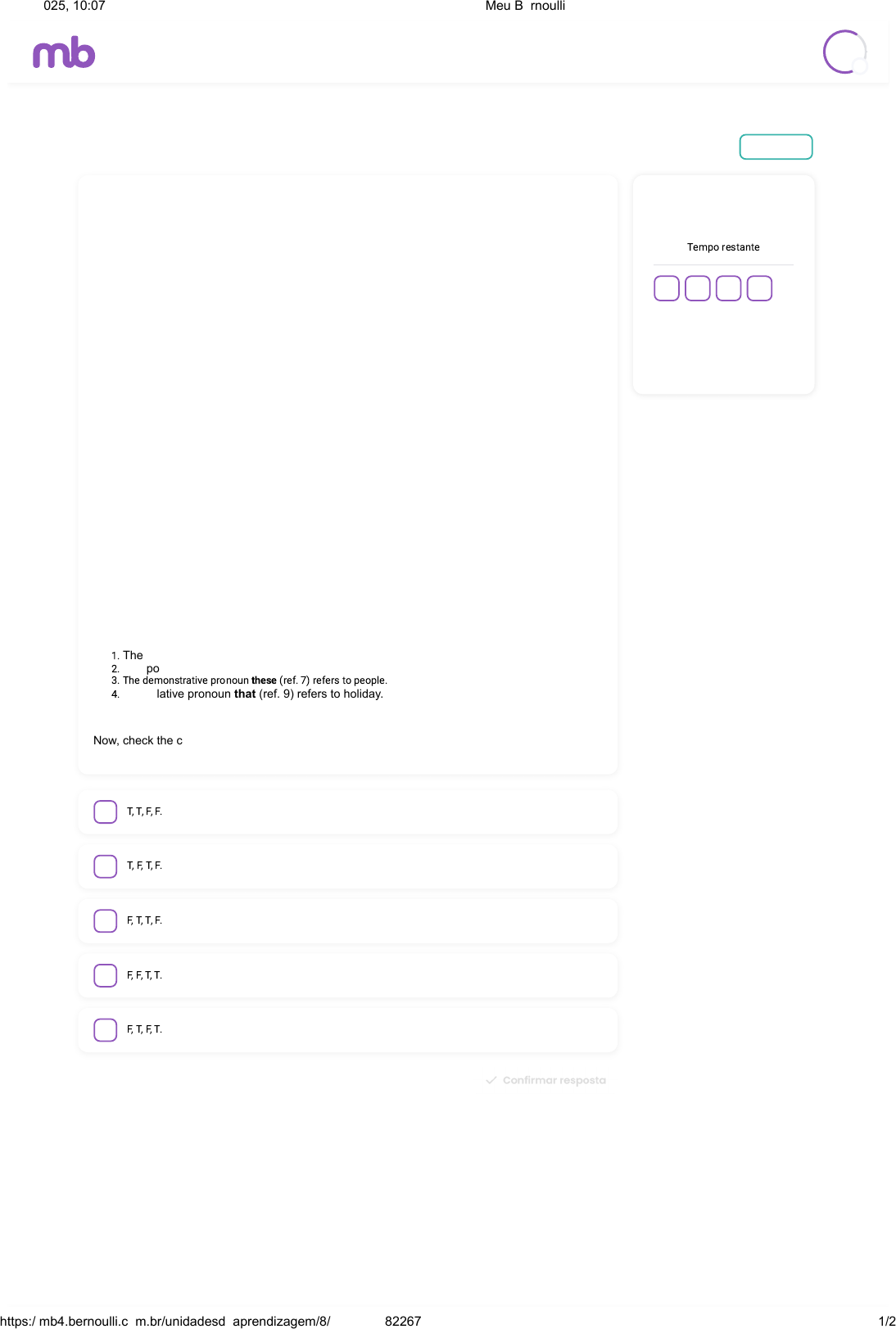 Trabalho de Língua Inglesa - 2º Bimestre Limite: 09/05/2025, 23:59 Valor: 10 pts Item 5 2 pontos SUSTAINABLE TOURISM Tourism is one of the world’s fastest growing industries and is a major source of income for many countries. Being a people-oriented industry, tourism also provides many jobs 1which have helped 2revitalise local economies. However, like other forms of development, tourism can also cause 3its share of problems, such as social 4dislocation, loss of cultural heritage, economic 5dependence and ecological 6degradation. Learning about the impacts of tourism has led many people to seek more responsible holidays. 7These include various forms of alternative or sustainable tourism such as: ‘nature-based tourism’, ‘ecotourism’ and ‘cultural tourism’. Sustainable tourism is becoming so popular that some say that what we 8presently call ‘alternative’ will be the ‘mainstream’ in a decade. All tourism activities of whatever motivation – holidays, business travel, conferences, adventure travel and ecotourism – need to be sustainable. Sustainable tourism is defined as “tourism that respects both local people and the traveller, cultural heritage and the environment”. It seeks to provide people with an exciting and educational holiday 9that is also of benefit to the people of the host country. Adapted from: http://www.unesco.org/education/tlsf/mods/theme_c/mod16.html. Access on Jul 24th, 2017. (G1 - ifba 2018) Concerning grammar reference, mark the sentences below true (T) or false (F): 1. The relative pronoun which (ref. 1) refers to economy. 2. The possessive adjective its (ref. 3) refers to tourism. 3. The demonstrative pronoun these (ref. 7) refers to people. 4. The relative pronoun that (ref. 9) refers to holiday. Now, check the correct alternative below. A T, T, F, F. B T, F, T, F. C F, T, T, F. D F, F, T, T. E F, T, F, T. Voltar Tempo restante 1 2 3 4 5 Finalizar avaliação Estudante Escola Senador… K 6 03/05/2025, 10:07 Meu Bernoulli https://mb4.bernoulli.com.br/unidadesdeaprendizagem/8/59362/1282267 1/2 https://mb4.bernoulli.com.br/ 2025 © Bernoulli Sistema de Ensino v4.24.6 Tempo restante Estudante Escola Senador… K 6 03/05/2025, 10:07 Meu Bernoulli https://mb4.bernoulli.com.br/unidadesdeaprendizagem/8/59362/1282267 2/2 https://mb4.bernoulli.com.br/