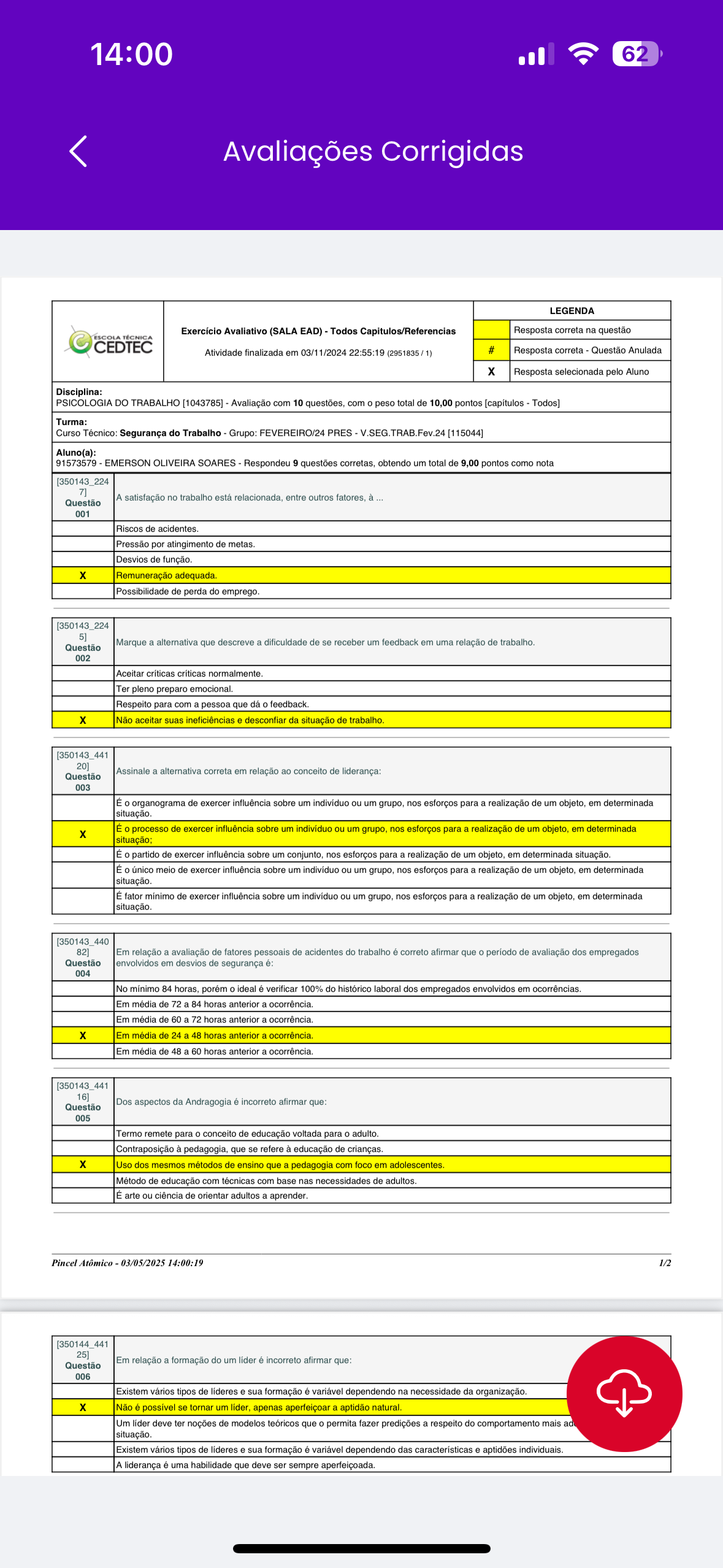 14:00 62 Avaliações Corrigidas LEGENDA Exercício Avaliativo (SALA EAD) Todos Capitulos/Referencias Resposta correta na questão ESCOLA CEDTEC Atividade finalizada em 03/11/2024 22:55:19 (2951835 1) # Resposta correta Questão Anulada X Resposta selecionada pelo Disciplina: PSICOLOGIA DO TRABALHO [1043785] Avaliação com 10 questões, com o peso total de 10,00 pontos [capítulos Todos) Turma: Curso Técnico: Segurança do Trabalho Grupo: FEVEREIRO/24 PRES [115044] Aluno(a): 91573579 EMERSON OLIVEIRA SOARES Respondeu 9 questões corretas, obtendo um total de 9,00 pontos como nota 7] Questão A satisfação no trabalho está relacionada, entre outros fatores. à 001 Riscos de Pressão por de Desvios de função. Remuneração adequada Possibilidade de perda do emprego. 5] Questão Marque a alternativa que descreve a dificuldade de se receber um feedback em uma relação de 002 Aceitar críticas normalmente. Ter pleno preparo Respeito para com a pessoa que dá o X Não aceitar suas ineficiências e desconfiar da situação de trabalho. Questão Assinale a alternativa correta em relação ao conceito de liderança: 003 É organograma de exercer influência sobre um indivíduo ou um grupo, nos esforços para a realização de um objeto, em determinada situação. processo de exercer influência sobre um ou um grupo, nos esforços para a realização de um objeto, em determinada situação; É o partido de exercer influência sobre um conjunto, nos esforços para a realização de um objeto, em determinada É único meio de exercer influência sobre um indivíduo ou um grupo, nos esforços para a realização de um objeto, em determinada situação. É fator mínimo de exercer influência sobre um indivíduo ou um grupo, nos esforços para a realização de um objeto, em determinada situação 440 82] Em relação a avaliação de fatores pessoais de acidentes do trabalho é correto afirmar que C período de avaliação dos empregados Questão envolvidos em desvios de segurança é: 004 No mínimo 84 porém o ideal é verificar 100% do histórico laboral dos empregados envolvidos em Em média de 72 a 84 horas anterior a Em média de 60 a 72 horas anterior a Em média de 24 a 48 horas anterior a Em média de 48 60 horas anterior a Questão Dos aspectos da Andragogia é incorreto afirmar que: 005 Termo remete para o conceito de educação voltada para o Contraposição à pedagogia, que se refere à educação de Uso dos mesmos métodos de ensino que a pedagogia com foco em adolescentes Método de educação com técnicas com base nas necessidades de adultos É arte ou ciência de orientar adultos a aprender. Pincel 03/05/2025 14:00:19 1/2 [350144_441 25] Questão Em relação a formação do um é incorreto afirmar que: 006 Existem vários tipos de e sua formação é variável dependendo na necessidade da organização. Não é possível se tornar um apenas a aptidão natural Um lider deve ter noções de modelos teóricos que o permita fazer predições a respeito do comportamento mais ad situação. Existem vários tipos de líderes e sua formação é variável dependendo das características e aptidões A liderança é uma habilidade que deve ser sempre aperfeiçoada.