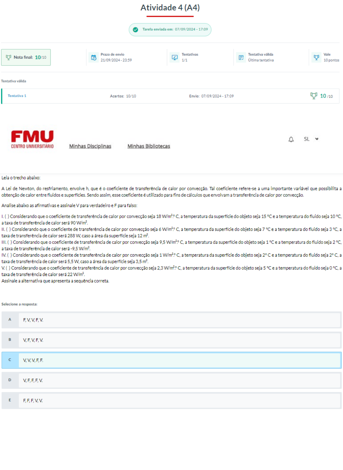 Questão 1 Leia o trecho abaixo: A Lei de Newton, do resfriamento, envolve h, que é o coeficiente de transferência de calor por convecção. Tal coeficiente refere-se a uma importante variável que possibilita a obtenção de calor entre fluidos e superfícies. Sendo assim, esse coeficiente é utilizado para fins de cálculos que envolvam a transferência de calor por convecção. Analise abaixo as afirmativas e assinale V para verdadeiro e F para falso: I. ( ) Considerando que o coeficiente de transferência de calor por convecção seja 18 W/m².° C, a temperatura da superfície do objeto seja 15 °C e a temperatura do fluido seja 10 °C, a taxa de transferência de calor será 90 W/m². II. ( ) Considerando que o coeficiente de transferência de calor por convecção seja 6 W/m².° C, a temperatura da superfície do objeto seja 7 °C e a temperatura do fluido seja 3 °C, a taxa de transferência de calor será 288 W, caso a área da superfície seja 12 m². III. ( ) Considerando que o coeficiente de transferência de calor por convecção seja 9,5 W/m².° C, a temperatura da superfície do objeto seja 1 °C e a temperatura do fluido seja 2 °C, a taxa de transferência de calor será -9,5 W/m². IV. ( ) Considerando que o coeficiente de transferência de calor por convecção seja 1 W/m².° C, a temperatura da superfície do objeto seja 2° C e a temperatura do fluido seja 2° C, a taxa de transferência de calor será 5,5 W, caso a área da superfície seja 3,5 m². V. ( ) Considerando que o coeficiente de transferência de calor por convecção seja 2,3 W/m².° C, a temperatura da superfície do objeto seja 5 °C e a temperatura do fluido seja 0 °C, a taxa de transferência de calor será 22 W/m². Assinale a alternativa que apresenta a sequência correta. Selecione a resposta: · A F, V, V, F, V. · B V, F, V, F, V. · C V, V, V, F, F. · D V, F, F, F, V. · E F, F, F, V, V. Questão 2 Leia o trecho abaixo: A transmissão de calor ou energia acontece devido à condução de calor e também ao armazenamento de energia. A convecção é a mistura que ocorre entre substâncias com temperaturas diferentes, havendo, nesse instante, a movimentação da massa em determinadas regiões de fluidos, desencadeando troca de calor entre essas regiões. De acordo com o excerto, analise as afirmativas a seguir considerando um fluido escoando sobre uma superfície qualquer: I. Em uma superfície em contato com o fluido, primeiramente temos a condução, para depois haver a convecção. II. As partículas são conduzidas por meio de correntes de convecção até a parte da superfície que tenha temperatura menor. III. As partículas mais quentes possuem maior densidade do que as partículas menos quentes que estiverem sobre a superfície. IV. Em fluidos sobre superfícies, inexistem forças de empuxo. Tais forças existiriam caso o fluido estivesse num recipiente. É correto o que se afirma em: Selecione a resposta: · A I, II, III e IV. · B II e III, apenas. · C I, II e III, apenas. · D III e IV, apenas. · E I e II, apenas. Questão 3 Leia o trecho abaixo: De acordo com DE SOUZA (2015, p.15), "o mecanismo de transferência de calor por convecção envolve escoamento de fluido combinado com difusão térmica, e é geralmente dividido em dois tipos básicos. Se o movimento do fluido surge a partir de um agente externo, por exemplo, uma ventoinha, o vento atmosférico, ou a movimentação do próprio objeto em relação ao fluido, o processo é chamado de convecção forçada. " DE SOUZA, A. L. Convecção natural e radiação em cavidade aberta preenchida com meio poroso heterogêneo. 2014. 168 f. Monografia (Graduação em Engenharia Industrial Mecânica) — Universidade Tecnológica Federal do Paraná, Curitiba, 2014. Disponível em: https://repositorio.utfpr.edu.br/jspui/bitstream/1/10282/3/CT_COEME_2014-1_27.pdf. Acesso em: 15 jun. 2022. Com base nisso, analise as alternativas a seguir e marque a correta. Selecione a resposta: · A A vibração sobre um recipiente pode causar a convecção gravitacional. · B A convecção externa é aquela que ocorre dentro de canalizações ou tubos. · C As tubulações são materiais que provocam a convecção natural. · D A bombas são equipamentos que possibilitam a convecção forçada. · E A convecção interna é aquela que ocorre sobre uma superfície qualquer. Questão 4 Leia o trecho abaixo: Quando há combinação que possibilita a transmissão de energia por meio de condução de calor, então ocorre armazenamento de energia e misturas que ocorrem pelo movimento do fluido, acontecendo, assim, a convecção. Os processos de condução e convecção são confundidos por serem parecidos, por precisarem de um meio físico para que aconteça a transferência de calor. Entretanto a diferença é que a convecção ocorre entre fluidos. Com base nisso, sobre a Lei do Resfriamento de Newton, que embasa a convecção, analise as alternativas a seguir e marque a correta. Selecione a resposta: · A Faz a distribuição de temperatura dentro do fluido. · B Trata da igualdade de temperatura e propriedades do fluido. · C Consiste na necessidade de meio físico com partículas estáticas no fluido. · D Estabelece diferença existente entre temperaturas analisadas. · E Realiza a comparação entre tipos de fluidos existentes. Questão 5 O efeito estufa se trata do aprisionamento de energia na atmosfera. A atmosfera, como o vidro da janela, é transparente à radiação visível recebida e à maior parte do infravermelho do Sol. Sobre o comportamento da atmosfera diante das várias formas de radiações, é correto afirmar que: Selecione a resposta: · A a atmosfera é opaca à energia radiante e transparente na interação com as ondas de calor. · B a atmosfera é opaca tanto para a energia radiante como para as ondas de calor. · C a atmosfera é transparente tanto para a energia radiante como para as ondas de calor. · D a atmosfera funciona co