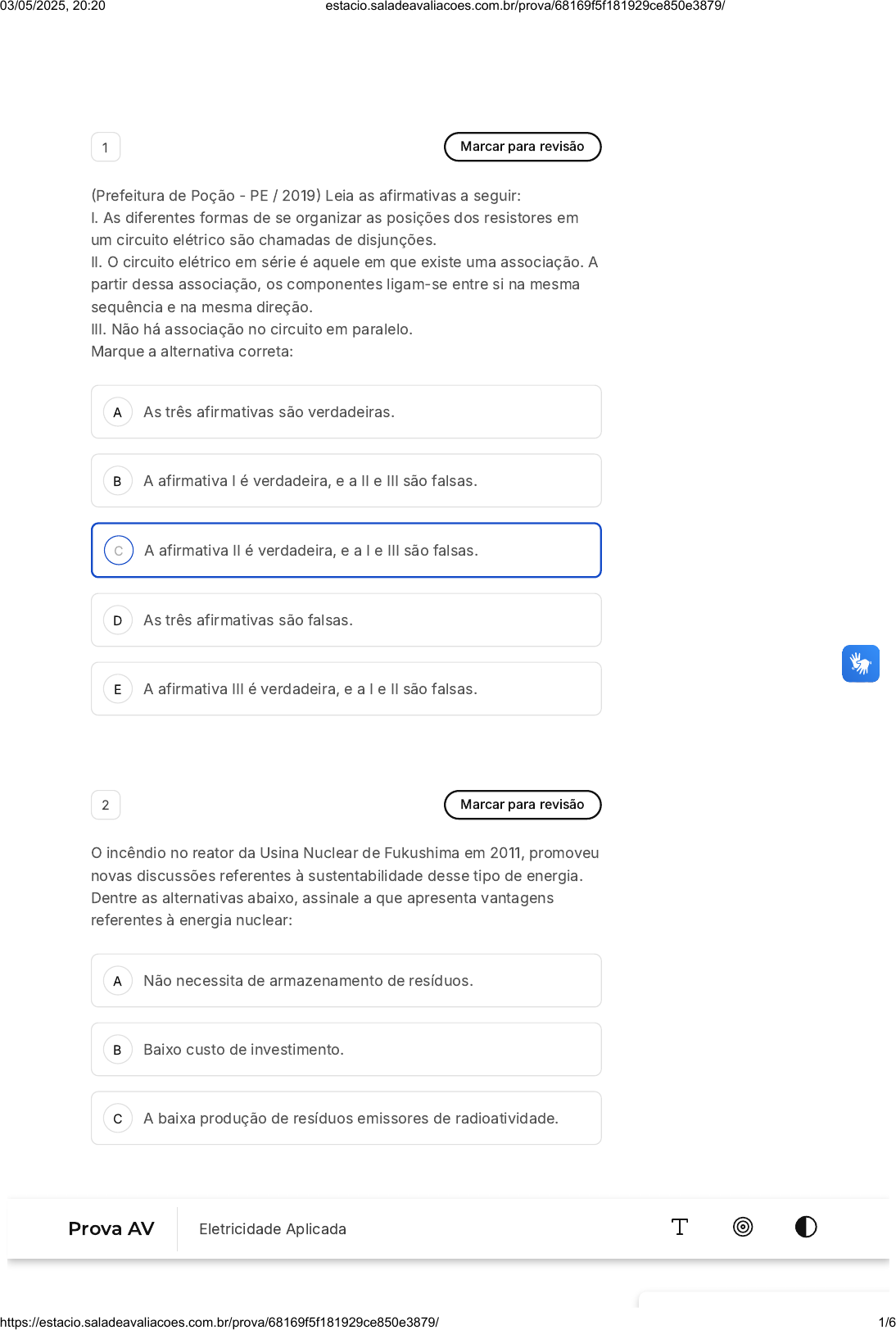 A B C D E A B C 1 Marcar para revisão (Prefeitura de Poção - PE / 2019) Leia as afirmativas a seguir: I. As diferentes formas de se organizar as posições dos resistores em um circuito elétrico são chamadas de disjunções. II. O circuito elétrico em série é aquele em que existe uma associação. A partir dessa associação, os componentes ligam-se entre si na mesma sequência e na mesma direção. III. Não há associação no circuito em paralelo. Marque a alternativa correta: As três afirmativas são verdadeiras. A afirmativa I é verdadeira, e a II e III são falsas. A afirmativa II é verdadeira, e a I e III são falsas. As três afirmativas são falsas. A afirmativa III é verdadeira, e a I e II são falsas. 2 Marcar para revisão O incêndio no reator da Usina Nuclear de Fukushima em 2011, promoveu novas discussões referentes à sustentabilidade desse tipo de energia. Dentre as alternativas abaixo, assinale a que apresenta vantagens referentes à energia nuclear: Não necessita de armazenamento de resíduos. Baixo custo de investimento. A baixa produção de resíduos emissores de radioatividade. Prova AV Eletricidade Aplicada 03/05/2025, 20:20 estacio.saladeavaliacoes.com.br/prova/68169f5f181929ce850e3879/ https://estacio.saladeavaliacoes.com.br/prova/68169f5f181929ce850e3879/ 1/6 D E A B C D E O reduzido grau de interferência nos ecossistemas locais. Não contribui para o efeito estufa por não utilizar combustíveis fósseis. 3 Marcar para revisão A primeira Lei de Kirchhoff dispõe que o somatório das correntes elétricas em um nó de circuito deve ser nulo. Dessa forma, o valor das correntes , e na figura são, em ampères, respectivamente Fonte: Autora I1 I2 I3 12, 10 e -2. 14, -12 e 10. 10, -15 e 4. 10, -14 e 5. 12, -14 e 2. 4 Marcar para revisão O princípio da linearidade pode ser aplicado na solução de circuitos ao considerar a proporcionalidade entre grandezas. Com base nesse princípio, o valor da corrente Io que circula pelo resistor de do circuito ilustrado na Figura 42, é de: 6Ω 00 hora : 27 min : 00 seg Ocultar Questão 3 de 10 Respondidas (10) Em branco (0) Finalizar prova 1 2 3 4 5 6 7 8 9 10 03/05/2025, 20:20 estacio.saladeavaliacoes.com.br/prova/68169f5f181929ce850e3879/ https://estacio.saladeavaliacoes.com.br/prova/68169f5f181929ce850e3879/ 2/6 A B C D E A B C D E Figura 42: Simulado - Exercício 5 - Fonte: Isabela Oliveira Guimarães 2,5 A 1,0 A 2,0 A 1,5 A 3,0 A 5 Marcar para revisão Considere o circuito elétrico ilustrado na Figura 38. O valor da corrente que flui pelo resistor de é de, aproximadamente: Figura 38: Simulado - Exercício 1 - Fonte: Isabela Oliveira Guimarães R1 2Ω 3,0 A 2,5 A 4,5 A 3,5 A 4,0 A 6 Marcar para revisão (Prefeitura de Poção - PE / 2019) Leia as afirmativas a seguir: 03/05/2025, 20:20 estacio.saladeavaliacoes.com.br/prova/68169f5f181929ce850e3879/ https://estacio.saladeavaliacoes.com.br/prova/68169f5f181929ce850e3879/ 3/6 A B C D E A B C D E I. Os resistores, ou resistências, são componentes do circuito elétrico que podem converter a energia elétrica em energia térmica. II. A potência elétrica é a velocidade com que o equipamento converte a energia elétrica em trabalho. III. A resistência varia com a temperatura. Marque a alternativa correta: As três afirmativas são verdadeiras. A afirmativa I é verdadeira, II e III são falsas. As afirmativas II e III são verdadeiras, e a I é falsa. As três afirmativas são falsas. As afirmativas I e II são verdadeiras, e III é falsa. 7 Marcar para revisão O valor do resistor na figura é de Fonte: Autora R2 1Ω. 2,5Ω. 2Ω. 3Ω. 3,5Ω. 03/05/2025, 20:20 estacio.saladeavaliacoes.com.br/prova/68169f5f181929ce850e3879/ https://estacio.saladeavaliacoes.com.br/prova/68169f5f181929ce850e3879/ 4/6 A B C D E A B C 8 Marcar para revisão (MPE - MS / 2013) Um equivalente de Thévenin composto por uma fonte de 50V em série com um resistor de 10Ω pode ser substituído por uma fonte de corrente de: 5A em série com uma resistência de 10Ω. 5A em paralelo com uma resistência de 10Ω. 10A em série com uma resistência de 5Ω. 10A em paralelo com uma resistência de 5Ω. 10A em série com uma resistência de 10Ω. 9 Marcar para revisão A aplicação de métodos de análise como Método dos Nós e Método das Malhas em um circuito permite calcular as variáveis do problema, como tensão e corrente. Com base no método dos nós e a Lei de Kirchhoff das correntes, a equação que melhor representa o nó 1 do circuito da figura é Fonte: Alexander; Sadiku (2013, p. 99) 2 + = + v1−12 3 v1 6 v2−v1 4 2 + = + 12−v1 3 v1 6 v1−v2 4 2 + = + 12−v1 6 v2 4 v1−v2 3 03/05/2025, 20:20 estacio.saladeavaliacoes.com.br/prova/68169f5f181929ce850e3879/ https://estacio.saladeavaliacoes.com.br/prova/68169f5f181929ce850e3879/ 5/6 D E A B C D E 2 = + + v1−12 3 v2 4 v1−v2 6 + = 2 + 12−v2 3 v1 6 v2−v1 4 10 Marcar para revisão (ABIN / 2018) Considere que todos os componentes do circuito sejam ideais e que E1 = 10V, E2 = 2V, R1 = R2 = 4kΩ, R3 = R4 = 2kΩ. Com relação a esse circuito, julgue os itens seguintes. Utilizando o teorema de Norton, calcule a resistência equivalente RN vista do ponto AB do circuito. R=0,2kΩ R=1kΩ R=2kΩ R=3kΩ R=4kΩ 03/05/2025, 20:20 estacio.saladeavaliacoes.com.br/prova/68169f5f181929ce850e3879/ https://estacio.saladeavaliacoes.com.br/prova/68169f5f181929ce850e3879/ 6/6