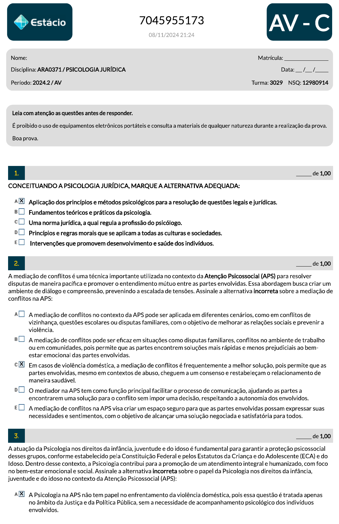 Estácio 7045955173 AV - 08/11/2024 21:24 Nome: Matrícula: Disciplina: ARA0371 / PSICOLOGIA JURÍDICA Data: / / Período: 2024.2 / AV Turma: 3029 NSQ: 12980914 Leia com atenção as questões antes de responder. É proibido o uso de equipamentos eletrônicos portáteis e consulta a materiais de qualquer natureza durante a realização da prova. Boa prova. 1. de 1,00 CONCEITUANDO A PSICOLOGIA JURÍDICA, MARQUE A ALTERNATIVA ADEQUADA: A Aplicação dos princípios e métodos psicológicos para a resolução de questões legais e jurídicas. B Fundamentos teóricos e práticos da psicologia. Uma norma jurídica, a qual regula a profissão do psicólogo. D Princípios e regras morais que se aplicam a todas as culturas e sociedades. E Intervenções que promovem desenvolvimento e saúde dos indivíduos. 2. de 1,00 A mediação de conflitos é uma técnica importante utilizada no contexto da Atenção Psicossocial (APS) para resolver disputas de maneira pacífica e promover o entendimento mútuo entre as partes envolvidas. Essa abordagem busca criar um ambiente de diálogo e compreensão, prevenindo a escalada de tensões. Assinale a alternativa incorreta sobre a mediação de conflitos na APS: A A mediação de conflitos no contexto da APS pode ser aplicada em diferentes cenários, como em conflitos de vizinhança, questões escolares ou disputas familiares, com o objetivo de melhorar as relações sociais e prevenir a violência. B A mediação de conflitos pode ser eficaz em situações como disputas familiares, conflitos no ambiente de trabalho ou em comunidades, pois permite que as partes encontrem soluções mais rápidas e menos prejudiciais ao bem- estar emocional das partes envolvidas. Em casos de violência doméstica, a mediação de conflitos é frequentemente a melhor solução, pois permite que as partes envolvidas, mesmo em contextos de abuso, cheguem a um consenso e restabeleçam o relacionamento de maneira saudável. D O mediador na APS tem como função principal facilitar o processo de comunicação, ajudando as partes a encontrarem uma solução para o conflito sem impor uma decisão, respeitando a autonomia dos envolvidos. E A mediação de conflitos na APS visa criar um espaço seguro para que as partes envolvidas possam expressar suas necessidades e sentimentos, com o objetivo de alcançar uma solução negociada e satisfatória para todos. 3. de 1,00 A atuação da Psicologia nos direitos da infância, juventude e do idoso é fundamental para garantir a proteção psicossocial desses grupos, conforme estabelecido pela Constituição Federal e pelos Estatutos da Criança e do Adolescente (ECA) e do Dentro desse contexto, a Psicologia contribui para a promoção de um atendimento integral e humanizado, com foco no bem-estar emocional e social. Assinale a alternativa incorreta sobre o papel da Psicologia nos direitos da infância, juventude e do idoso no contexto da Atenção Psicossocial (APS): A A Psicologia na APS não tem papel no enfrentamento da violência doméstica, pois essa questão é tratada apenas no âmbito da Justiça e da Política Pública, sem a necessidade de acompanhamento psicológico dos indivíduos envolvidos.B No contexto da APS, os psicólogos devem estar preparados para lidar com as especificidades do envelhecimento, promovendo intervenções que visem à qualidade de vida do idoso e à prevenção de distúrbios emocionais e psíquicos decorrentes do envelhecimento. No atendimento ao idoso, a Psicologia também atua no acolhimento e na promoção do envelhecimento saudável, incluindo a valorização do idoso como sujeito de direitos, com ênfase no enfrentamento de situações de abandono e negligência. D A Psicologia desempenha um papel crucial na promoção dos direitos da infância e da juventude, especialmente no que diz respeito à proteção contra abusos e à garantia de um ambiente seguro e saudável para o desenvolvimento integral das crianças e adolescentes. E A atuação da Psicologia no atendimento a crianças e adolescentes em situação de risco inclui a escuta qualificada e o acompanhamento psicoterapêutico, visando o fortalecimento da rede de proteção e a garantia de seus direitos. 4. de 1,00 A Psicologia e o Direito de Família caminham juntas para promover soluções justas e adequadas nas questões familiares, especialmente em casos que envolvem disputas de guarda, visitas, e adoção, ou quando há conflitos familiares que impactam o bem-estar das crianças e dos adultos. Considerando a atuação da Psicologia no Direito de Família, assinale a alternativa incorreta: A A intervenção psicológica também pode ser importante em processos de adoção, auxiliando na avaliação da adaptação das crianças e dos adotantes, bem como na análise do vínculo afetivo e na adequação do ambiente familiar para a criança. B A Psicologia no Direito de Família atua exclusivamente na área da avaliação psicológica, sem se envolver em processos terapêuticos que possam ajudar na mediação de conflitos familiares. Em situações de violência doméstica, os psicólogos podem ser chamados a avaliar a vítima e o agressor, a fim de fornecer informações sobre o impacto psicológico da violência e as necessidades de intervenção para a proteção e reabilitação das partes envolvidas. D Em casos de guarda de filhos, a atuação de psicólogos pode ser fundamental para avaliar as necessidades emocionais e psicológicas das crianças, além de ajudar a entender qual ambiente familiar é mais favorável ao seu desenvolvimento saudável. E A Psicologia Jurídica no Direito de Família auxilia na avaliação do comportamento dos membros da família, considerando fatores como a dinâmica familiar e o impacto emocional das decisões legais no bem-estar das crianças e adultos envolvidos. 5. de 1,00 A Psicologia desempenha um papel fundamental na compreensão e intervenção em casos de violência, seja no apoio às vítimas ou no tr