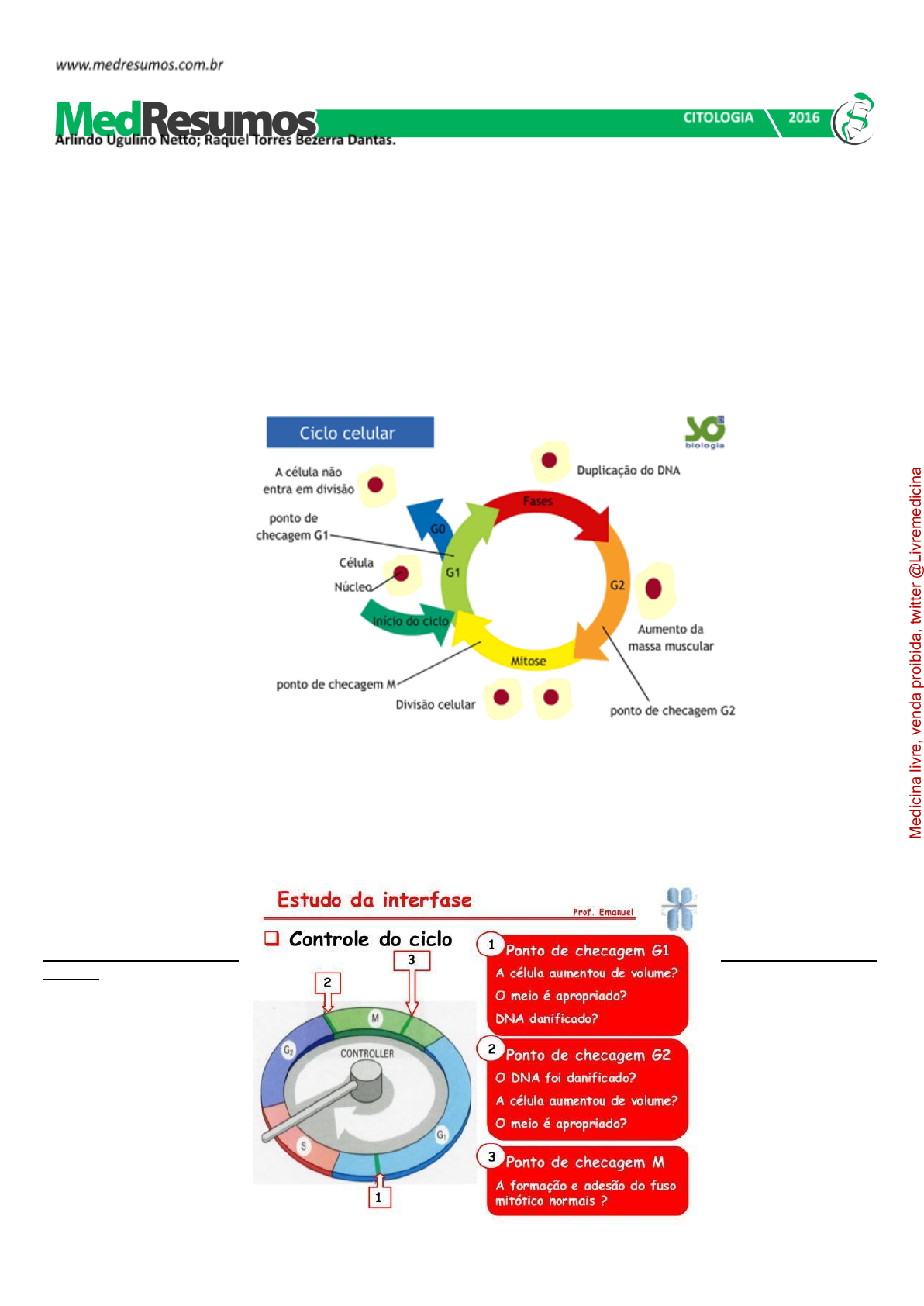 Arlindo Ugulino Netto ● MEDRESUMOS 2016 ● CITOLOGIA CICLO CELULAR O ciclo celular é uma sequência ordenada de eventos com o intuito de haver uma duplicação do material genético e divisão em duas células novas. É o principal processo de reprodução dos seres vivos. Além da reprodução, o ciclo celular ocorre em substituição de células, proliferação e apoptose. Ele é dividido em duas fases: ● Intérfase: período em que tanto o crescimento celular como a replicação do DNA ocorre de maneira mais ordenada na preparação para divisão celular. É dividida em três fases: o Fase G1: Crescimento celular (tempo gasto: 11 horas) o Fase S: Duplicação do DNA (tempo gasto: 8 horas) o Fase G2: Crescimento celular e síntese proteica (tempo gasto: 4 horas) ● Mitose: ocorre a separação dos cromossomos filhos e finaliza com a divisão celular (tempo gasto: 1 hora) OBS1: O estágio G0 corresponde ao estágio em que a célula entra em divisão. Há células que permanecem no estágio G0 por tempo indeterminado, mas que estão metabolicamente ativas, apenas não se proliferam mais, a menos que chamadas para tal por sinais extracelulares apropriados. Exemplo dessas células são os neurônios e as hemácias. Em cada fase há o ponto de checagem para regular o processo impedindo que células com material genético não replicado ou com defeito seja repassado para células-filhas. SITEMA DE CONTROLE DO CICLO CELULAR O ciclo celular é controlado e acompanhado pelas ciclinas (reguladora mitótica ou G1) e pelas proteinoquinases [dependentes de ciclinas (CDK), com ação de proliferação]. Essas CDK (proteinoquinases dependentes de ciclinas) controlam o sistema do processo de divisão, observando se é para a célula parar ou continuar a divisão. As ciclinas sofrem acumulação (ativam a CDK correspondente) e degradação periódicas (via ubiquitina-proteossoma). 1 M ed ic in a liv re , v en da p ro ib id a, tw itt er @ Li vr em ed ic in a Arlindo Ugulino Netto ● MEDRESUMOS 2016 ● CITOLOGIA A ciclina sozinha não consegue ativar a CDK, para isso tem que haver fosforilação e desfosforilação em sítios específicos para tornarem-se enzimaticamente ativas. A síntese de ciclinas e a presença de fatores de crescimento estão relacionadas, por isso se não houver um fator de crescimento, haverá uma deficiência de ciclinas decorrendo em um bloqueio no ciclo celular e a célula entra em G0. MITOSE A mitose caracteriza-se pela condensação dos cromossomos, ocorrendo devido a fosforilação da histona 1. As consequências observadas neste processo são: ✔ Acúmulo de ciclinas e sua ligação para formar o fator protetor de maturação (MPF). ✔ A condensação do material genético é realizada por condensinas, proteínas fosforiladas por CDK1.A citocinese gerada pela desativação do MPF coordena a divisão citoplasmática e nuclear da célula. FASES DA MITOSE Admite-se que o processo durante o qual ocorrem transformações que levam à divisão da célula, dando origem a duas outras com o mesmo número de cromossomos, com seis fases: ✔ Prófase 2 M ed ic in a liv re , v en da p ro ib id a, tw itt er @ Li vr em ed ic in a Arlindo Ugulino Netto ● MEDRESUMOS 2016 ● CITOLOGIA ✔ Prometáfase ✔ Metáfase ✔ Anáfase ✔ Telófase ✔ Citocinese PRÓFASE No início da mitose, numa célula diploide, o centrossomo e os cromossomos encontram-se duplicados. Na prófase os cromossomos começam a se condensar, tornando-se visíveis ao microscópio óptico. Cada cromossomo é constituído por dois cromatídeos unidos pelo centrômero, chamados cromossomos dicromatídeos. Depois, os centríolos deslocam-se para polos opostos da célula, iniciando-se, entre eles, a formação do fuso acromático ou fuso mitótico. Entretanto, o invólucro nuclear desorganiza-se e os nucléolos desaparecem. Essencial para a divisão dos cromossomos. PROMETÁFASE A dissolução do envelope nuclear em fragmentos e seu desaparecimento marca o início da segunda fase da mitose, a prometáfase. Os microtúbulos que emergem dos centrossomas nos polos do aparelho mitótico atingem os cromossomas, agora condensados. Na região do centrômero, cada cromátide irmã possui uma estrutura proteica denominada cinetócoro. Alguns dos microtúbulos do aparelho ligam-se ao cinetócoro, arrastando os cromossomas. Outros microtúbulos do aparelho fazem contato com os microtúbulos vindos do polo oposto. As forças exercidas por motores proteicos associados a estes microtúbulos do aparelho movem o cromossoma até ao centro da célula. Já se tornam visíveis por meio do microscópio óptico. METÁFASE A metáfase é a fase mitótica em que os centrômeros dos cromossomos estão ligados às fibras cinetocóricas que provêm dos centríolos, que se ligam aos microtúbulos do fuso mitótico. É a fase mais estável da mitose. Os cromatídeos tornam-se bem visíveis e logo em seguida se partem para o início da anáfase. É nesta altura da mitose que os cromossomos condensados alinham-se no centro da célula, formando a chamada placa metafásica ou placa equatorial, antes de terem seus centrômeros duplicados e da ocorrência do encurtamento das fibras cinetocóricas pelas duas células-filhas, fazendo com que cada cromátide-irmã vá para cada polo das células em formação. Essa é a etapa em que os estudos do cariótipo são realizados, pois os cromossomos estão totalmente condensados, tornando-se visíveis. ANÁFASE O centrômero duplica-se, separando dois cromatoplastídeos que passam a formar dois cromossomos independentes. As fibrilas ligadas a estes dois cromossomos encolhem, o que faz com que estes se afastem e migrem para polos opostos da célula - ascensão polar dos cromossomos-filhos. O que leva a que no final, em ambos os polos haja o mesmo número de cromossomos, com o mesmo conteúdo genético e igual ao da célula mãe. TELÓFASE Na Telófase os cromossomos se descondensam, os cromossomos filho