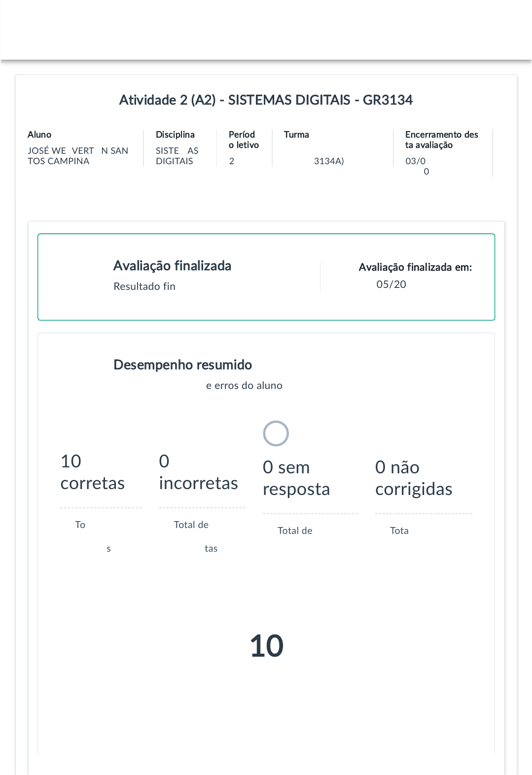 Respostas Desempenho do aluno Atividade 2 (A2) - SISTEMAS DIGITAIS - GR3134 Aluno JOSÉ WEYVERTON SAN TOS CAMPINA Disciplina SISTEMAS DIGITAIS Períod o letivo 20251 Turma SISTEMAS DIGITAIS (2 51GGR3134A) Encerramento des ta avaliação 03/06/2025 - 23: 59:00 Avaliação finalizada Resultado final Avaliação finalizada em: 04/05/2025 - 10:39:41 Desempenho resumido Resumo de acertos e erros do aluno 10 corretas Total de questões corretas 0 incorretas Total de questões incorretas 0 sem resposta Total de questões sem resposta 0 não corrigidas Total de questões não corrigidas 10 Nota final Nome do aluno Total de questões Questões objetivas Acertos em objetivas Valor da avaliação Nota final JOSÉ WEYVERTON SANTOS CAMPINA 10 10 10 10 10 Questão em detalhes Gabarito e respostas das questões Teoricamente, nos sistemas lógicos digitais utilizamos os valores lógicos “0”, “1” e “X”. Porém, na prática, podemos encontrar exemplos de utilização do valor “Z”. Para essa questão, preencha as definições abaixo associando-as com os valores lógicos “0”, “1”, “X” e “Z”: ( ) Identifica casos nos quais uma certa informação é irrelevante para o resultado da expressão lógica e, consequentemente, para o circuito. ( ) Geralmente associado à alimentação “+Vcc”. ( ) Estado de alta impedância. Questão 1 Questão objetiva 1 /1 ( ) Geralmente associado ao “terra” do circuito (GND – Ground) Assinale a alternativa que contenha a sequência correta dos valores lógicos: A .X ; 1; Z ; 0. Resposta correta B .Z ; 1; X ; 0. C .X ; 0; Z ; 1. D .X ; 1; 0 ; Z. E .0 ; Z; 1 ; X. Suponha a necessidade de implementar o sistema de controle de atitude do satélite TupiniSat. Controle de atitude de um satélite consiste em deixá-lo, por exemplo, sempre perpendicular à Terra em um satélite geoestacionário. No caso do TupiniSat, é utilizada uma “roda de reação”. Pela lei da física de ação-reação, quando o volante acoplado ao motor acelera a um certo sentido, o satélite acelera no sentido contrário. Para tanto, o valor da posição do satélite em relação ao eixo da Terra é coletado através de um magnetrômetro (mede intensidade de um campo magnético). Suponha que o sinal do magnetrômetro já se encontra condicionado dentro de uma escala de -3 a 3. Faça um circuito para corrigir a atitude do satélite. Para essa questão, suponha que a escala de entrada seja representada pelas variáveis “A”, “B” e “C”. O circuito terá duas variáveis de saída indicando “ativação” (“At” – quando “At” receber “0”, indica sem movimentação) e “sentido” (“S” – para valores negativos na escala, “S” receberá “0” e, para valores positivos, “S” estará sinalizado com “1”. ). Assinale a alternativa que contenha as expressões simplificadas de “At” e “S”: Questão 2 Questão objetiva 1 /1 A .At = B + C ; S = ~A + ~B.~C. D .At = B + C ; S = ~A. Resposta correta B .At = ~(B + C) ; S = ~A. C .At = B + C ; S = A. E .At = B.C ; S = ~A. Suponha que você foi incumbido de implementar um circuito de aviso da não colocação do conto de segurança em um carro. Para tanto, neste caso, o circuito analisará apenas o assento do motorista ativando a saída apenas quando o carro estiver ligado, o motorista estiver sentado no banco e o cinto não estiver colocado. Para essa questão, use como variáveis: “L” para o carro ligado, “M” para o motorista e “C” para o cinto. Assinale a alternativa que contenha expressão que represente o circuito: B .S = L.P.~C. Resposta correta Questão 3 Questão objetiva 1 /1 A .S = L + P + ~C. C .S = L.P.C. D .S = ~L.P.~C. E .S = L.~P.C. Para o processo de simplificação de expressões booleanas, pode-se utilizar o mapa de Karnaugh. Essa técnica consiste em ferramenta visual na forma de uma matriz. Para tanto, deve-se seguir uma sequência de ações. Para essa questão, enumere as etapas a seguir de modo a representar a sequência correta de ações a serem feitas durante a manipulação do mapa de Karnaugh. ( ) Eliminar as variáveis que apareçam de forma complementada. ( ) Formar agrupamentos de elementos “1”. ( ) Transcrever a parcela para a expressão resultante. ( ) Transcrever os valores “1” da coluna de saída da tabela-verdade. Assinale a alternativa que contenha a sequência correta de operações: C .3 ; 2; 4; 1. Resposta correta Questão 4 Questão objetiva 1 /1 A .1 ; 4; 2; 3. B .3 ; 4; 2; 1. D .1 ; 2; 4; 3. E .2 ; 3; 4; 1. Suponha que exista a necessidade de proteger uma horta em condições de chuva ou de sol excessivo. A proteção consiste em ativar uma cobertura retrátil que irá ser fechada ou aberta. Para tanto, suponha que existam as seguintes variáveis: Questão 5 Questão objetiva 1 /1 L = quando “1”, indica que há sol excessivo C = quando “1” indica chuva em excesso Aberto = quando “1” significa que a cobertura está aberta, deixando a horta exposta Fechado = quando “1” significa que a cobertura está fechada, deixando a hora protegida. As variáveis “Aberto” e “Fechado” nunca poderão assumir o valor “1” simultaneamente. Como saídas, suponha que existam duas variáveis: “ABRE” para indicar a ação de abrir a cobertura (ativar a abertura no nível “1”) e “FECHA” – quando assumido o valor “1”, indica que a ação de fechamento da cobertura, protegendo a horta, está em execução. Assinale a alternativa que contenha as expressões relativas de “ABRE” e “FECHA”: A .ABRE = ~L.~C.~Aberto ; FECHA = (L + C).~Fechado. Resposta correta B .ABRE = ~L.~C.Aberto ; FECHA = (L + C).~Fechado. C .ABRE = ~L.~C.~Aberto ; FECHA = (L + C).Fechado. D .ABRE = (~L+~C).~Aberto ; FECHA = (L + C).~Fechado. E .ABRE = ~L.~C.~Aberto ; FECHA = (~L + ~C).~Fechado. Para se extrair uma expressão booleana pode-se realizar etapas de modo a obter uma expressão na forma de “soma de produtos” ou na forma de