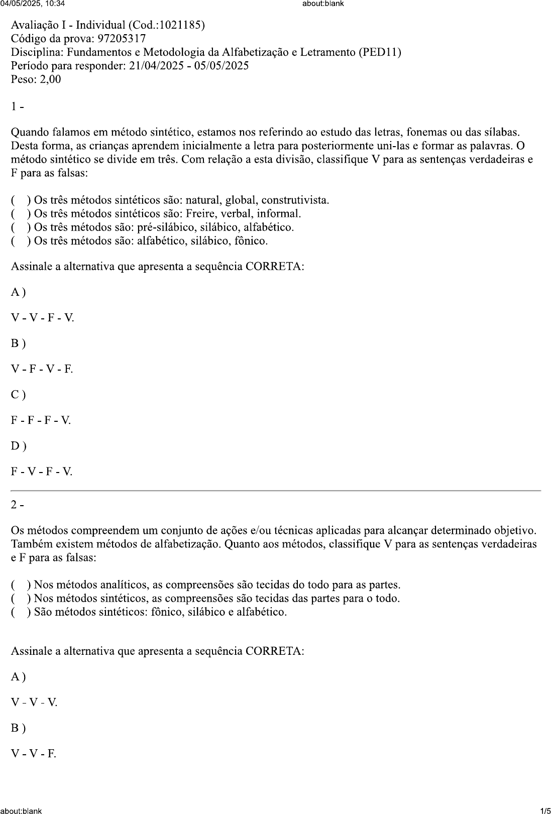 04/05/2025, 10:34 about:blank Avaliação I - Individual (Cod.:1021185) Código da prova: 97205317 Disciplina: Fundamentos e Metodologia da Alfabetização e Letramento (PED11) Período para responder: 21/04/2025 05/05/2025 Peso: 2,00 Quando falamos em método sintético, estamos nos referindo ao estudo das letras, fonemas ou das sílabas. Desta forma, as crianças aprendem inicialmente a letra para posteriormente uni-las e formar as palavras. O método sintético se divide em três. Com relação a esta divisão, classifique V para as sentenças verdadeiras e F para as falsas: ( ) Os três métodos sintéticos são: natural, global, construtivista. ( ) Os três métodos sintéticos são: Freire, verbal, informal. ( ) Os três métodos são: pré-silábico, silábico, alfabético. ( ) Os três métodos são: alfabético, silábico, fônico. Assinale a alternativa que apresenta a sequência CORRETA: A) V-F-V-F C) D) 2 Os métodos compreendem um conjunto de ações e/ou técnicas aplicadas para alcançar determinado objetivo. Também existem métodos de alfabetização. Quanto aos métodos, classifique V para as sentenças verdadeiras e F para as falsas: ( ) Nos métodos analíticos, as compreensões são tecidas do todo para as partes. ( ) Nos métodos sintéticos, as compreensões são tecidas das partes para o todo. ( ) São métodos sintéticos: fônico, silábico e alfabético. Assinale a alternativa que apresenta a sequência CORRETA: A) B) about:blank 1/504/05/2025, 10:34 about:blank C) D) Ao longo da história da educação brasileira, diferentes métodos para se alfabetizar foram e ainda são aplicados. De acordo com os estudos sobre esses métodos, classifique V para as sentenças verdadeiras e F para as falsas: ( ) O método silábico é o mais eficaz dentre todos, devendo ser lei no país que os docentes apliquem suas estratégias ao ensinar a língua escrita. ( ) Os métodos sintéticos priorizam a aprendizagem técnica do ler e do escrever, carecendo de mais recursos que contextualizem a escrita ao cotidiano do alfabetizando. ( ) Não há um método ideal para se ensinar a ler e a escrever, devendo o professor ter um bom conhecimento teórico e metodológico, para então desenvolver sua ação didática. ( ) O analfabetismo no Brasil persiste em números preocupantes, pois as faculdades de pedagogia do país não ensinam, com eficiência, métodos de alfabetização para os graduandos. Assinale a alternativa que apresenta a sequência CORRETA: A) B) V-F-F-V C) D) Métodos Analíticos são aqueles que norteiam o início do processo de alfabetização partindo das maiores unidades da língua: palavras, frases ou textos. Esses métodos privilegiam a compreensão do sentido textual, para então envolver o aluno no trabalho grafo-fonêmico da língua, ou seja, levá-lo ao entendimento do valor sonoro das sílabas e letras. Mediante o exposto, podemos destacar que os Métodos Analíticos são três. Quais são os 3 Métodos Analítcos? Assinale a alternativa CORRETA: A) Método de Soletração, Alfabético e silábico. sentenciação e global de contos. about:blank 2/504/05/2025, 10:34 about:blank C) Método silábico, palavração e global de contos. D ) Método fônico, sentenciação e de contos. No processo de alfabetização, o professor faz uso de vários métodos quem compõem sua didática. Método refere-se à soma de ações baseadas em um conjunto coerente de princípios ou de hipóteses que respondem a objetivos determinados. Com relação às vertentes fundamentais dentro da história dos métodos, classifique V para as sentenças verdadeiras e F para as falsas: ( ) Os métodos podem ser sintéticos. ( ) Os métodos podem ser planificados. ( ) Os métodos podem ser analíticos. ( ) Os métodos podem ser regulamentados. Assinale a alternativa que apresenta a sequência CORRETA: A) B) C ) F-F-V-F D) A professora Vanessa, no processo de alfabetização, inicia apresentando as vogais e formando os encontros vocálicos, por serem considerados mais fáceis. Avançando na estratégia, começa-se o trabalho com as sílabas simples, formadas de uma consoante e uma vogal, o padrão CV (consoante + vogal). Na perspectiva do método, o aprendizado ocorre das unidades mais simples para as mais complexas. As sílabas simples são apresentadas por meio de famílias silábicas (BA BE BI BO BU), seguindo a ordem alfabética, para que então, a criança avance no aprendizado das chamadas "dificuldades". Sobre o método sintético de alfabetização utilizado pela Professora Vanessa, assinale a alternativa CORRETA: A) Método Silábico e Fônico. B ) Método Fônico. about:blank 3/504/05/2025, 10:34 about:blank C ) Método Silábico. D ) Método de Soletração ou Alfabético. Professora Marcela inicia o trabalho de alfabetização expondo o aluno ao contato direto com frases inteiras. Espera-se que, partindo da oralidade da criança, por meio do registro de frases simples, ela possa compreender o sentido daquele enunciado e memorizar a ordem das palavras escritas. A partir de então, passa-se ao trabalho com palavras retiradas dessas frases, para a organização de outras, sendo seguido pela análise silábica. Qual método analítico de alfabetização a Professora Marcela utiliza? A ) Método da B) Método global de contos. C ) Método Silábico e Alfabético. D ) Método da sentenciação. 8 A invenção da escrita se deu pela necessidade que alguns grupos sociais sentiram de simplificar e agilizar a comunicação entre eles. Sobre a história da escrita, analise as sentenças a seguir: I- A escrita suméria foi denominada como cuneiforme, devido ao formato cônico dos elementos traçados em artefatos de argila. II- Egito Antigo utilizava a escrita hieroglífica, traçadas no papiro ou nas paredes dos templos e pirâmides. III- Na atualidade, coexistem sistemas de escrita com símbolos em que representam ideias, como o chinês, que representam os sons da fala, como o nosso. Assinale 