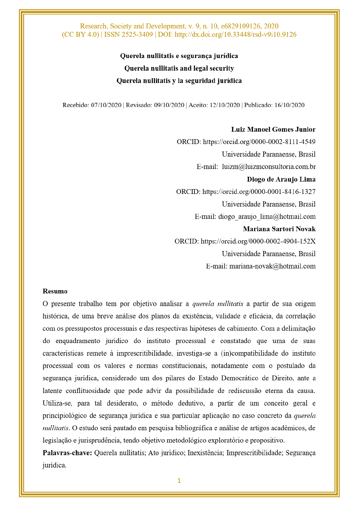 Research, Society and Development, V. 9, n. 10, e6829109126, 2020 (CC BY 4.0) | ISSN 2525-3409 | DOI: http://dx.doi.org/10.33448/rsd-v9i10.9126 Querela nullitatis e segurança jurídica Querela nullitatis and legal security Querela nullitatis y la seguridad jurídica Recebido: 07/10/2020 Revisado: 09/10/2020 Aceito: 12/10/2020 Publicado: 16/10/2020 Luiz Manoel Gomes Junior ORCID: https://orcid.org/0000-0002-8111-4549 Universidade Paranaense, Brasil E-mail: luizm@luizmconsultoria.com.br Diogo de Araujo Lima ORCID: https://orcid.org/0000-0001-8416-1327 Universidade Paranaense, Brasil E-mail: diogo_araujo_lima@hotmail.com Mariana Sartori Novak ORCID: Universidade Paranaense, Brasil E-mail: mariana-novak@hotmail.com Resumo O presente trabalho tem por objetivo analisar a querela nullitatis a partir de sua origem histórica, de uma breve análise dos planos da existência, validade e eficácia, da correlação com os pressupostos processuais e das respectivas hipóteses de cabimento. Com a delimitação do enquadramento jurídico do instituto processual e constatado que uma de suas características remete à imprescritibilidade, investiga-se a (in)compatibilidade do instituto processual com os valores e normas constitucionais, notadamente com o postulado da segurança jurídica, considerado um dos pilares do Estado Democrático de Direito, ante a latente conflituosidade que pode advir da possibilidade de rediscussão eterna da causa. Utiliza-se, para tal desiderato, o método dedutivo, a partir de um conceito geral e principiológico de segurança jurídica e sua particular aplicação no caso concreto da querela nullitatis. O estudo será pautado em pesquisa bibliográfica e análise de artigos acadêmicos, de legislação e jurisprudência, tendo objetivo metodológico exploratório e propositivo. Palavras-chave: Querela nullitatis; Ato jurídico; Inexistência; Imprescritibilidade; Segurança jurídica. 1Research, Society and Development, V. 9, n. 10, e6829109126, 2020 (CC BY 4.0) | ISSN 2525-3409 DOI: http://dx.doi.org/10.33448/rsd-v9i10.9126 Abstract The present work aims to analyze the nullitatis dispute from its historical origin, from a brief analysis of the plans of existence, validity and effectiveness, of the correlation with the procedural assumptions and the respective hypotheses of fit. With the delimitation of the legal framework of the procedural institute and found that one of its characteristics leads to imprescriptibility, we investigate the (in) compatibility of the procedural institute with the constitutional values and norms, notably with the postulate of legal security, considered one of the pillars of the Democratic State of Law, in view of the latent conflict that may arise from the possibility of eternal rediscussion of the cause. For this purpose, the deductive method is used, based on a general and principiological concept of legal certainty and its particular application in the specific case of the nullitatis dispute. The study will be based on bibliographic research and analysis of academic articles, legislation and jurisprudence, with an exploratory and propositional methodological objective. Keywords: Querela nullitatis; Legal act; Inexistence; Imprescriptibility; Legal security. Resumen El presente trabajo tiene como objetivo analizar la disputa nullitatis desde su origen histórico, a partir de un breve análisis de los planes de existencia, vigencia y efectividad, a partir de la correlación con los supuestos procesales y las respectivas hipótesis de ajuste. Con la delimitación del marco legal del instituto procesal y se constató que una de sus características conduce a la imprescriptibilidad, investigamos la (in) compatibilidad del instituto procesal con los valores y normas constitucionales, en particular con el postulado de seguridad jurídica, considerado uno de los pilares del Estado Democrático de Derecho, ante el conflicto latente que puede surgir de la posibilidad de una eterna rediscusión de la causa. Para ello se utiliza el método deductivo, basado en un concepto general y principiológico de seguridad jurídica y su aplicación particular en el caso concreto de la controversia nullitatis. El estudio se basará en la investigación bibliográfica y el análisis de artículos académicos, legislación y jurisprudencia, con un objetivo metodológico exploratorio y proposicional. Palabras clave: Querela nullitatis; Acto legal; Ausencia; Imprescriptibilidad; Seguridad jurídica. 2Research, Society and Development, V. 9, n. 10, e6829109126, 2020 (CC BY 4.0) | ISSN 2525-3409 DOI: http://dx.doi.org/10.33448/rsd-v9i10.9126 1. Introdução processo civil conviveu (e convive) com o dilema da celeridade na entrega da prestação jurisdicional e da busca por uma decisão minimamente justa e legítima. Trabalhando com a noção de tempo, o legislador criou diversos institutos e mecanismos que permitem ao processo alcançar da maneira mais célere possível seu objetivo final, qual seja, a prolação de uma sentença de mérito e a satisfação do direito perseguido. Entre eles, destacam-se: a preclusão, a coisa julgada, a forma processual em geral, o precedente judicial, pautados essencialmente no valor da segurança jurídica. No entanto, não há como se esquecer que o sistema também privilegia outro valor de igual ou superior envergadura, qual seja, o da justiça. Nesse passo, ao lado do sistema recursal, criaram-se as chamadas ações autônomas de impugnação, que, via de regra, prestam- se a corrigir vícios considerados graves no ordenamento jurídico, a ponto de permitir a revisão de questões já acobertadas pelo manto da coisa julgada. Em sendo uma das espécies de ação autônoma de impugnação, a querela nullitatis surge com instrumento voltado especificamente a questionar determinados aspectos vinculados aos pressupostos de existência da relação jurídico-processual. Por envolver pressupostos de existência, em princípio, não se fa