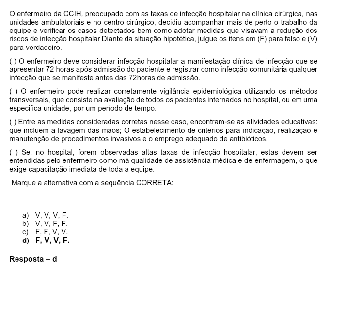 enfermeiro da CCIH, preocupado com as taxas de infecção hospitalar na clínica cirúrgica, nas unidades ambulatoriais e no centro cirúrgico, decidiu acompanhar mais de perto o trabalho da equipe e verificar os casos detectados bem como adotar medidas que visavam a redução dos riscos de infecção hospitalar Diante da situação hipotética, julgue os itens em (F) para falso e (V) para verdadeiro. ( ) enfermeiro deve considerar infecção hospitalar a manifestação clínica de infecção que se apresentar 72 horas após admissão do paciente e registrar como infecção comunitária qualquer infecção que se manifeste antes das 72horas de ( ) enfermeiro pode realizar corretamente vigilância epidemiológica utilizando os métodos transversais, que consiste na avaliação de todos os pacientes internados no hospital, ou em uma especifica unidade, por um período de tempo. ( ) Entre as medidas consideradas corretas nesse caso, encontram-se as atividades educativas: que incluem a lavagem das mãos; estabelecimento de critérios para indicação, realização e manutenção de procedimentos invasivos e emprego adequado de ( ) Se, no hospital, forem observadas altas taxas de infecção hospitalar, estas devem ser entendidas pelo enfermeiro como má qualidade de assistência médica e de enfermagem, que exige capacitação imediata de toda a equipe. Marque a alternativa com a sequência CORRETA: a) V. V. F. b) V, F. F. c) F. V. V. d) F, V, V, F. Resposta - d