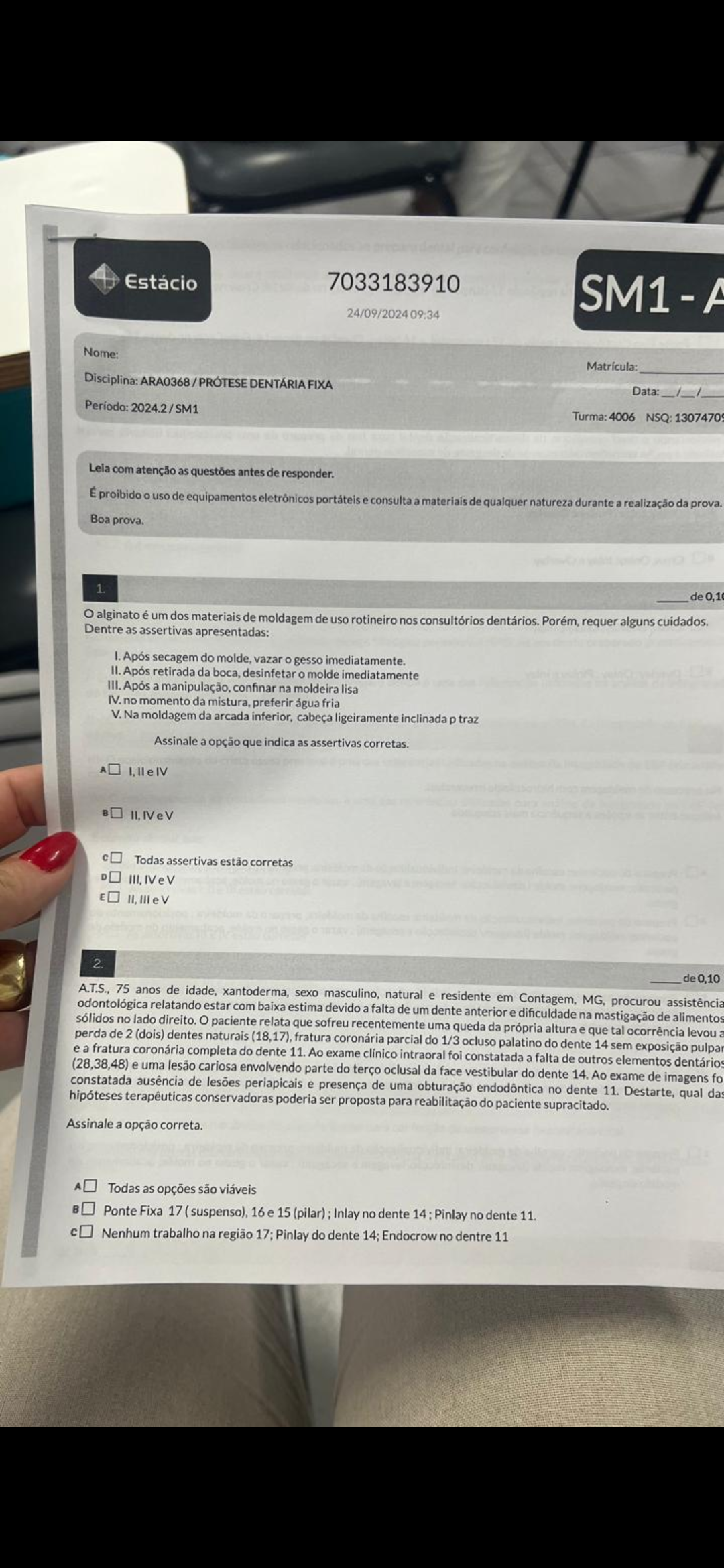 Estácio 7033183910 SM1 - A 24/09/2024 09:34 Nome: Matrícula: Disciplina: ARA0368 / PRÓTESE DENTÁRIA FIXA Data: / 2024.2/ SM1 Turma: 4006 NSQ: 13074709 Leia com atenção as questões antes de É proibido uso de equipamentos eletrônicos portáteis e consulta a materiais de qualquer natureza durante a realização da prova. Boa prova. de 0,10 1. o alginato é um dos materiais de moldagem de uso rotineiro nos consultórios dentários. Porém, requer alguns cuidados. Dentre as assertivas apresentadas: Após secagem do vazar gesso imediatamente. II. Após retirada da boca, desinfetar molde imediatamente III. Após a confinar na moldeira lisa IV. no momento da preferir água fria V. Na moldagem da arcada inferior, cabeça ligeiramente inclinada p traz Assinale a opção que indica as assertivas corretas. A e IV II, IV e V Todas assertivas estão corretas IV e V E III e V 2. de 0,10 A.T.S., 75 anos de idade, sexo masculino, natural e residente em MG, procurou assistência odontológica relatando estar com baixa estima devido a falta de um dente anterior e dificuldade na mastigação de alimentos sólidos no lado direito. paciente relata que sofreu recentemente uma queda da própria altura e que tal ocorrência levou a perda de 2 (dois) dentes naturais (18,17), fratura coronária parcial do 1/3 ocluso palatino do dente 14 sem exposição pulpar e a fratura coronária completa do dente 11. Ao exame clínico intraoral foi constatada a falta de outros elementos dentários (28,38,48) e uma lesão cariosa envolvendo parte do terço oclusal da face vestibular do dente 14. Ao exame de imagens fo constatada ausência de lesões periapicais e presença de uma obturação endodôntica no dente 11. Destarte, qual das hipóteses terapêuticas conservadoras poderia ser proposta para reabilitação do paciente supracitado. Assinale a opção correta. A Todas as opções são viáveis Ponte Fixa 17 (suspenso), 16 e 15 (pilar) Inlay no dente 14 : Pinlay no dente 11. Nenhum trabalho na região 17; Pinlay do dente 14; Endocrow no dentre 11