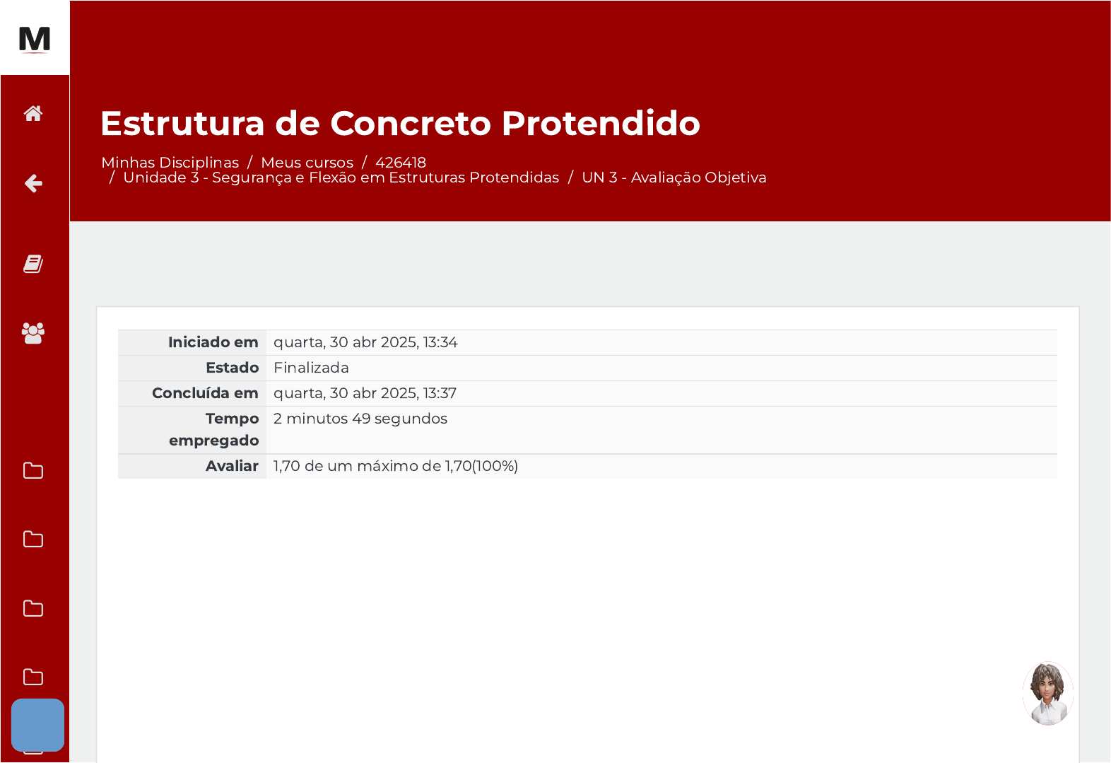 Minhas Disciplinas / Meus cursos / 426418 / Unidade 3 - Segurança e Flexão em Estruturas Protendidas / UN 3 - Avaliação Objetiva Estrutura de Concreto Protendido Iniciado em quarta, 30 abr 2025, 13:34 Estado Finalizada Concluída em quarta, 30 abr 2025, 13:37 Tempo empregado 2 minutos 49 segundos Avaliar 1,70 de um máximo de 1,70(100%) https://avap.multivix.edu.br/my/ https://avap.multivix.edu.br/course/view.php?id=33560 https://avap.multivix.edu.br/course/view.php?id=33560§ion=4 https://avap.multivix.edu.br/mod/quiz/view.php?id=1887853 https://avap.multivix.edu.br/my/ https://avap.multivix.edu.br/course/view.php?id=33560 https://avap.multivix.edu.br/user/index.php?id=33560 https://avap.multivix.edu.br/course/view.php?id=33560§ion=1 https://avap.multivix.edu.br/course/view.php?id=33560§ion=2 https://avap.multivix.edu.br/course/view.php?id=33560§ion=3 https://avap.multivix.edu.br/course/view.php?id=33560§ion=4 https://avap.multivix.edu.br/course/view.php?id=33560§ion=5 https://avap.multivix.edu.br/ https://avap.multivix.edu.br/ https://avap.multivix.edu.br/ https://avap.multivix.edu.br/ https://avap.multivix.edu.br/ https://avap.multivix.edu.br/ https://avap.multivix.edu.br/ Questão 1 Correto Atingiu 0,34 de 0,34 Na análise estrutural de vigas protendidas, uma questão que merece atenção especial é o correto posicionamento dos cabos nas zonas limites. Esses locais são críticos para garantir a eficiência da protensão e devem ser planejados com precisão para maximizar o desempenho da viga. Elaborado pelo autor, 2024. Por qual motivo os cabos de protensão são posicionados nas zonas limites de uma viga? Escolha uma opção: a. Aumentar a rigidez do concreto armado. b. Facilitar o processo de concretagem da viga. c. Reduzir o custo de materiais durante a execução. d. Diminuir o impacto de cargas dinâmicas. e. Maximizar a eficiência da protensão na estrutura. https://avap.multivix.edu.br/ https://avap.multivix.edu.br/ https://avap.multivix.edu.br/ https://avap.multivix.edu.br/ https://avap.multivix.edu.br/ https://avap.multivix.edu.br/ https://avap.multivix.edu.br/ Questão 2 Correto Atingiu 0,34 de 0,34 Na engenharia moderna, a análise dos diferentes tipos de cargas em estruturas é fundamental para garantir a segurança e a durabilidade das construções. Dentro desse contexto, é amplamente reconhecido que os carregamentos permanentes exercem um papel vital na resistência global das estruturas protendidas. Elaborado pelo autor, 2024. Qual é a definição de carregamentos permanentes em estruturas protendidas? Escolha uma opção: a. Cargas ocasionais, como ventos e impactos. b. Forças de vibração geradas por veículos. c. Sobrecargas temporárias que podem exceder o esperado. d. Tensões dinâmicas que afetam a estabilidade. e. Cargas que atuam constantemente, como o peso próprio. https://avap.multivix.edu.br/ https://avap.multivix.edu.br/ https://avap.multivix.edu.br/ https://avap.multivix.edu.br/ https://avap.multivix.edu.br/ https://avap.multivix.edu.br/ https://avap.multivix.edu.br/ Questão 3 Correto Atingiu 0,34 de 0,34 Nos dias de hoje, em estruturas complexas como viadutos ou pontes, o impacto de vibrações é um dos fatores mais críticos a ser considerado pelos engenheiros. As vibrações, geradas por atividades humanas ou ambientais, podem provocar efeitos profundos nas estruturas protendidas e, portanto, precisam ser minuciosamente analisadas. Elaborado pelo autor, 2024. Qual é o principal efeito das vibrações em estruturas protendidas? Escolha uma opção: a. Podem causar fadiga no concreto e nas armaduras. b. Facilitam o processo de protensão nas vigas. c. Melhoram a distribuição das tensões no concreto. d. Reduzem as forças de compressão nos cabos. e. Eliminam tensões localizadas no concreto. https://avap.multivix.edu.br/ https://avap.multivix.edu.br/ https://avap.multivix.edu.br/ https://avap.multivix.edu.br/ https://avap.multivix.edu.br/ https://avap.multivix.edu.br/ https://avap.multivix.edu.br/ Questão 4 Correto Atingiu 0,34 de 0,34 No mundo atual, a indústria de construção civil tem observado uma dependência cada vez maior de recursos informatizados - aliás, é inequívoco que a adoção de software em modelagem de estruturas protendidas tem uma importância claramente indiscutível para os profissionais da área. Elaborado pelo autor, 2024. Qual é o principal benefício do uso de softwares de modelagem em estruturas protendidas? Escolha uma opção: a. Diminuir o tempo de execução da obra em grandes vãos. b. Garantir que as armaduras passivas sejam eliminadas. c. Reduzir a quantidade de concreto usado nas vigas. d. Facilitar a execução do projeto sem cálculos manuais. e. Simular diferentes cenários de carga e otimizar o posicionamento dos cabos. https://avap.multivix.edu.br/ https://avap.multivix.edu.br/ https://avap.multivix.edu.br/ https://avap.multivix.edu.br/ https://avap.multivix.edu.br/ https://avap.multivix.edu.br/ https://avap.multivix.edu.br/ Questão 5 Correto Atingiu 0,34 de 0,34 Quando se trata da segurança estrutural de grandes edificações, como pontes e viadutos, engenheiros e projetistas precisam estar preparados para lidar com situações inesperadas. As sobrecargas acidentais, que podem surgir de eventos imprevistos, têm uma importância vital e demandam atenção redobrada no planejamento. Elaborado pelo autor, 2024. O que pode causar sobrecargas acidentais em estruturas protendidas? Escolha uma opção: a. Forças constantes geradas por máquinas. b. Impactos inesperados de veículos ou acúmulo de materiais. c. Redução das tensões de tração no concreto. d. Cargas permanentes, como o peso do concreto. e. Efeitos de vento e variações de temperatura. ◄ Conteúdo Online Seguir para... Conteúdo Online ► https://avap.multivix.edu.br/mod/scorm/view.php?id=1887852&forceview=1 https://avap.multivix.edu.br/mod/scorm/view.php?id=1887854&forceview=1 https://avap.multivix.edu.br/ https://a