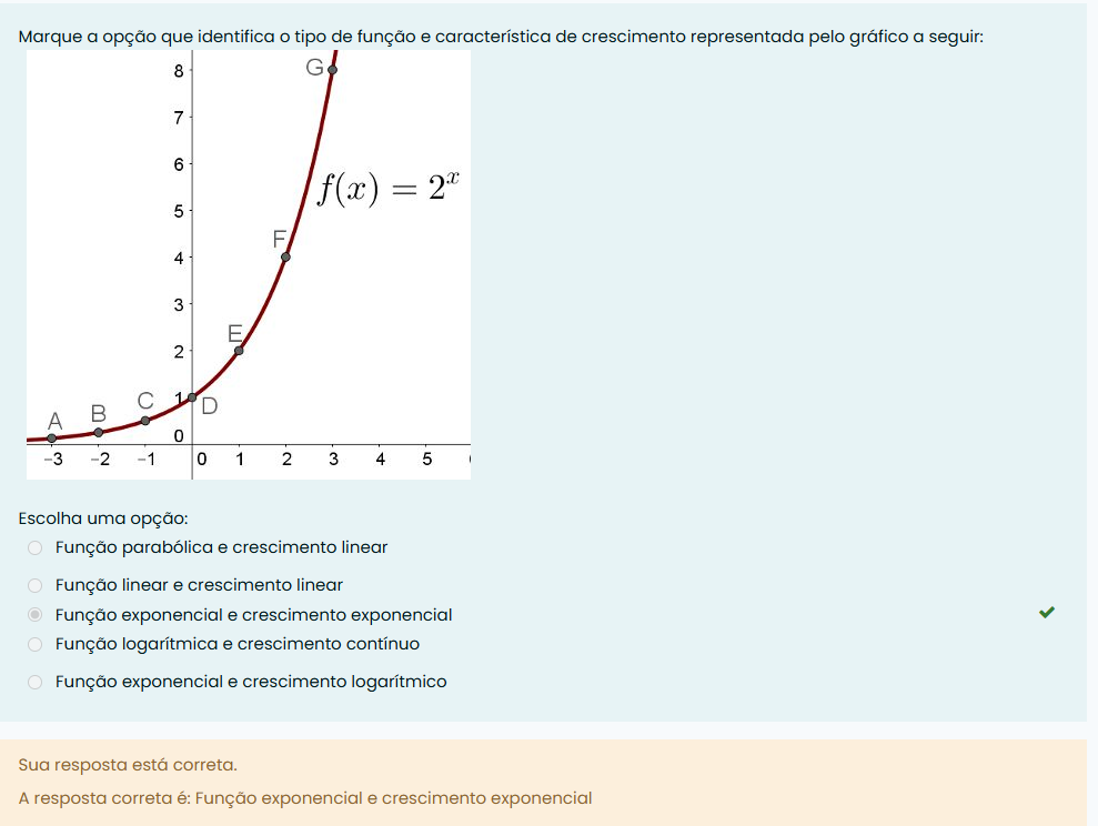 Marque a opção que identifica o tipo de função e característica de crescimento representada pelo gráfico a 8 G 7 6 5 E 4 3 E 2 C A B D 0 -3 -2 -1 0 1 2 3 4 5 Escolha uma opção: Função parabólica e crescimento linear Função linear e crescimento linear Função exponencial e crescimento exponencial Função logarítmica e crescimento contínuo Função exponencial e crescimento logarítmico Sua resposta está correta. A resposta correta é: Função exponencial e crescimento exponencial