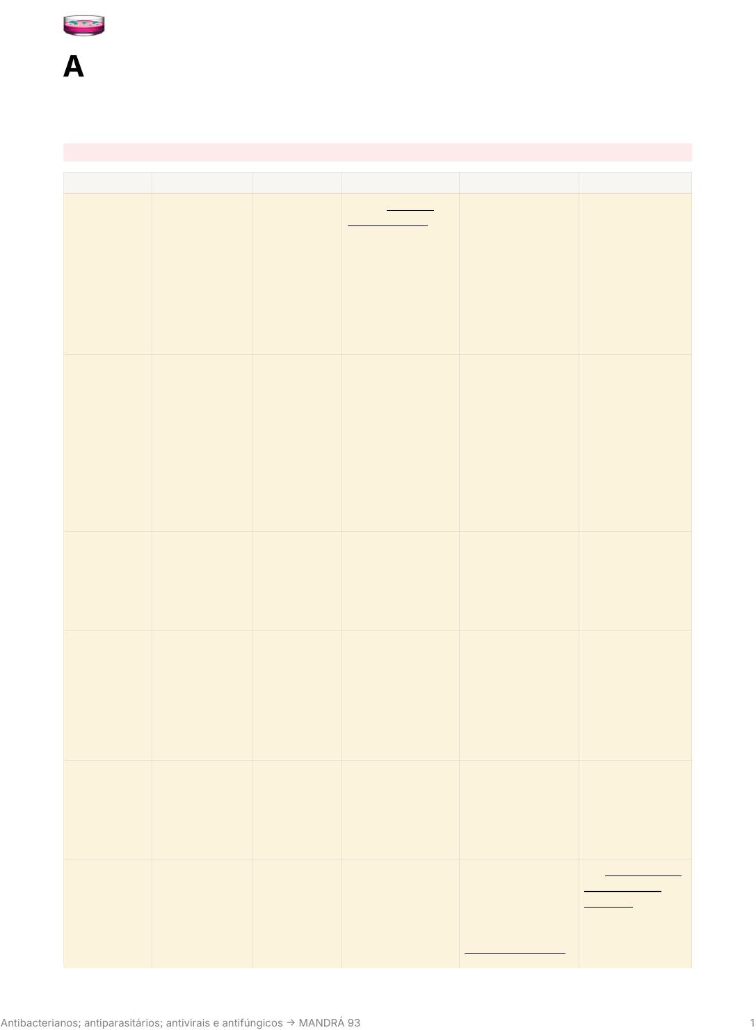 Antibacterianos; antiparasitários; antivirais e antifúngicos MANDRÁ 93 1 🧫 Antibacterianos; antiparasitários; antivirais e antifúngicos → MANDRÁ 93 ANTIBACTERIANOS FÁRMACO CLASSE MECANISMO USO EFEITOS ADVEROS PARTICULARIDADES Penicilina G benzatina beta-lactâmico (penicilina natural) ligam-se às proteínas ligadoras de penicilina PBP impedindo a transpeptidação e gerando instabilidade na parede celular da bactéria uso em infecções mais arrastadas → faringite estreptocócica, profilaxia de febre reumática e de endocardite, sífilis (não atravessa a BHE, não atua contra neurossífilis) reações de hipersensibilidade * é possível, nesses casos fazer a dessensibilização cuidado com misturas de outros medica-mentos na mesma serin-ga, pois, é degradada na presença de drogas muito ácidas ou muito alcalinas Penicilina G cristalina beta-lactâmico (penicilina natural) ‘ʼʼ infecções mais agudas mais curtas → sífilis, neurossífilis (atravessa BHE em inflamações), faringite estreptocócica, febre reumática, endocardite, pneumonia, meningite hiperssensibilidade meia vida mais curta; administração I.V Penicilina G procaína beta-lactâmico (penicilina natural) ‘ʼʼʼʼʼ pneumonia pneumocócica e sífilis administração I.M em suspensão de 12/12 horas; por isso é pouco usada na prática já que é desconfortável Penicilina V beta-lactâmico (penicilina natural) ‘ʼʼʼʼʼ muito usada para dessensibilização de benzetacil no caso de profilaxia de febre reumática; faringite estreptocócica, erisipela e profilaxia da f.r. e endocardite hiperssensibilidade Via Oral, pois é mais estável em meio ácido que as outras Ampicilina beta-lactâmico → Aminopenicilina ‘ʼʼʼʼʼ infecções respiratórias; infecção urinária; otite náusea, vômito, diarreia → diminui eficácia de métodos contraceptivos hormonais; prurido e febre V.O e I.V; presença de alimentos prejudica sua absorção; atravessa BHE Amoxicilina beta-lactâmico → Aminopenicilina ‘ʼʼʼʼʼ primeira opção para infecções de cabeça e pescoço → otite, rinossinusite, faringite; infecções urinárias geralmente é bem tolerada (em doses maiores pode gerar náusea, vômito, irritação no tgi); diminui a eficácia de tem maior tempo de meia vida que a ampicilina, tem boa absorção e boa distribuição, por isso é a primeira escolha Antibacterianos; antiparasitários; antivirais e antifúngicos MANDRÁ 93 2 FÁRMACO CLASSE MECANISMO USO EFEITOS ADVEROS PARTICULARIDADES contraceptivos hormonais *** Amoxicilina + Clavulanato; Ampicilina + Sulbactam; Piperaciclina + Tazobactam Penicilinas de Amplo Espectro → associação com inibidores de beta-lactamases amplia o espectro e atinge bactérias resistentes que produzem beta- lactamases simples essa associação não funciona em bactérias que produzam super beta-lactamase Oxacilina bactérias resistentes a penicilinases contra pneumococos, estreptococos e S. aureus (resistentes a penicilina ou sensíveis a meticilina MSSA eritema, urticária, febre, queda da Hb é contraindicada para pessoas com hipersensibilidade às penicilinas Cefalexina; Cefazolina I.V.) beta-lactâmicos - cefalosporinas de 1ª geração são menos alergênicas e tem maior resistência a beta- lactamases infecções orofaríngeas, de pele, de tecidos moles, em articulações; contra estrepto e estáfilo; usado em profilaxia cirúrgica Cefaclor e Cefuroxima V.O.) beta-lactâmicos - cefalosporinas de 2ª geração ‘ʼʼʼʼ otites, sinusites, infec. tec. moles e profilaxia cirúrgica Ceftriaxona I.V. I.M.) beta-lactâmicos - cefalosporinas de 3ª geração ‘ʼʼʼʼʼ profilaxia em pré- operatório; infecções hospitalares; Pneumonias; Meningites; Gonorreia injeção I.M. é dolorosa; nefrotoxicidade; diarreia e hipersensibilidade Cefepima I.V. ou I.M.) beta-lactâmicos - cefalosporinas de 4ª geração ‘ʼʼʼʼʼʼʼʼʼʼʼʼʼʼʼ infecções hospitalares; Pseudomonas aeruginosa Ceftarolina beta-lactâmicos - cefalosporinas de 5ª geração ‘ʼʼʼʼʼʼ possui atividade contra Staphylococcus aureus resistente a meticilina MRSA Imipenem e Meropenem I.V Carbapenens - beta=lactâmico; amplo espectro contra Gram +; Gram - ; aeróbias e anaeróbias infecções urinárias e respiratórias; infecções ginecológicas O imipenem é adm junto com a cilastatina pois essa inibe sua inativação por enzimas renais Aztreonan beta-lactâmico Monobactâmico espectro estreito → apenas contra aeróbios gram - → Pseudomonas septicemia e infecções urinárias e respiratórias hiperssensibilidade (raro) Vancomicina I.V; I.M.) glicopeptideo → prejudica síntese de peptideoglicano gram+; MRSA e colite pseudomembranosa (quando febre; erupções cutâneas; ototoxicidade; flebite * ocorre apenas devido a infusão rápida desse medicamento Antibacterianos; antiparasitários; antivirais e antifúngicos MANDRÁ 93 3 FÁRMACO CLASSE MECANISMO USO EFEITOS ADVEROS PARTICULARIDADES pois se liga aos resíduos de D- alanina terminais metronidazol não funciona) local; síndrome do homem vermelho * Teicoplanina ‘ʼ ‘ʼ ‘‘ ‘ʼ igual a vancomicina; contudo sua ação é mais prolongada Bacitracina → uso tópico devido a nefrotoxicidade ‘ʼ age contra gram positivos; indicada para lesões superficiais de pele frequentemente associada a neomicina → nebacetin Fosfomicina infecções não complicadas do trato urinário inferior Ciclosserina uso específico na tuberculose causada por Mycobacterium tuberculosis resistentes toxicidade → alterações no SNC cefaleia, tremor, psicose e convulsões Polimixinas AGEM NA MEMBRANA CELULAR incorporam-se a membrana danificando sua integridade contra gram- negativas resistentes nefro/neurotoxicidade uso tópico até década 90 uso parenteral após Sulfadiazina Sulfonamidas inibem o metabolismo do ácido fólico; impedindo a síntese de DNA da bactéria a sulfadiazina é usada para sepse associada a queimaduras contrai