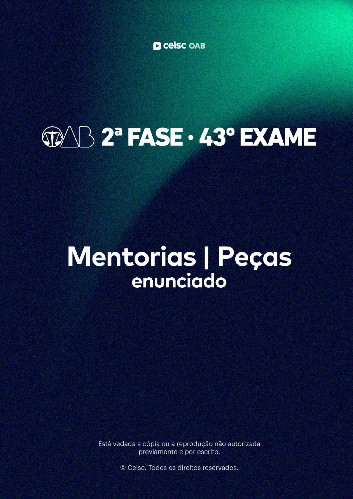 Olá, alunos! Sejam bem-vindos e-book “Como resolver as peças”. O presente e-book contém as peças que são resolvidas nas aulas de “como resolver”. A nossa sugestão é que você utilize o e-book para acompanhar a peça sendo resolvida em aula pelo professor. É muito importante que você assista as aulas de “como resolver”, pois nelas os professores explicam como desenvolver as peças, como localizar as teses nos enunciados, bem como dão dicas valiosas sobre como encontrar as palavras-chave no seu Vade Mecum (o que ajuda MUITO na hora da prova). Qualquer dúvida, estaremos à disposição para auxiliá-los através da ferramenta “Pergunte ao professor”! Bons estudos, Abraços, Equipe Ceisc. 2ª FASE OAB | PENAL | 43º EXAME Como resolver peças SUMÁRIO Queixa-Crime ......................................................................................................................................... 4 Resposta à Acusação .......................................................................................................................... 5 Memoriais ............................................................................................................................................... 7 Recurso de Apelação ........................................................................................................................... 9 Recurso em Sentido Estrito Contra Decisão de Pronúncia ....................................................... 11 Agravo em Execução ......................................................................................................................... 13 Olá, aluno(a). Este material de apoio foi organizado com base nas aulas do curso preparatório para a 2ª Fase do 43º Exame da OAB e deve ser utilizado como um roteiro para as respectivas aulas. Além disso, recomenda-se que o aluno assista as aulas acompanhado da legislação pertinente. Bons estudos, Equipe Ceisc. Atualizado em abril de 2025. Queixa-Crime Enunciado No dia 11 de abril de 2022, Ricardo foi alertado por sua secretária, via whatsapp, da data de aniversário do seu casamento, que seria no dia seguinte, ou seja, no dia 12 de abril, tendo, no entanto, visualizado a mensagem somente nessa data. Após visualizar a mensagem, sabendo que sua esposa ficaria muito decepcionada se não recebesse qualquer presente alusivo à data, Ricardo se desloca até uma famosa loja de grife da cidade de Porto Alegre/RS, localizada no Shopping da Barra, com a finalidade de adquirir uma bolsa LV (Louis Vuitton). Passados alguns minutos sem ser atendido, devido ao grande movimento da loja, Ricardo, em tom alterado, dirigiu-se até Mauro, gerente da loja, e afirmou, na presença de vários clientes, dentre eles Arnaldo, Débora e Letícia, que ele era incompetente e não reunia qualquer condição para gerenciar a famosa loja. Disse, ainda, na mesma ocasião, que já o conhecia de outra loja da qual era cliente, e, com a intenção de macular a imagem do gerente, acrescentou que Mauro havia sido demitido da referida loja, porque prestava péssimo atendimento aos clientes, principalmente quando se encontrava sob o efeito de álcool, acrescentando que no dia anterior à sua demissão foi encontrado desacordado no banheiro da loja, completamente embriagado. Mauro, extremamente irritado e envergonhado, ficou sem reação, não conseguindo disfarçar o constrangimento. Passados alguns dias da data dos fatos, Mauro procurou seu escritório de advocacia e narrou a conduta de Ricardo que o deixou envergonhado, pedindo providências na seara criminal. Você, na qualidade de advogado(a) de Mauro, deve assisti-lo. Informa-se que a cidade de Porto Alegre, no Estado do Rio Grande do Sul, possui Varas Criminais e Juizados Especiais Criminais. Com base somente nas informações de que dispõe e nas que podem ser inferidas pelo caso concreto acima, redija a peça cabível, sustentando, para tanto, as teses jurídicas pertinentes, datando-a, ainda, no último dia do prazo. (Valor: 5,00) Obs.: A peça deve abranger todos os fundamentos de Direito que possam ser utilizados para dar respaldo à pretensão. A simples menção ou transcrição do dispositivo legal não confere pontuação. 2ª Fase Penal | 43º Exame de Ordem 5 Resposta à Acusação PEÇA PRÁTICO-PROFISSIONAL – 36º EXAME Enunciado No dia 31 de dezembro de 2019, Matheus, nascido em 10 de fevereiro de 2000, compareceu a uma festa de Ano Novo, em Vitória, Espírito Santo, juntamente com seus amigos. Animados com o evento, os amigos de Matheus ingeriram grande quantidade de bebida alcoólica, enquanto Matheus permaneceu bebendo somente água tônica, pois sabia que tinha intolerância ao álcool e que qualquer pequena quantidade de bebida alcoólica já o colocaria em situação de embriaguez. Ocorre que, em determinado momento, solicitou água tônica ao funcionário do bar, que, contudo, em erro, entregou a Matheus o drink “gin tônica”, que é feito com uma dose de gin misturada com água tônica. Matheus, com sede, deu um grande gole na bebida, vindo a ficar completamente embriagado, em razão da intolerância ao álcool. Sentindo-se mal, quando deixava o local dos fatos, Matheus é surpreendido com a presença de Caio, 25 anos, com quem já discutira em diversas oportunidades em jogos de futebol. Caio, ao verificar a situação de completa embriaguez de seu rival, começa a rir, momento em que Matheus usa a garrafa de refrigerante, de vidro, que estava em suas mãos, para desferir um golpe na cabeça de Caio. Caio é imediatamente encaminhado para o hospital e, após atendimento médico, comparece à Delegacia, narra o ocorrido e informa que teve de levar 15 pontos na cabeça, razão pela qual ficaria incapacitado de trabalhar por 45 dias. Em razão da dor que sentia na cabeça, deixou de comparecer, naquele momento, para a realização de exame de corpo de delito, informando, ainda, que não teve acesso ao Boletim de At