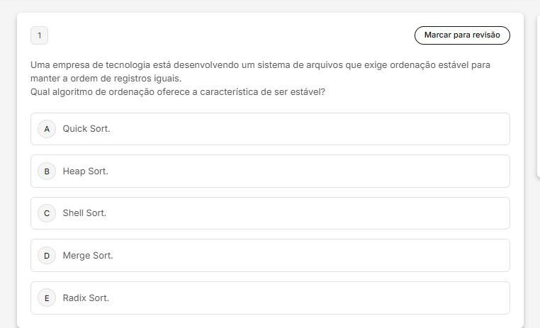 1 Marcar para revisão Uma empresa de tecnologia está desenvolvendo um sistema de arquivos que exige ordenação estável para manter a ordem de registros iguais. Qual algoritmo de ordenação oferece a característica de ser estável? A Quick Sort. B Heap Sort. C Shell Sort. D Merge Sort. E Radix Sort.