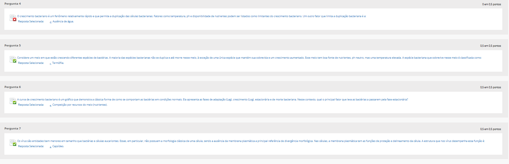 Pergunta 4 0 em 0.5 pontos o crescimento bacteriano é um fenômeno relativamente rápido que permite duplicação das células Fatores como temperatura, ph disponibilidade de nutrientes podem ser listados como limitantes do crescimento Um outro fator que limita a duplicação bacteriana éa Resposta d. Ausência de água Pergunta 5 0.5 em 0.5 pontos Considere um meio em que estão crescendo espécies de A maioria das espécies bacterianas não se duplica até morre nesse à exceção de uma única espécie que mantém sua sobrevida e um crescimento Esse meio tem boa fonte de ph mas uma temperatura A espécie bacteriana que sobrevive nesse meio é classificada como: Resposta Selecionada Pergunta 6 0.5 em 0.5 pontos A curva de crescimento bacteriano é um gráfico que demonstra a forma de como se comportam as bactérias em condições normais Ela apresenta as fases de adaptação crescimento (Log) de morte bacteriana Nesse qual o principal fator que leva as bactérias a passarem pela fase Resposta Selecionada: Competição por recursos do meio Pergunta 7 0.5 em 0.5 pontos Os virus são entidades bem menores em tamanho que bactérias e células em e delineamento da A estrutura que nos virus desempenha essa função é Resposta Selecionada a