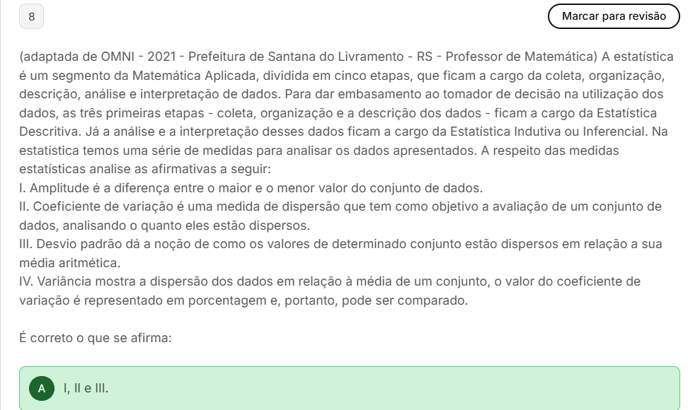 8 Marcar para revisão (adaptada de OMNI - 2021 - Prefeitura de Santana do Livramento - RS - Professor de Matemática) A estatística é um segmento da Matemática Aplicada, dividida em cinco etapas, que ficam a cargo da coleta, organização, descrição, análise e interpretação de dados. Para dar embasamento ao tomador de decisão na utilização dos dados, as três primeiras etapas coleta, organização e a descrição dos dados ficam a cargo da Estatística Descritiva. Já a análise e a interpretação desses dados ficam a cargo da Estatística Indutiva ou Inferencial. Na estatística temos uma série de medidas para analisar os dados apresentados. A respeito das medidas estatísticas analise as afirmativas a seguir: I. Amplitude é a diferença entre maior e menor valor do conjunto de dados. II. Coeficiente de variação é uma medida de dispersão que tem como objetivo a avaliação de um conjunto de dados, analisando quanto eles estão dispersos. III. Desvio padrão dá a noção de como os valores de determinado conjunto estão dispersos em relação a sua média aritmética. IV. Variância mostra a dispersão dos dados em relação à média de um conjunto, valor do coeficiente de variação é representado em porcentagem e, portanto, pode ser comparado. É correto que se afirma: A I, e III.