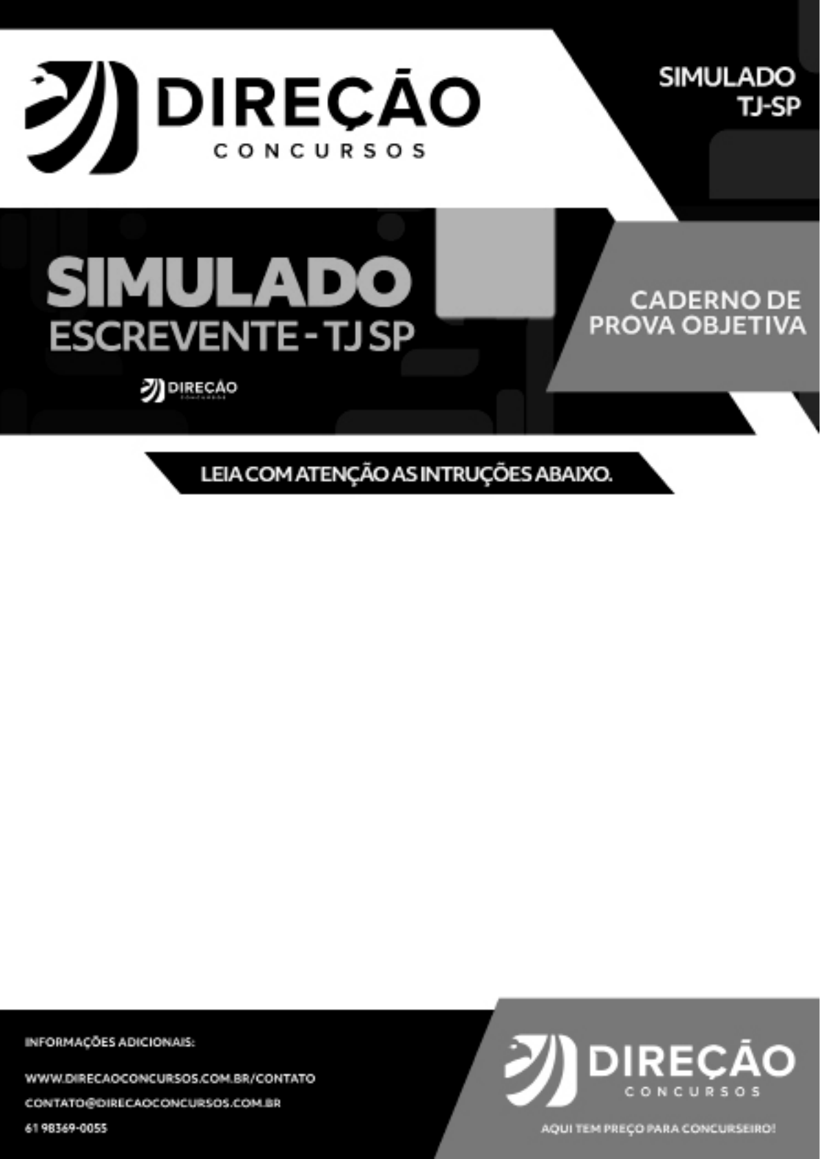 1) O simulado consistirá em 100 questões, valendo a mesma quantidade de pontos e seguindo o formato múltipla escolha, com 5 opções. As perguntas serão distribuídas entre as matérias de Língua Portuguesa , Direito Penal , Direito Processual Penal , Direito Processual Civil , Direito Constitucional , Direito Administrativo, Normas da Corregedoria, Atualidades, Matemática, Informática e Raciocínio Lógico. 2) O prazo para a realização do simulado será das 9h do dia 05/07/2024, sexta-feira às 12h do dia 07/07/ 2024, domingo. 3) As respostas deverão ser submetidas por meio do formulário no seguinte link: https://forms.gle/QMYJxf 9LRuBVmkGZ7. 4) Respostas deixadas em branco ou incorretas não terão impacto negativo na pontuação , ou seja, não anularão as questões respondidas corretamente. 5) Das premiações: - 1º Colocado: 50% de desconto em próximas compras; - 2º Colocado: 40% de desconto em próximas compras; e - 3º Colocado: 30% de desconto em próximas compras. *Exceto Mentorias https://forms.gle/QMYJxf9LRuBVmkGZ7 https://forms.gle/QMYJxf9LRuBVmkGZ7 https://assinaturas.direcaoconcursos.com.br/tjsp/?utm_source=simulado_tjsp Língua Portuguesa QUESTÃO 01 A principal mensagem do texto relacionada à automação é a de que ela A) diminui a oferta de empregos. B) gera redução dos salários reais. C) produz disrupção tecnológica. D) induz a formação de novos tipos de ocupação. E) agrava a diferença entre países. QUESTÃO 02 Sem prejuízo da correção gramatical e do sentido original do texto, a forma verbal “haverá” (linha 2) poderia ser substituída por A) existirá B) vai haver C) poderão haver D) haverá de existir E) terá Texto para as questões 03 e 04 Só há uma relação fecunda entre o artista e a vida popular: a relação amorosa. Sem um enraizamento profundo, sem uma empatia sincera e prolongada, o escritor, homem de cultura universitária, e pertencente à linguagem reduto- ra dominante, se enredará nas malhas do preconceito, ou mitigará irracionalmente tudo que lhe pareça popular, ou ainda projetará pesadamente as suas próprias angústias e inibições na cultura do outro, ou, enfim, interpretará de modo fatalmente etnocêntrico e colonizador os modos de viver do primitivo, do rústico, do suburbano (BOSI apud PINHEIRO; LÚCIO, 2001, p. 79). QUESTÃO 03 Segundo o texto, um dos fatores que podem resultar na desvalorização da cultura popular por parte do artista é o(a): A) sua formação cultural elitista . B) seu envolvimento profundo com valores rústicos e pri- mitivos. C) sua visão preconceituosa acerca da cultura universi- tária. D) sua origem predominantemente suburbana. seu relacionamento amoroso com o cotidiano. QUESTÃO 04 Cada uma das opções a seguir apresenta uma proposta de reescrita para o seguinte trecho do texto: “Sem um enrai- zamento profundo, sem uma empatia sincera e prolonga- da...”. Assinale a opção em que a proposta de reescrita apresentada mantém os sentidos originais e a correção gramatical. A) Como não há um enraizamento profundo, uma empa- tia sincera e prolongada... B) Caso não houvesse um enraizamento profundo, uma empatia sincera e prolongada... C) Embora não exista um enraizamento profundo, uma empatia sincera e prolongada... D) A menos que exista um enraizamento profundo, uma empatia sincera e prolongada... E) Se existissem um enraizamento profundo, uma empa- tia sincera e prolongada... Texto para as questões 05 e 06 A estabilidade econômica e a populari- zação do mercado de ações têm permitido à população brasileira planejar com mais afinco, coragem e discipli- na suas aplicações financeiras. Homens e mulheres de todas as classes sociais têm buscado alternativas não só para realizarem aplicações financeiras, mas também para se tornarem futuros milionários. Fundos de renda fixa, dólares, ações e clubes de investimentos são hoje gran- des e boas opções para se sonhar com o primeiro milhão. Tais opções não saem dos papos das rodas de amigos, de familiares e de colegas de escritório. Mas todos sabemos que, antes de iniciar os investimentos, é imprescindível que algumas pondera- ções sejam feitas. No mercado de ações, por exemplo, ter ganhos em curto prazo não deve ser a expectativa primei- ra do investidor uma vez que o mercado é variável, osci- lante. Aconselha-se que a pessoa não invista todos os re- cursos disponíveis, nem dependa do recurso aplicado em ações para gastos imediatos. Ou seja: o melhor é aplicar os recursos extras e esquecê-los... Melhor ainda... Pen- sá-los em investimentos de médio e longo prazos, mas, claro, atentando-se para eventuais desvalorizações das ações. O fato é que a pessoa que aplica recursos no mer- cado de ações não pode, em hipótese alguma, depender desse dinheiro para pagar as contas do dia a dia ou possí- veis gastos emergenciais. Todos os analistas aconselham que esse investimento seja pensado como uma aplicação de longo prazo. Muitas pessoas, inclusive, denominam a bolsa como um jogo, uma aposta, em que se pode perder ou ganhar, ou mesmo tornar-se um azarão. São várias as formas de se investir no mercado de ações. O clube de investimentos, por exem- plo, tem, segundo a Bovespa, garantido aos futuros inves- tidores certas facilidades, como a possibilidade de dilui- ção dos custos. São várias as vantagens de se filiar a um clube de investimentos. Uma delas é o fato de o investidor poder comprar ações pagando menos (i.e., pagando taxas menores) e correndo menos riscos diante das oscilações do mercado. Além de contar com uma maior acessibili- dade, o investidor tem mais tranquilidade, participação direta e custos mais baixos. Geralmente, quem participa dessa modalidade é aquele investidor que não gosta de se arriscar muito. Só para se ter uma ideia, em 1996 eram 154 clubes registrados na Bovespa; já em 2006, foram contabilizados 1631 clubes. Como os riscos são compartil