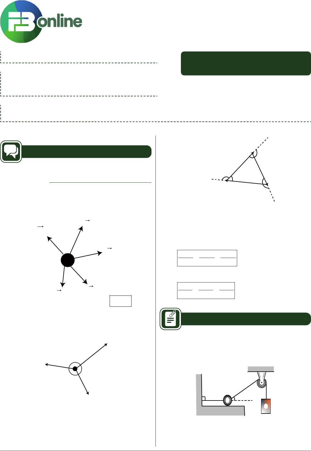 FÍSICA F B O N L I N E . C O M . B R ////////////////// Professor(a): Tadeu Carvalho assunto: esTáTiCa do PonTo MaTerial frente: FísiCa i 018.127 - 143241/19 AULAS 66 e 67 EAD – ITA/IME Resumo Teórico Estática do ponto material Para uma partícula em repouso sujeito à ação de várias forças (veja figura) permanecer em repouso, ou seja, estar em equilíbrio, é necessário e suficiente que: Fn F 1 F 2 F 3F 4 → =∑ F 0 Vamos agora estudar uma situação particular em que uma partícula está em equilíbrio sob a ação de 3 forças: F F F → → → 1 2 3, , , F1 F2 F3 θ3 θ1 θ2 Devemos ter F F F → → → + + =1 2 3 0, então formamos um triângulo F1 F3 θ2 θ3 θ1 α1 α2 α3 F2 Note que: a 1 + q 1 = 180º → sen a 1 = sen q 1 a 2 + q 2 = 180º → sen a 2 = sen q 2 a 3 + q 3 = 180º → sen a 3 = sen q 3 Pela lei dos senos, podemos escrever: F sen F sen F sen 1 1 2 2 3 3α α α = = ou F sen F sen F sen 1 1 2 2 3 3θ θ θ = = Exercícios 01. Uma esfera de aço (E) pesando 200 N encontra-se apoiada em um plano horizontal e amarrada a uma parede vertical por meio de um fio ideal: E 30º C Um cilindro (C) de peso 100 N é ligado a um fio ideal, que passa por uma polia também ideal e vai prender-se à esfera. Calcule: A) a intensidade da força de reação normal do plano horizontal sobre a esfera. 2F B O N L I N E . C O M . B R ////////////////// Módulo de estudo 018.127 - 143241/19 B) a intensidade da força de tração no fio que liga a esfera à parede vertical. C) a intensidade do peso que o cilindro deveria ter para que a esfera ficasse na iminência de sair do plano. 02. Um semáforo pesando 100 N está pendurado por três cabos conforme ilustra a figura. Os cabos 1 e 2 fazem um ângulo a e b com a horizontal, respectivamente. 1 2 3 α β A) Em qual situação as tensões nos fios 1 e 2 serão iguais? B) Considerando o caso em que a = 30º e b = 60º, determine as tensões nos cabos 1, 2 e 3. Dados: sen 30º = 1/2 e sen 60º = 3/2 03. (Aman-RJ) Veja a figura a seguir. A tração máxima que a corda superior pode suportar é de 400 2 N e a compressão máxima que a escora pode aguentar é de 600 2 N. A corda vertical é suficientemente resistente para tolerar qualquer peso envolvido no problema. 45º 45º P → O maior peso de um corpo em repouso que pode ser sustentado pela estrutura da figura, considerando desprezível o peso da escora, é: A) 800 N B) 1000 N C) 200 N D) 600 N E) 400 N 04. O esquema mostra o sistema de freios dianteiros de uma bicicleta no momento em que o ciclista imprime força máxima ao cabo de aço vertical, mantendo o segundo cabo tenso e em equilíbrio de acordo com o ângulo q de valor 145º. Se o ângulo q for reajustado para 125º, as forças horizontais sobre os parafusos P 1 e P 2 que prendem o segundo cabo de aço terão seus valores aumentados em: A) 25% B) 50% C) 75% D) 100% E) 125% 05. Três cilindros iguais, A, B e C, cada um com massa M e raio R, são mantidos empilhados, com seus eixos horizontais, por meio de muretas laterais verticais, como mostra a figura a seguir. Desprezando qualquer efeito de atrito, determine, em função de M e g: A B C A) O módulo da força FAB que o cilindro A exerce sobre o cilindro B. B) O módulo da força F1 que o piso (x) exerce sobre o cilindro B. C) O módulo da força F2 que a mureta (y) exerce sobre o cilindro C. 3 F B O N L I N E . C O M . B R ////////////////// 018.127 - 143241/19 Módulo de estudo 06. Duas esferas A e B de mesma massa e raio são colocadas no interior de uma caixa como mostra a figura a seguir. A força exercida pelo fundo da caixa sobre a esfera A tem intensidade de 30 N. O peso de cada esfera é: A B A) 25 N B) 20 N C) 15 N D) 10 N E) 5 N 07. Em um ensaio físico, desenvolvido com o objetivo de se estudar a resistência à tração de um fio, montou-se o conjunto ilustrado a seguir. Desprezando o atrito, bem como as inércias das polias, do dinamômetro (D) e dos fios, considerados inextensíveis, a indicação do dinamômetro, com o sistema em equilíbrio, é Dados: g = 10 m/s2 sen a = 0,6 cos a = 0,8 A) 1,6 N B) 1,8 N C) 2,0 N D) 16 N E) 18 N 08. Um peso W está suspenso por cordas de massas desprezíveis, como mostra a figura a seguir. T2 T3 T1 W θ ϕ Em módulo, as tensões T2 e T3 valem, respectivamente: A) W cotg q, W cosec q B) W/sen q, W sen j C) W/(tg j cos q + sen q D) W/(cos(q + j), W/sen(q + sen j) E) W ⋅ sen q, W ⋅ sen j) 09. No arranjo mostrado na figura com duas polias, o fio inextensível e sem peso sustenta a massa M e, também, simetricamente, as duas massas m, em equilíbrio estático. mm M Q 2 L P h Desprezando o atrito de qualquer natureza, o valor h da distância entre os pontos P e Q vale A) ML/ 4 m M2 2 B) L C) ML/ M2 – 4 2m D) mL/ 4 2 2m M– E) ML/ 2 2 2m M– 10. Uma das modalidades de ginástica é a das argolas. Nessa modalidade, os músculos mais solicitados são os dos braços, que suportam as cargas horizontais, e os da região dorsal, que suportam os esforços verticais. d H L 4F B O N L I N E . C O M . B R ////////////////// Módulo de estudo 018.127 - 143241/19 Considerando um atleta cuja massa é de 60 kg e sendo os comprimentos indicados na figura H = 3,0 m; L = 1,5 m e d = 0,5 m, responda: A) Qual a tensão em cada corda quando o atleta se encontra pendurado no início do exercício com os braços na vertical? B) Quando o atleta abra os braços na horizontal, qual a componente horizontal da tensão em cada corda? 11. Observando as figuras a seguir, vemos que os corpos A e B que equilibram a barra de peso desprezível, são também utilizados para equilibrar a talha exponencial de polias e fios ideais. A relação entre as distâncias x e y é: B A BA x y A) x/y = 1/3 B) x/y = 1/4 C) x/y = 1/8 D) x/y = 1/12 E) x/y = 1/16 12. A figura a seguir mostra dois blocos de massas m = 2,5 kg e M = 6,5 kg, ligados por um fio que passa sem atrito por uma roldana. Despreze as massas do fio e da roldana e suponha que a aceleração da g