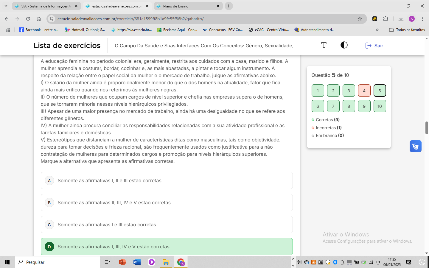 SIA Sistema de Informações A Plano de Ensino + Facebook entre Hotmail, Outlook, S... Reclame Aqui Con... Concursos FGV Co.. eCAC Centro Autoatendimento d.. Todos os favoritos Lista de exercícios Campo Da Saúde e Suas Interfaces Com Os Conceitos: Gênero, Sexualidade,.. T Sair A educação feminina no período colonial era, geralmente, restrita aos cuidados com a casa, marido e filhos. A mulher aprendia a costurar, bordar, cozinhar e, as mais abastadas, a pintar e tocar algum instrumento. A respeito da relação entre papel social da mulher e mercado de trabalho, julgue as afirmativas abaixo. Questão 5 de 10 I) salário da mulher ainda é proporcionalmente menor do que dos homens na atualidade, fator que fica ainda mais crítico quando nos referimos às mulheres negras. 1 2 3 4 5 II) número de mulheres que ocupam cargos de nível superior e chefia nas empresas supera o de homens, que se tornaram minoria nesses níveis hierárquicos privilegiados. 6 7 8 9 10 III) Apesar de uma maior presença no mercado de trabalho, ainda há uma desigualdade no que se refere aos diferentes gêneros. Corretas (9) IV) A mulher ainda procura conciliar as responsabilidades relacionadas com a sua atividade profissional e as Incorretas (1) tarefas familiares e Em branco (0) V) Estereótipos que distanciam a mulher de características ditas como masculinas, tais como objetividade, dureza para tomar decisões e frieza racional, são frequentemente usados como justificativa para a não contratação de mulheres para determinados cargos e promoção para níveis hierárquicos superiores. Marque a alternativa que apresenta as afirmativas corretas. A Somente as afirmativas I, II e III estão corretas B Somente as afirmativas II, III, IV e V estão corretas. C Somente as afirmativas e III estão corretas Ativar Windows Acesse Configurações para ativar D Somente as afirmativas I, III, IV e V estão corretas - ^ 11:35 Pesquisar D 06/05/2025