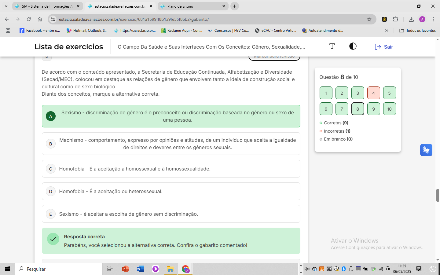 SIA Sistema de Informações A estacio.saladeavaliacoes.com.br Plano de Ensino + - A Facebook entre Hotmail, Outlook, S... https://sia.estacio.br. Reclame Aqui Con... Concursos FGV Co.. eCAC Centro Virtu.. Autoatendimento d... Todos os favoritos Lista de exercícios Campo Da Saúde e Suas Interfaces Com Os Conceitos: Gênero, T Sair De acordo com conteúdo apresentado, a Secretaria de Educação Continuada, Alfabetização e Diversidade (Secad/MEC), colocou em destaque as relações de gênero que envolvem tanto a ideia de construção social e Questão 8 de 10 cultural como de sexo biológico. Diante dos conceitos, marque a alternativa correta. 1 2 3 4 5 6 7 8 9 10 Sexismo - discriminação de gênero é preconceito ou discriminação baseada no gênero ou sexo de A uma pessoa. Corretas (9) Incorretas (1) Machismo comportamento, expresso por opiniões e atitudes, de um indivíduo que aceita a igualdade Em branco (0) B de direitos e deveres entre os gêneros sexuais. C Homofobia - É a aceitação a homossexual e à homossexualidade. D Homofobia - É a aceitação ou heterossexual. E Sexismo é aceitar a escolha de gênero sem discriminação. Resposta correta Ativar Windows Parabéns, você selecionou a alternativa correta. Confira gabarito comentado! Acesse Configurações para ativar ^ 11:35 Pesquisar D 06/05/2025